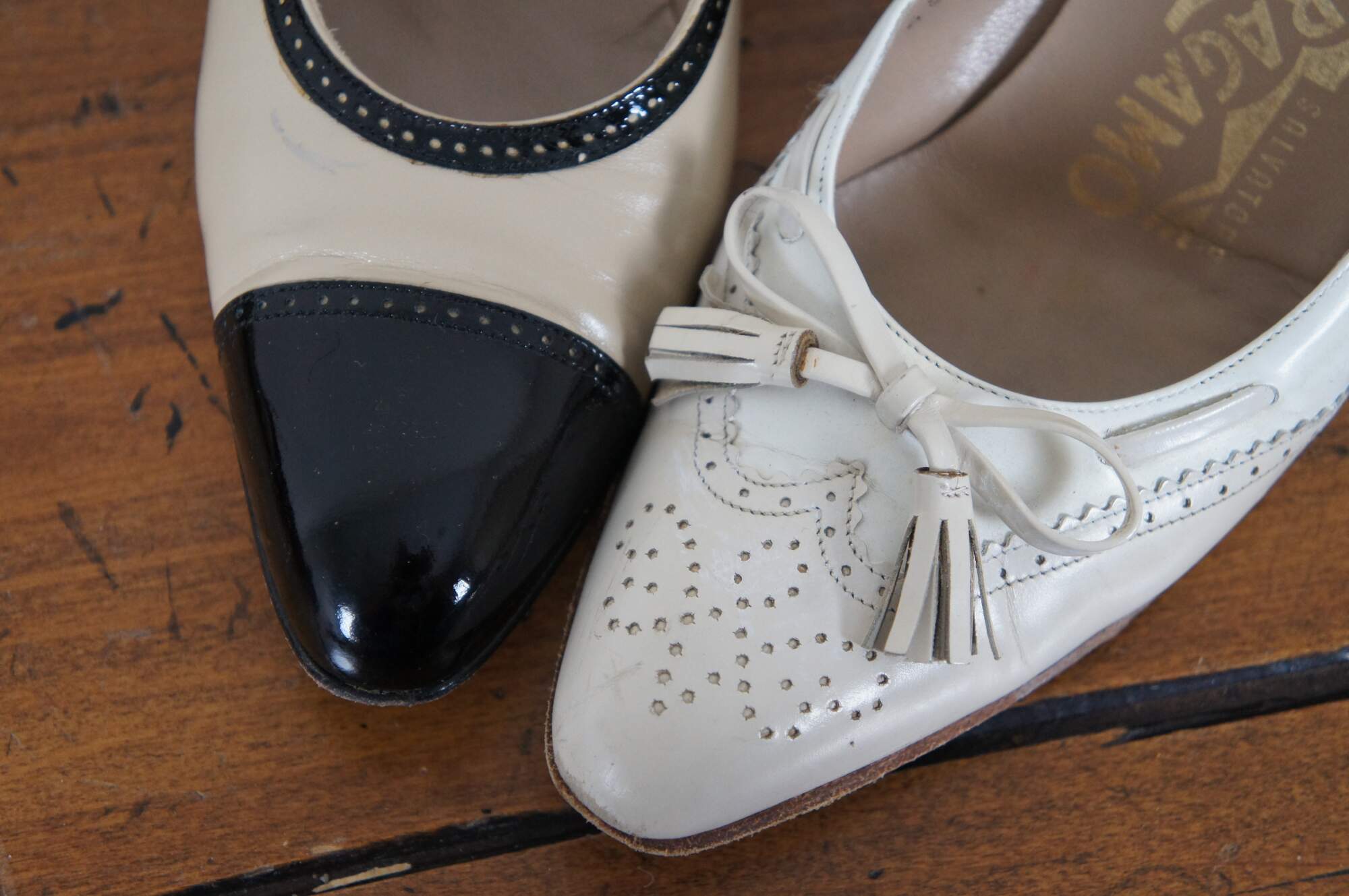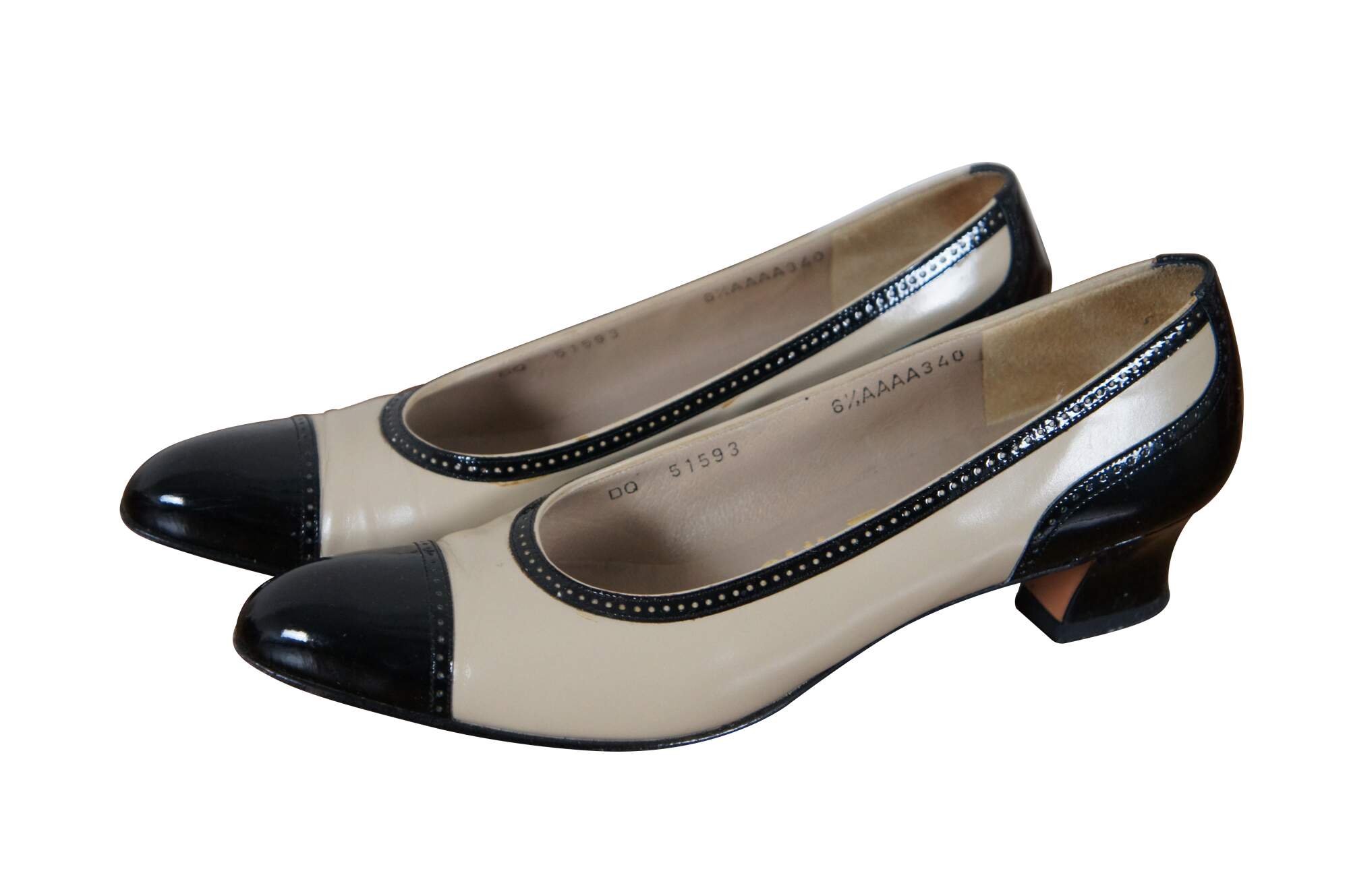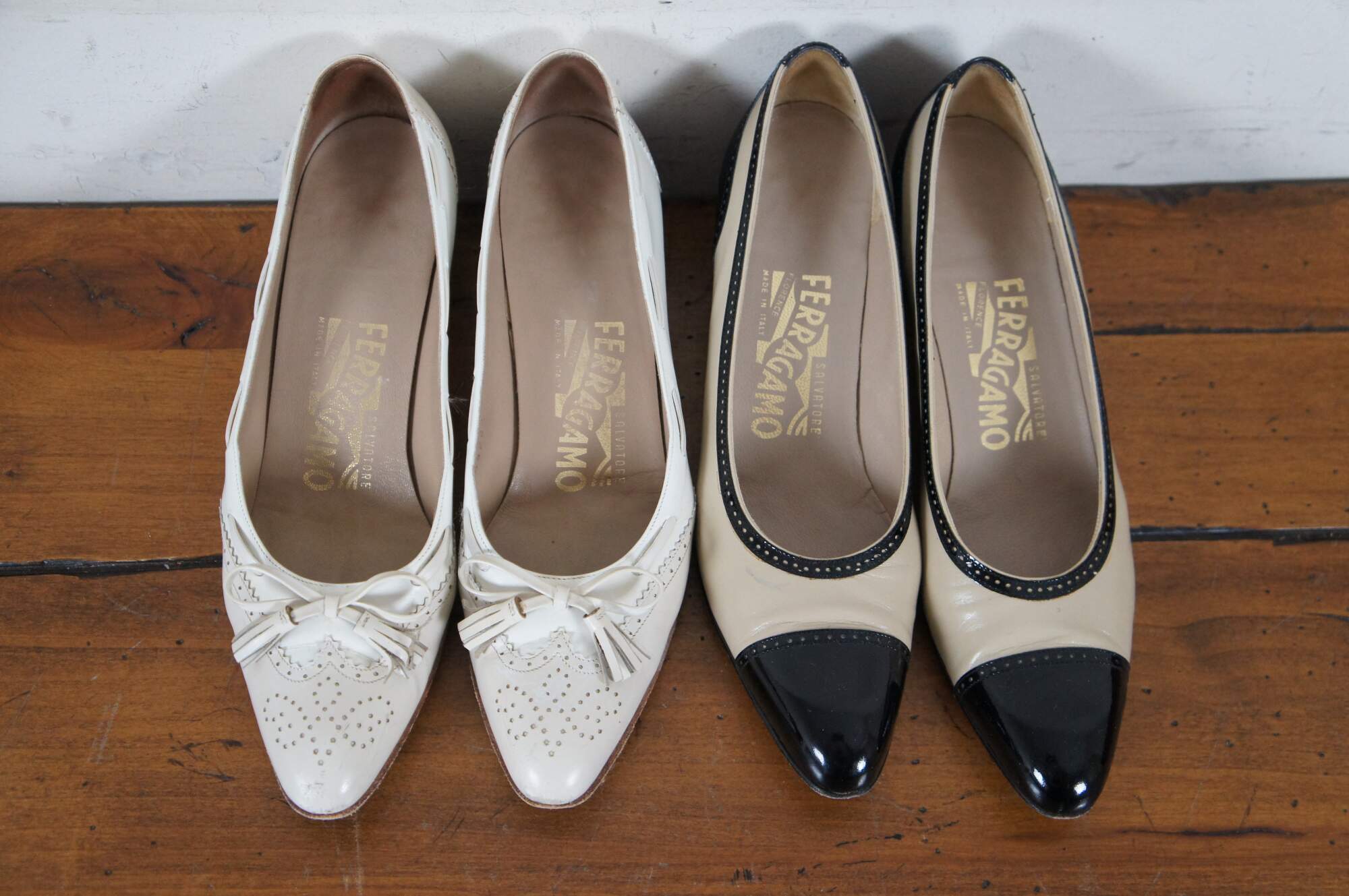 Two vintage pairs of Salvatore Ferragamo shoes / heels in zucchero white / bone and nudo black / beige patent calf leather, one with brouge and one with cap toe. Size 6.5 AAAA. Made in Italy. MSRP $245 each. Palanca, Madison.