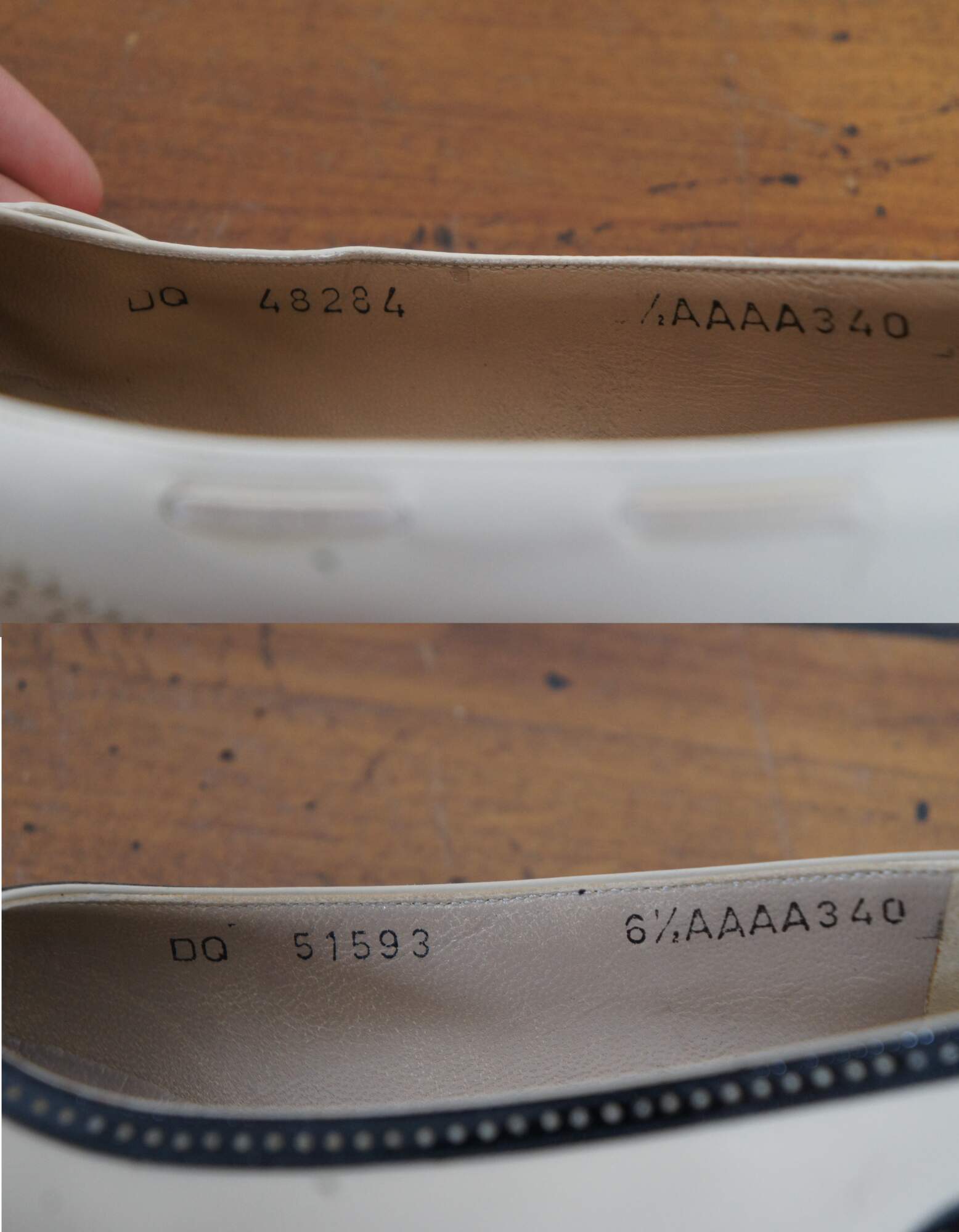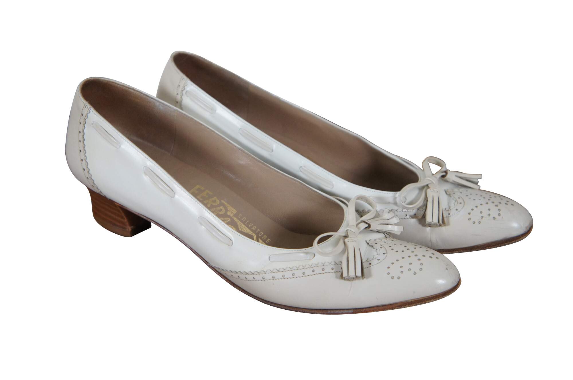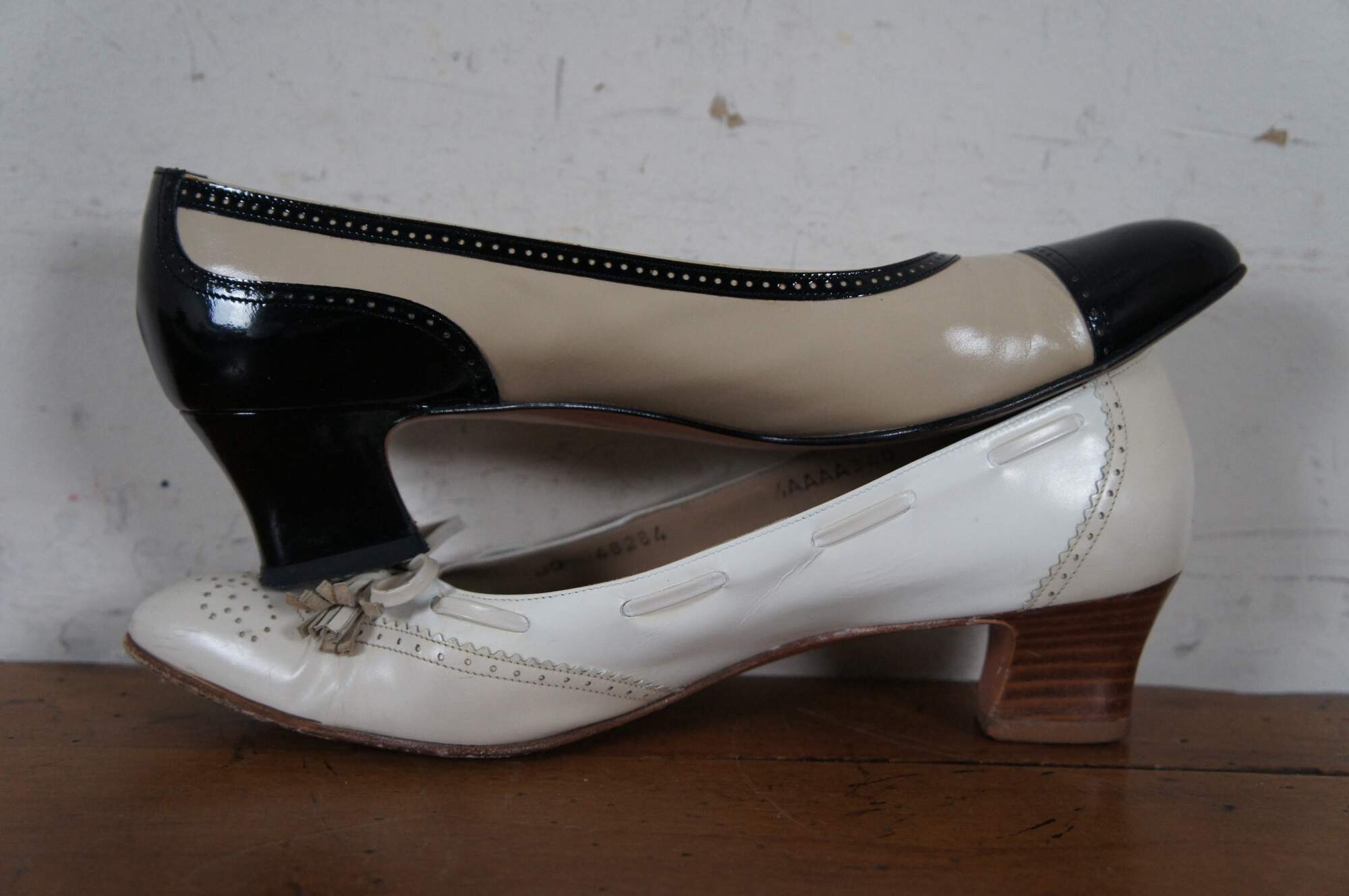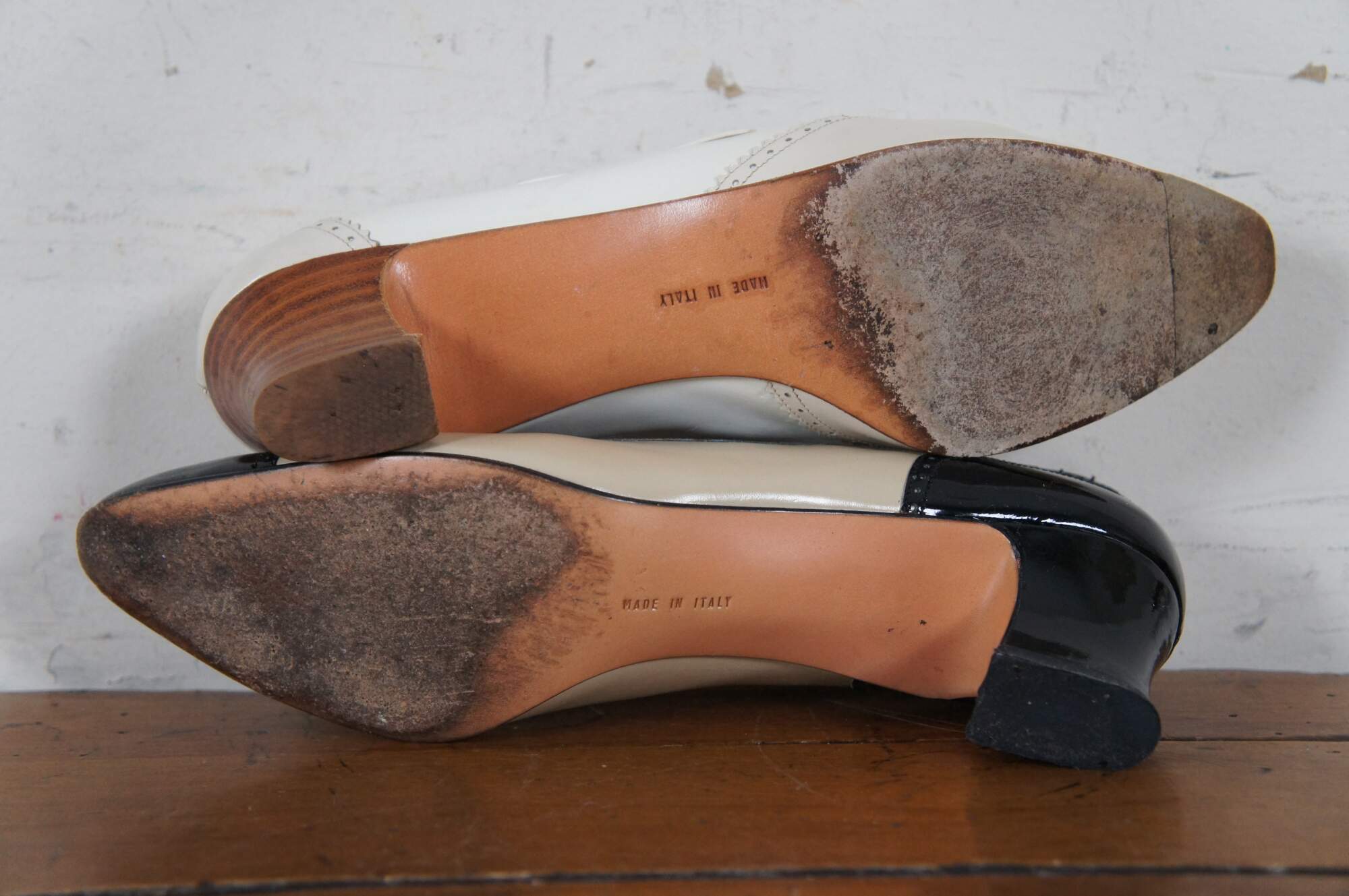 Two vintage pairs of Salvatore Ferragamo shoes / heels in zucchero white / bone and nudo black / beige patent calf leather, one with brouge and one with cap toe. Size 6.5 AAAA. Made in Italy. MSRP $245 each. Palanca, Madison.