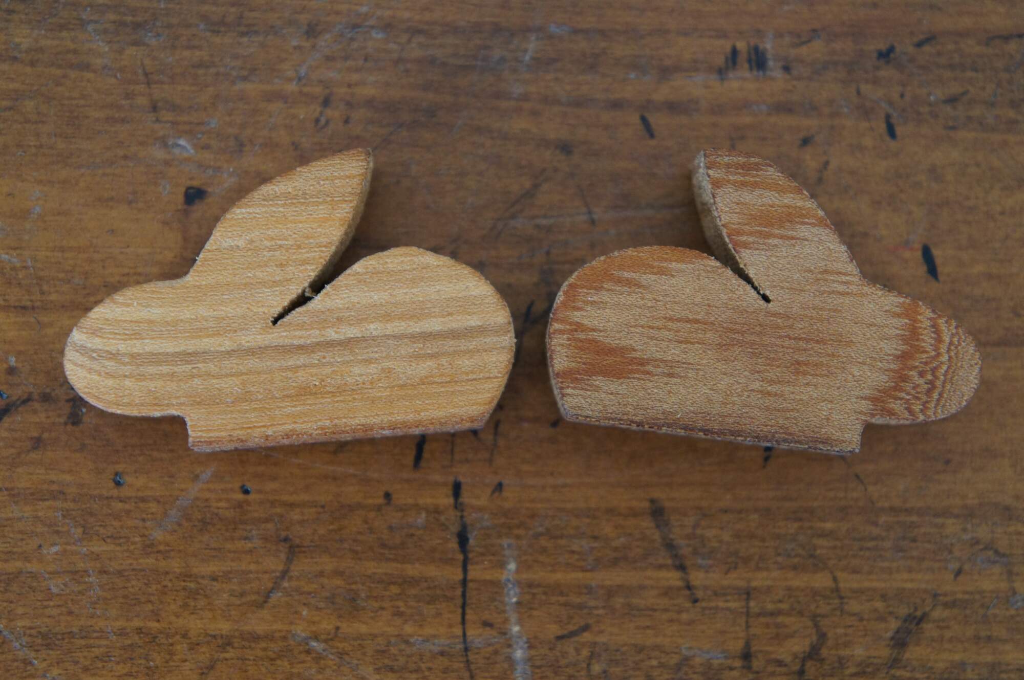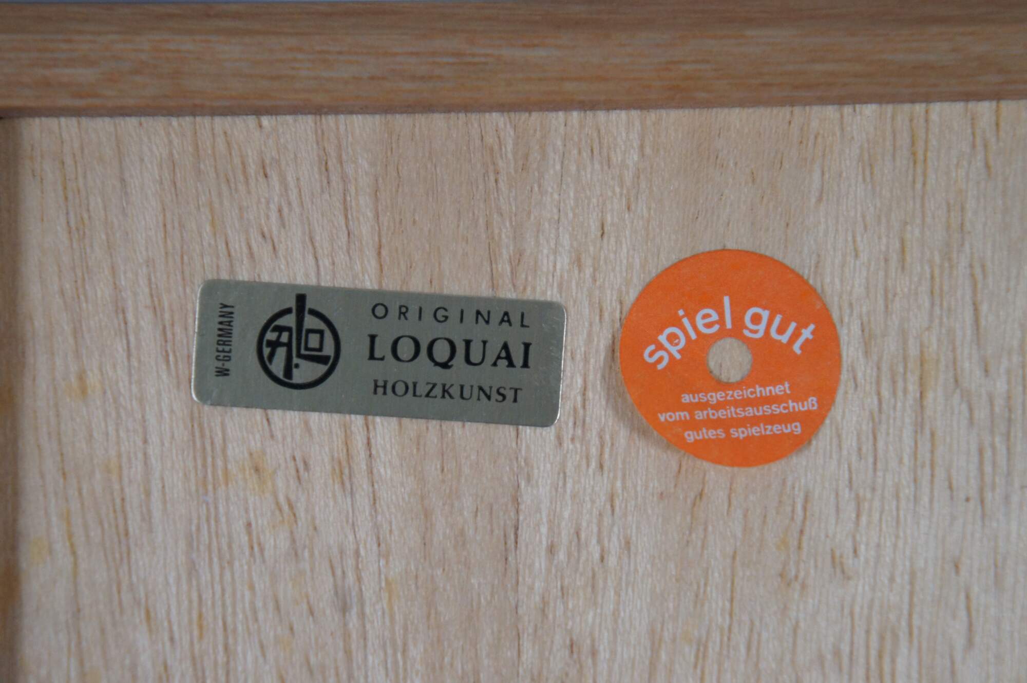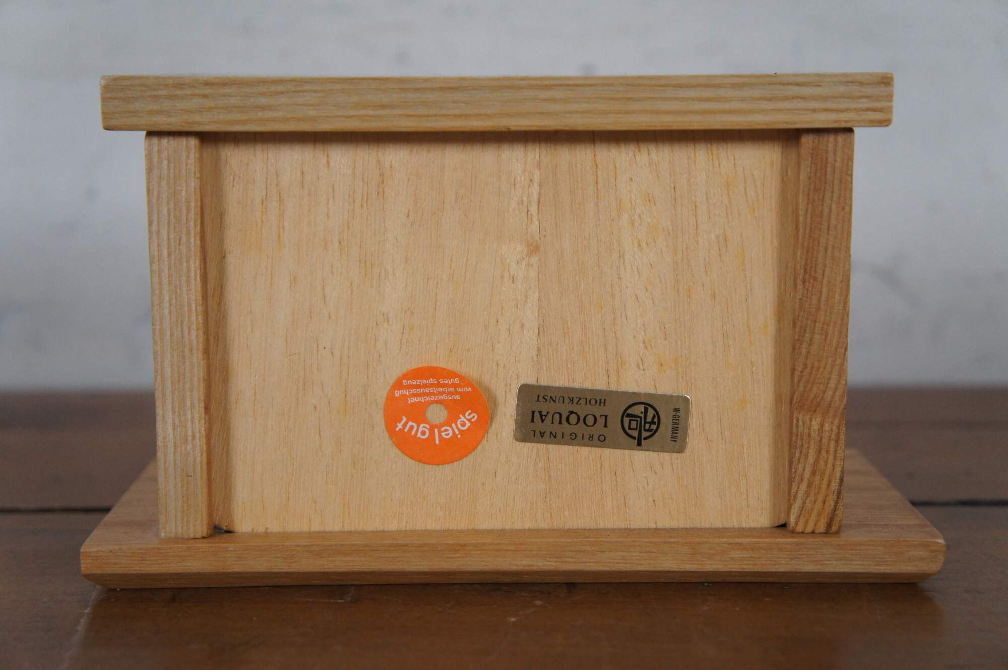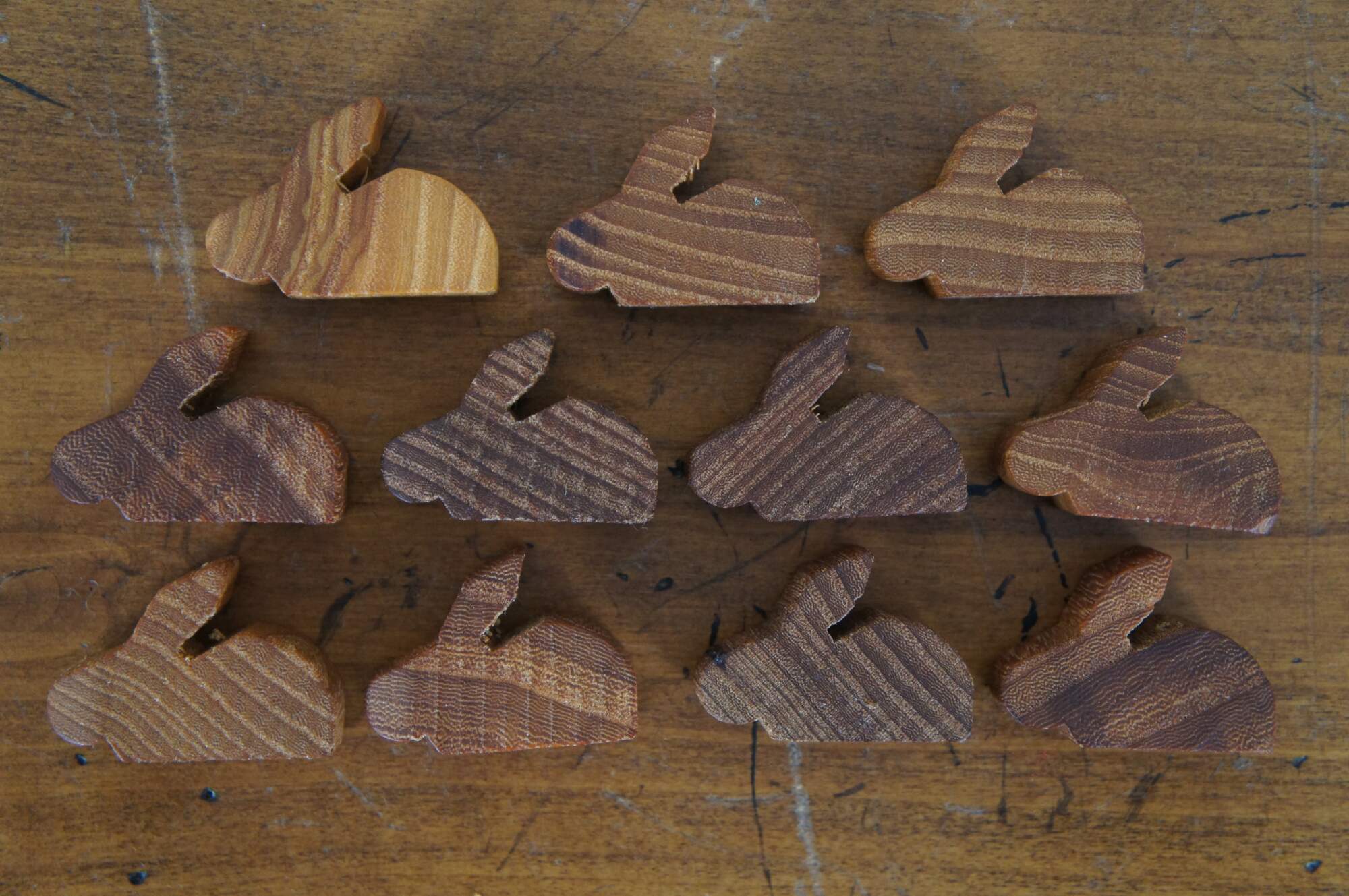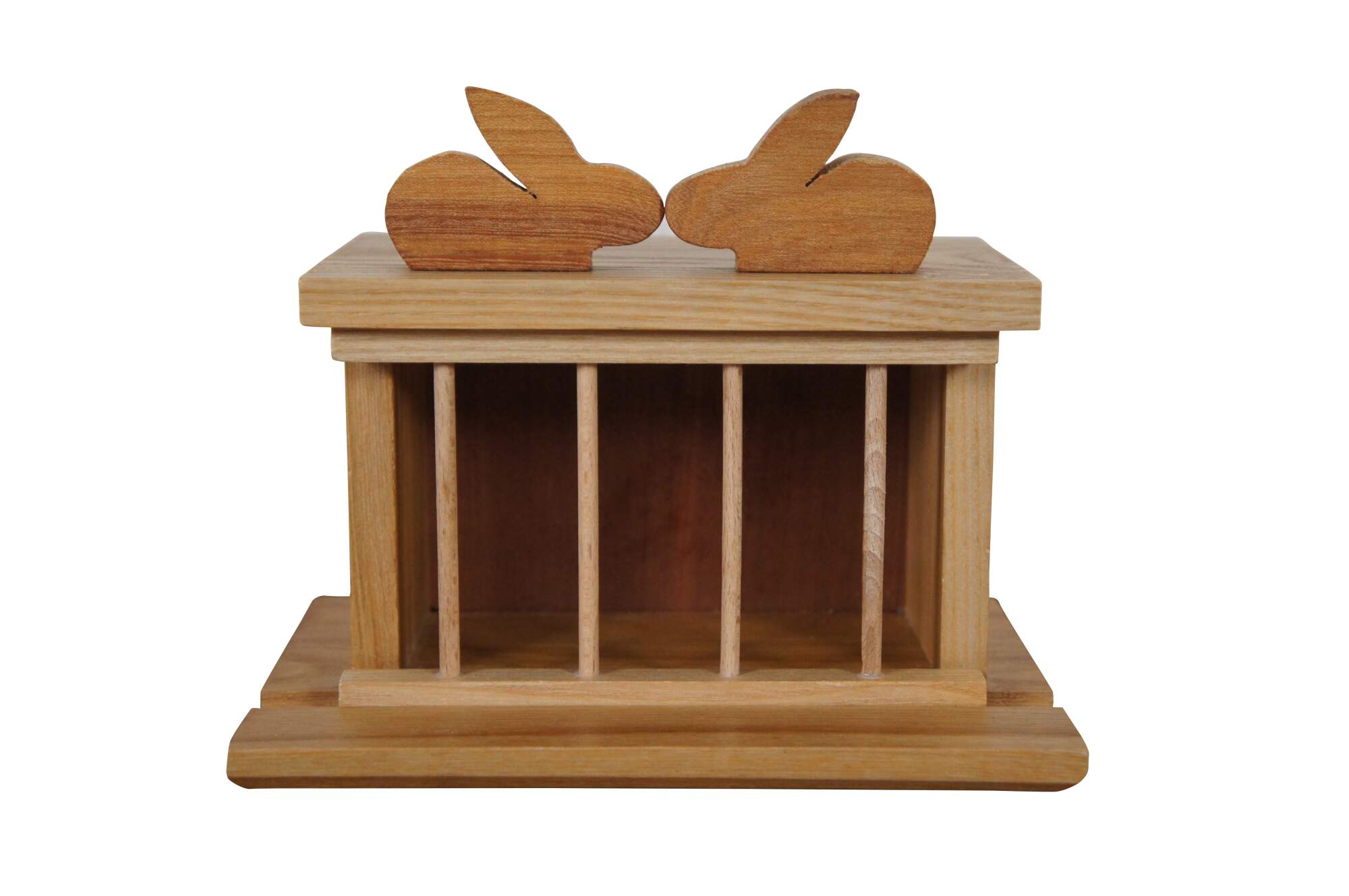 Vintage West German Loquai Holzkunst carved toy animal set. Features many Easter bunnies or rabbits in a hutchcage with a water bowl. Spiel Gut.