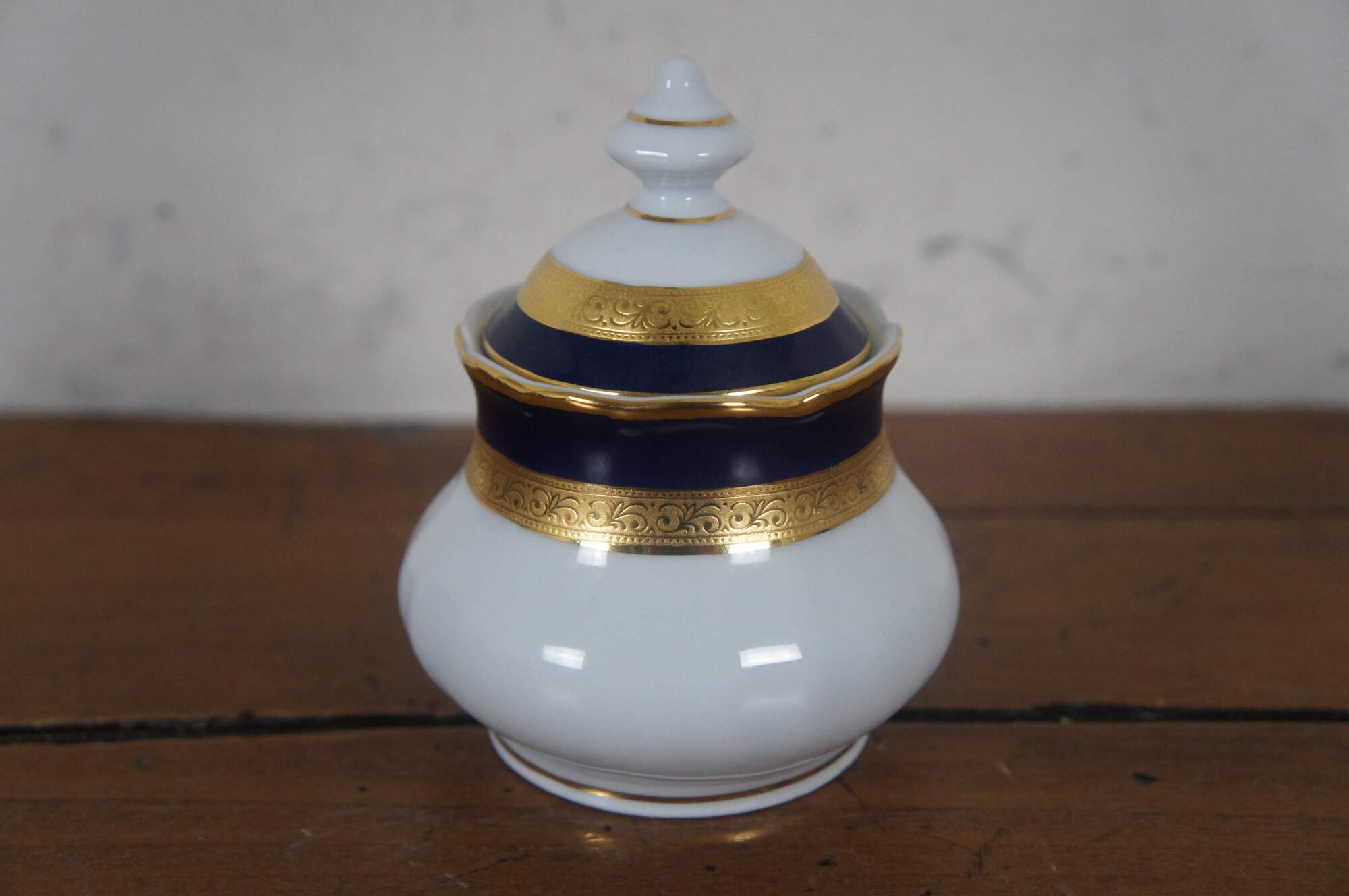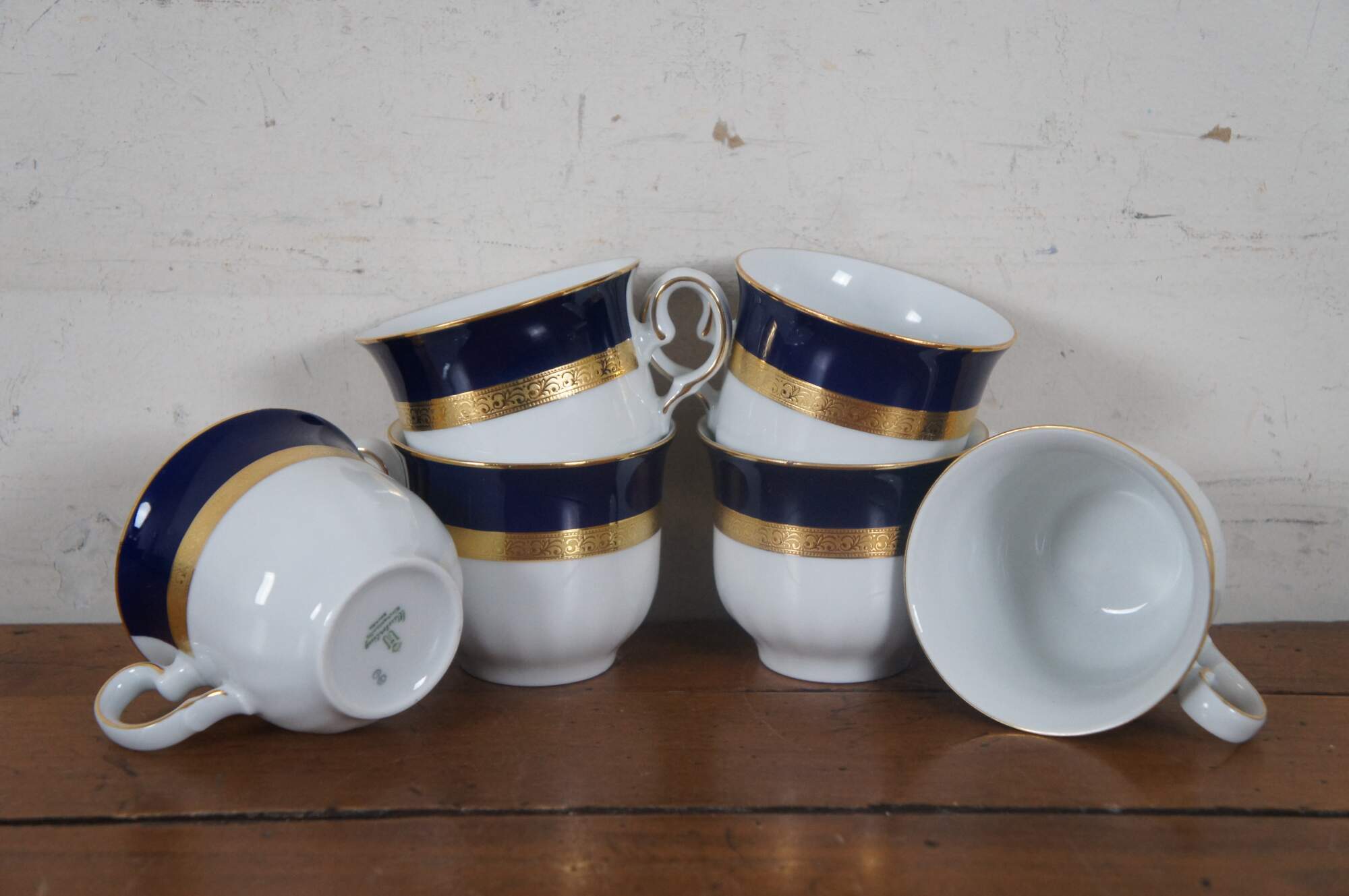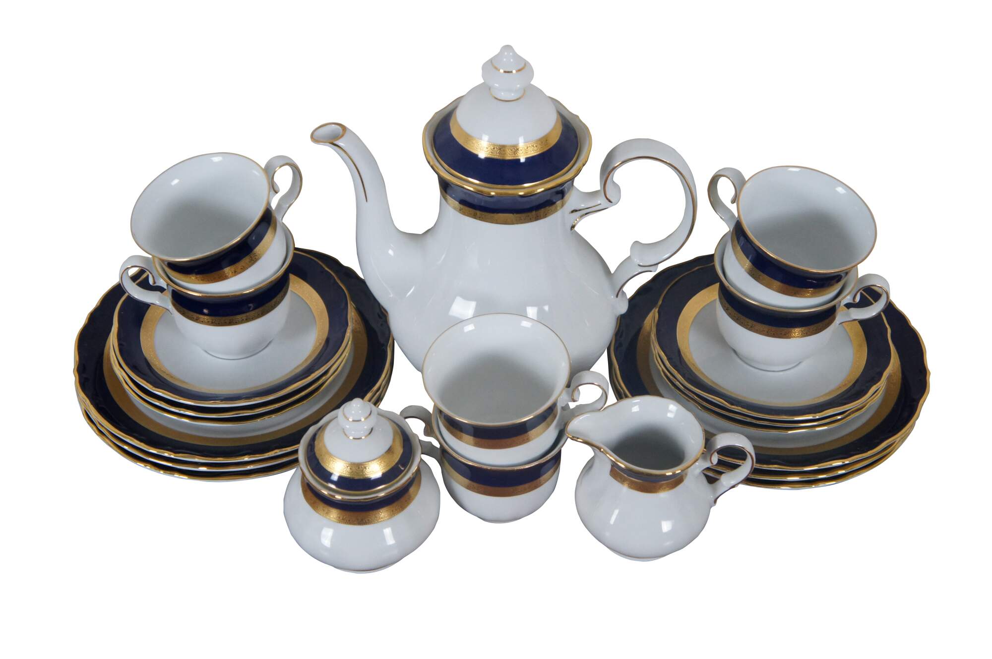 Vintage German Bavarian Wiuterliug Kirchenlomitz Echt Kobalt Scharffeuer china demitasse tea coffee set featuring teapot, creamer, sugar, cups, saucers and desert plates.