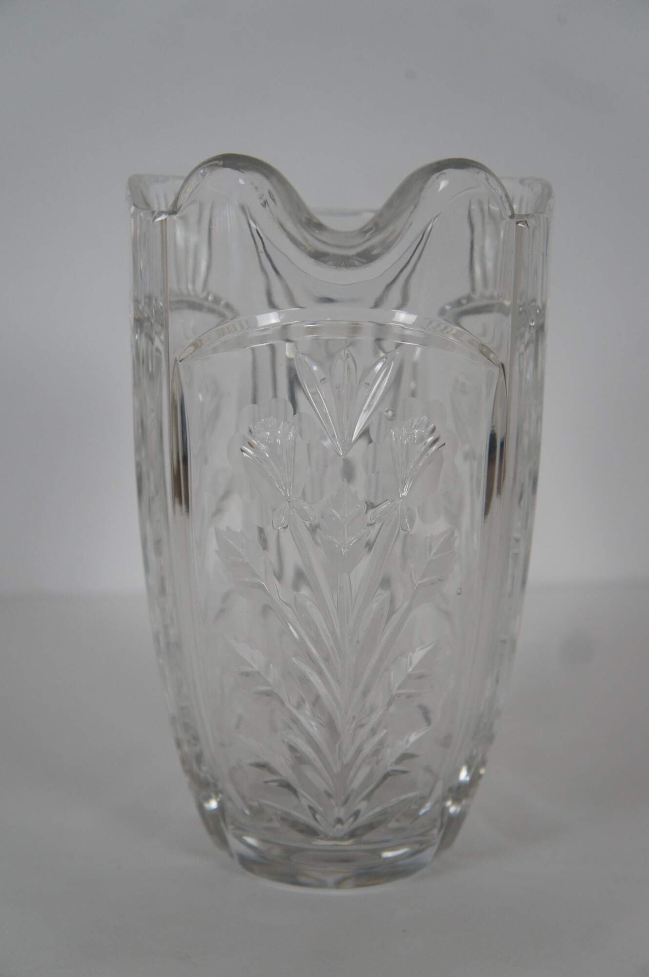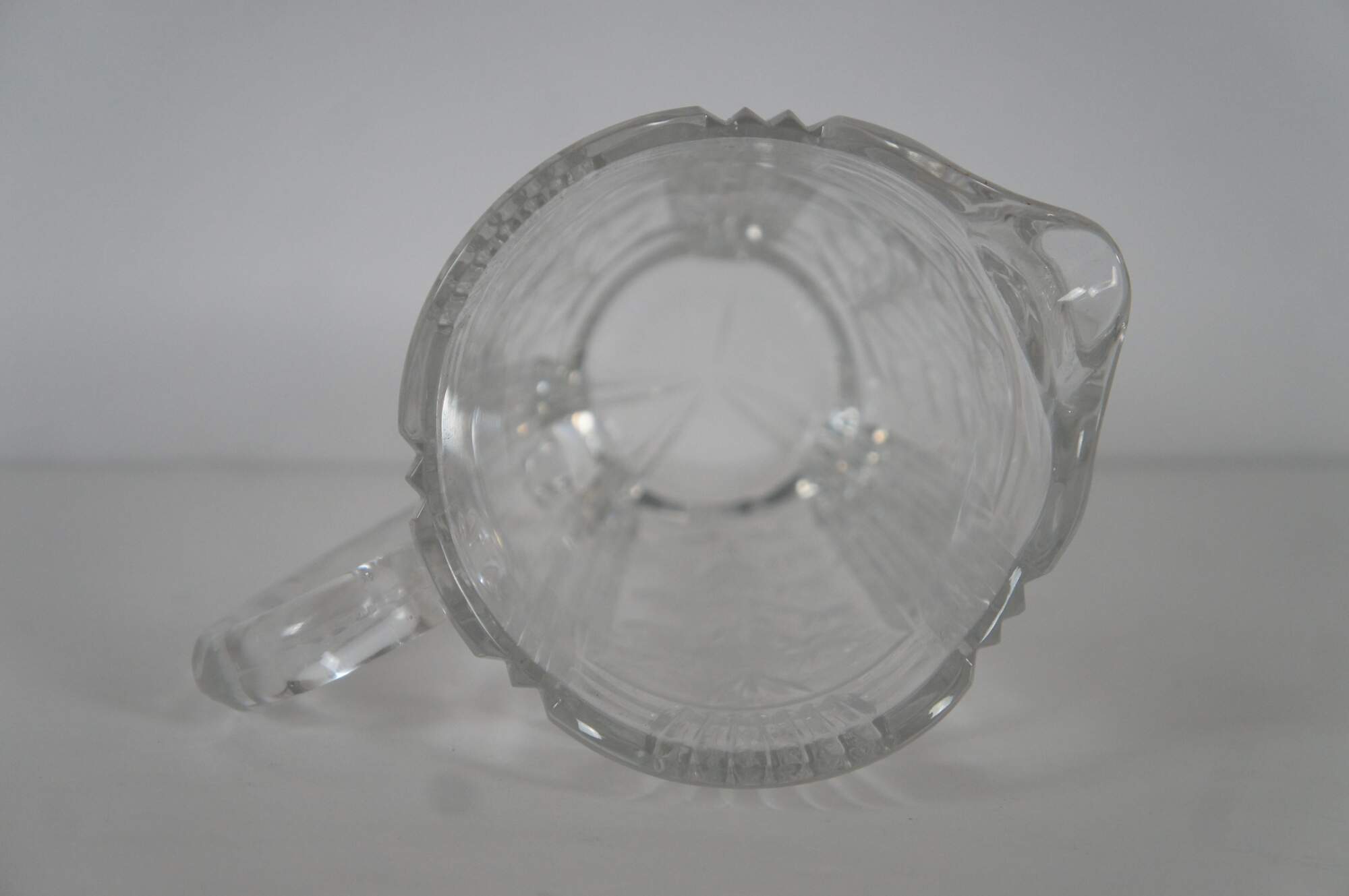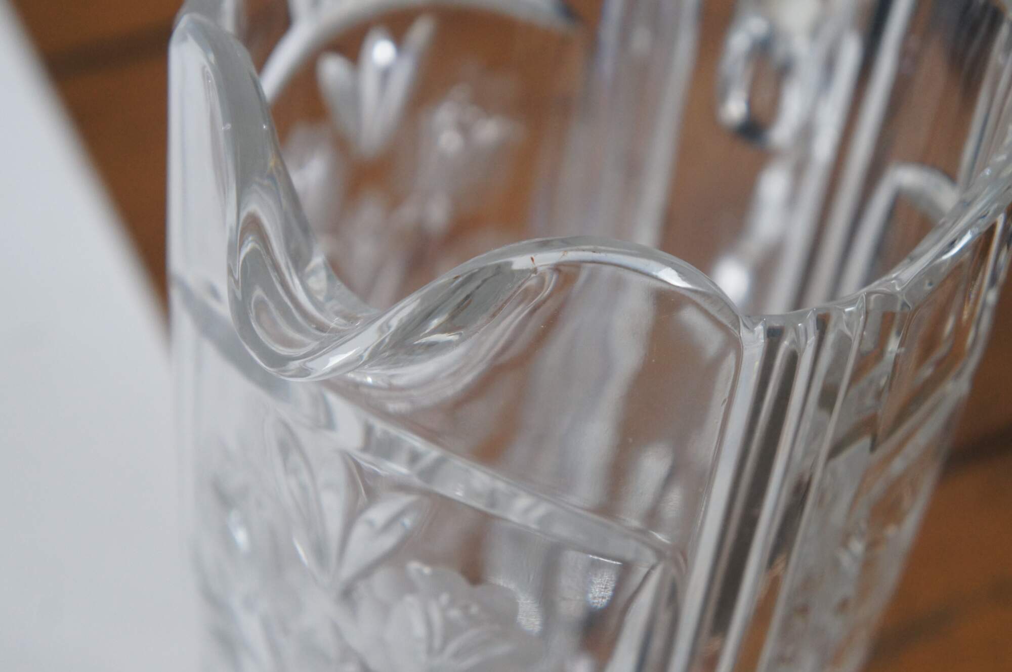 Vintage cut glass water pitcher featuring floral etched design and notched handle.