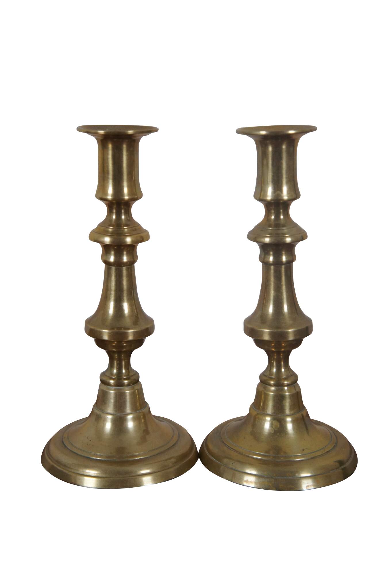 Three antique English brass candlesticks or candle holders featuring Queen Anne styling with push up rods.