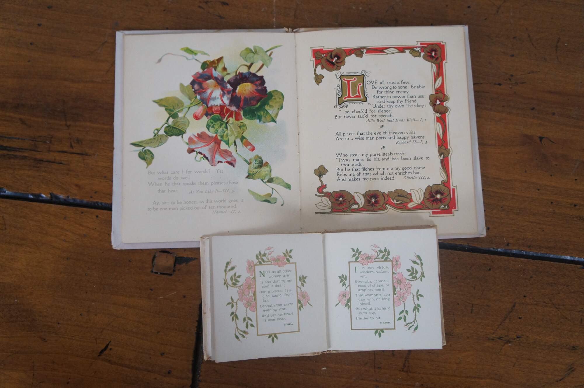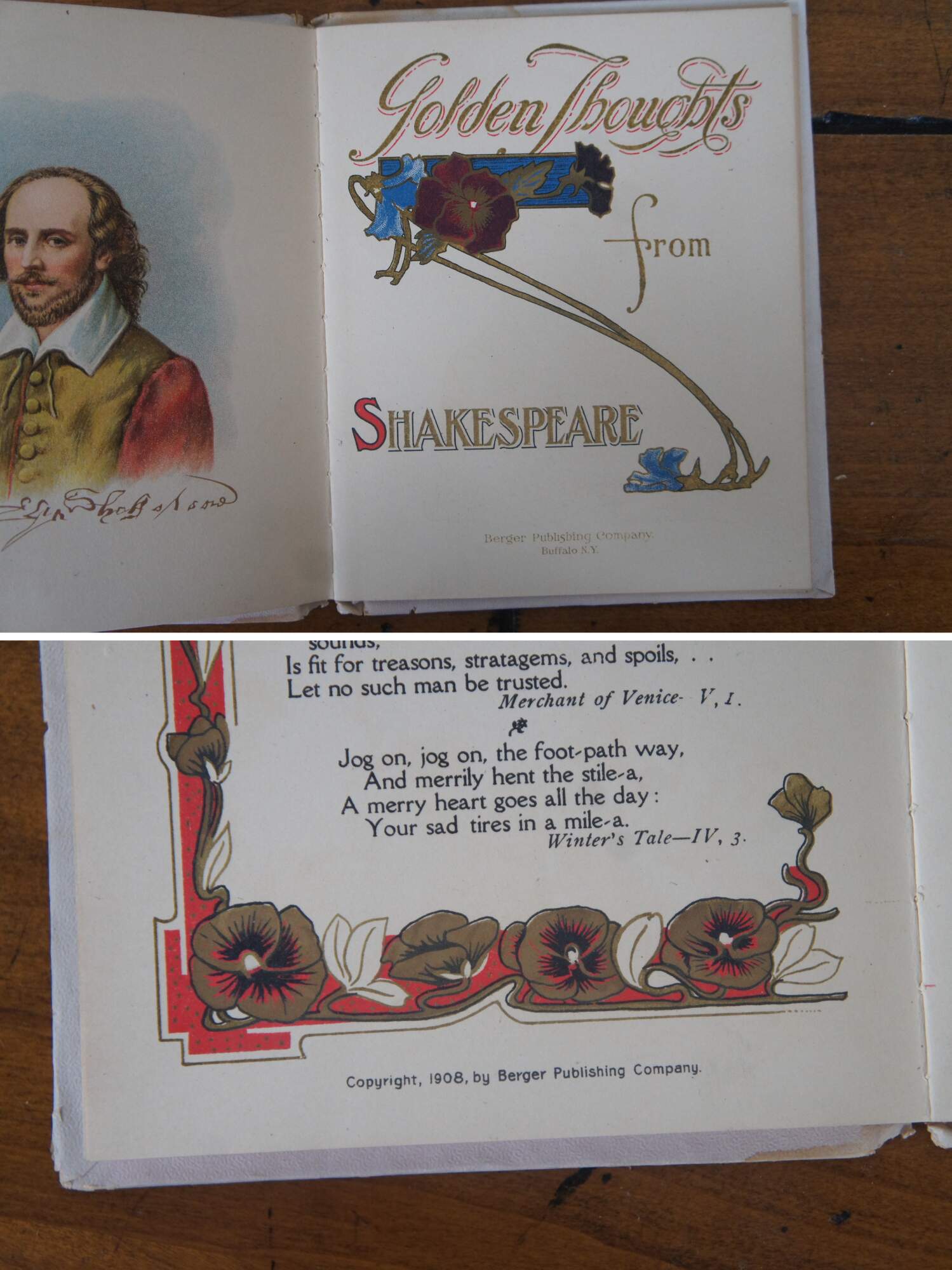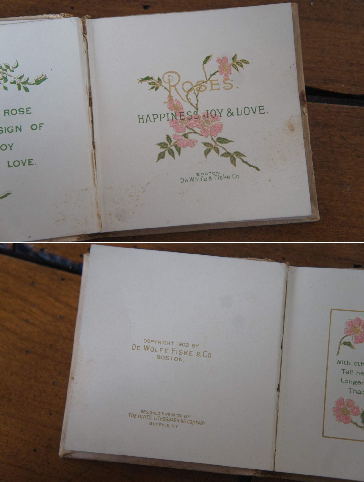 Roses: Happiness, Joy & Love - Copyright 1902 by De Wolfe, Fiske & Co, Boston - Designed and Printed by The Hayes Lithographing Company, Buffalo, NY // Forget-Me-Nots for Rememberance - Cupples & Leon, New York - circa 1907 // Golden Thoughts from Shakespeare - Copyright 1908 by Berrger Publishing Company // Buds and Blossoms from Eugene Field - Copyright 1909 by Cupples & Leon Company, New York