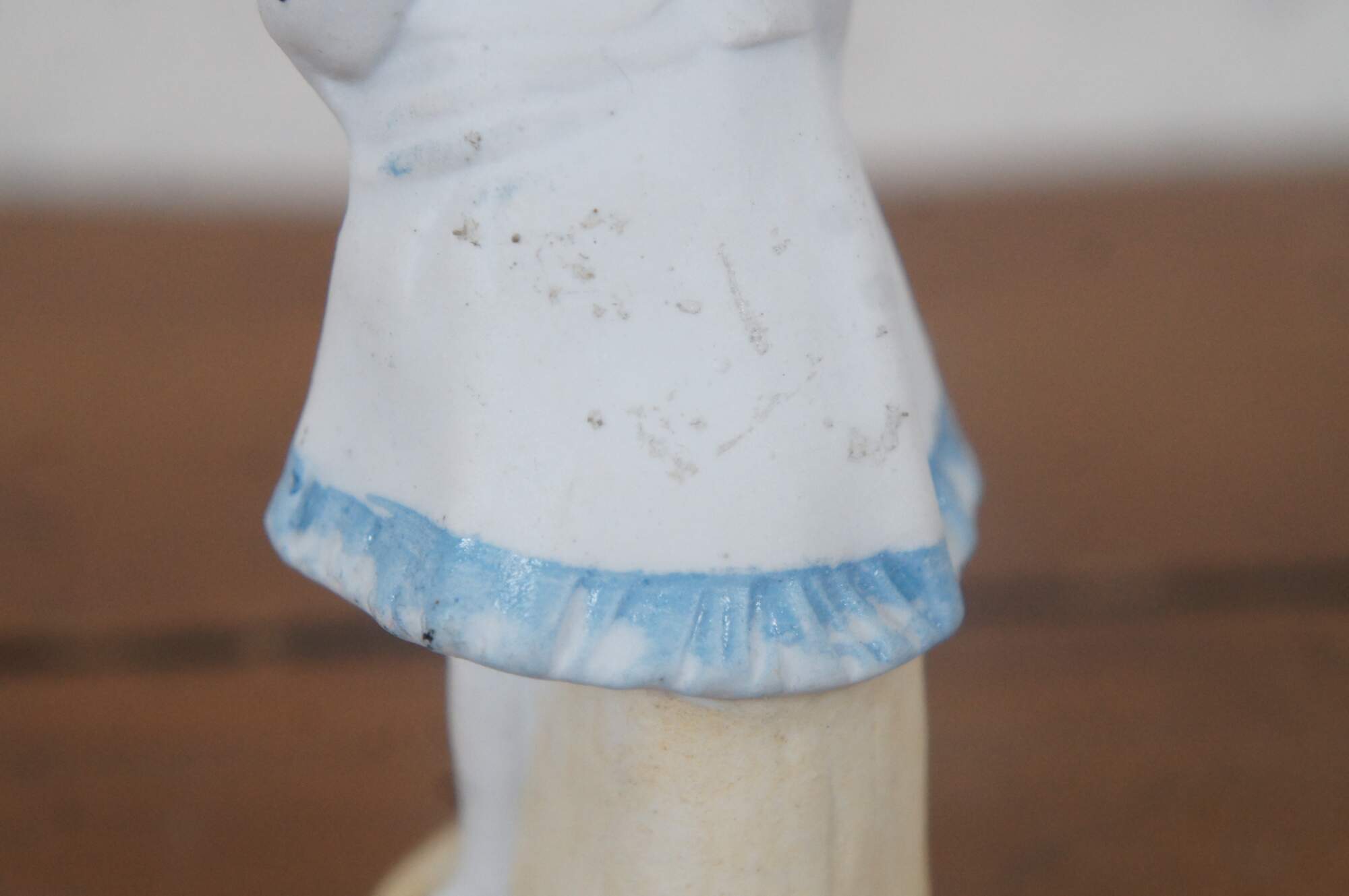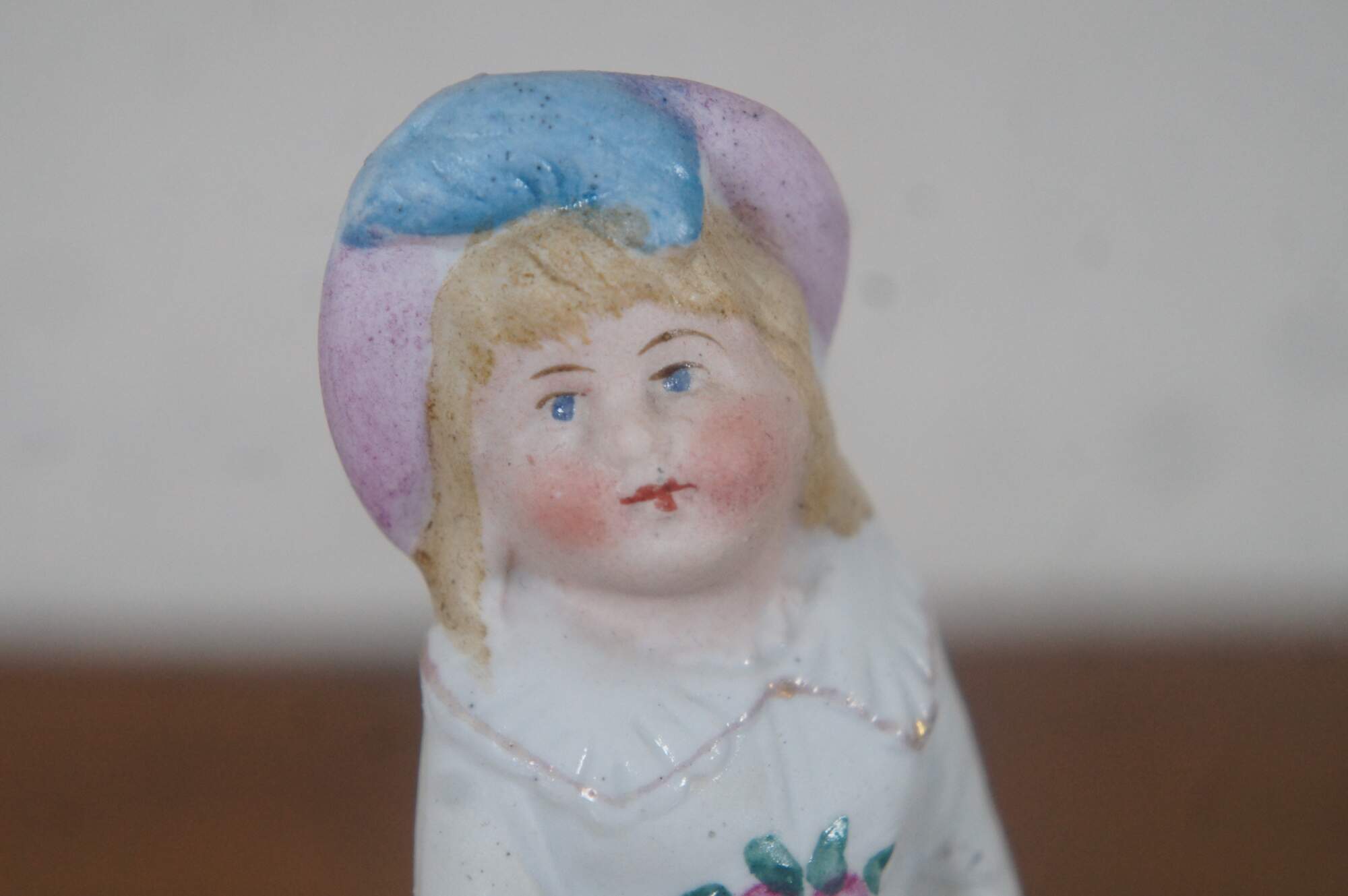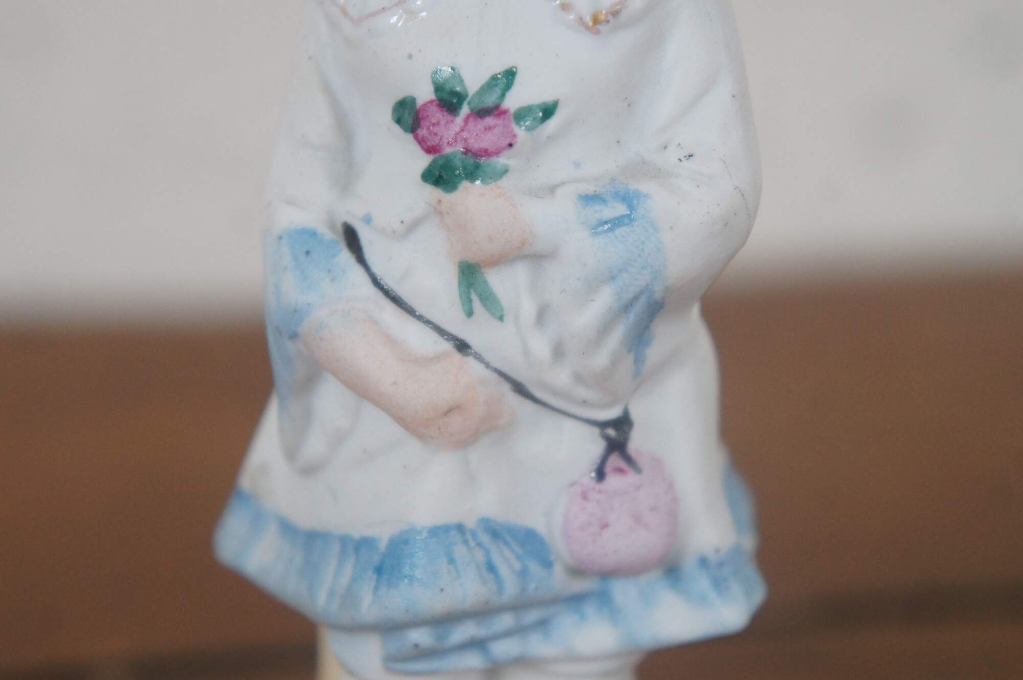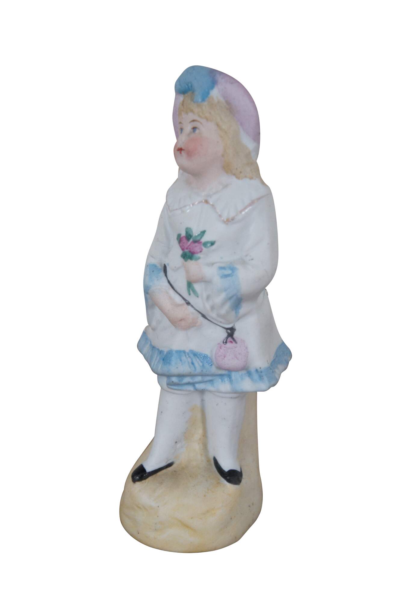 Antique German Victorian bisque figurine featuring a young girl with a bouquet of flowers.