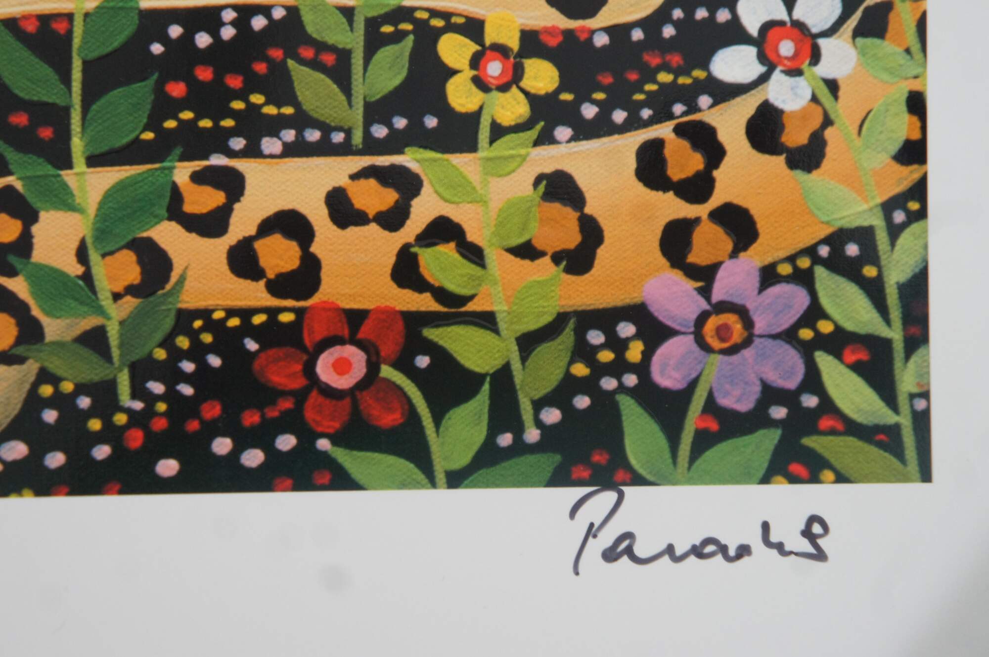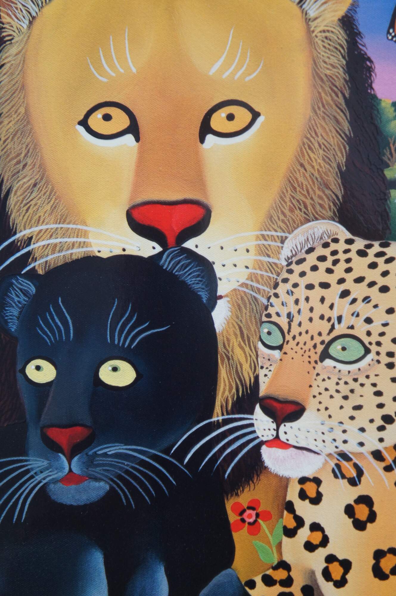 Vintage Branko Paradis Noahs Art II serio lithograph print featuring a grouping of big cats; lion, tiger, panther, cheetah and butterfly against a mountain / lake / floral landscape. Purchased on Princess Cruises Fine Art.
