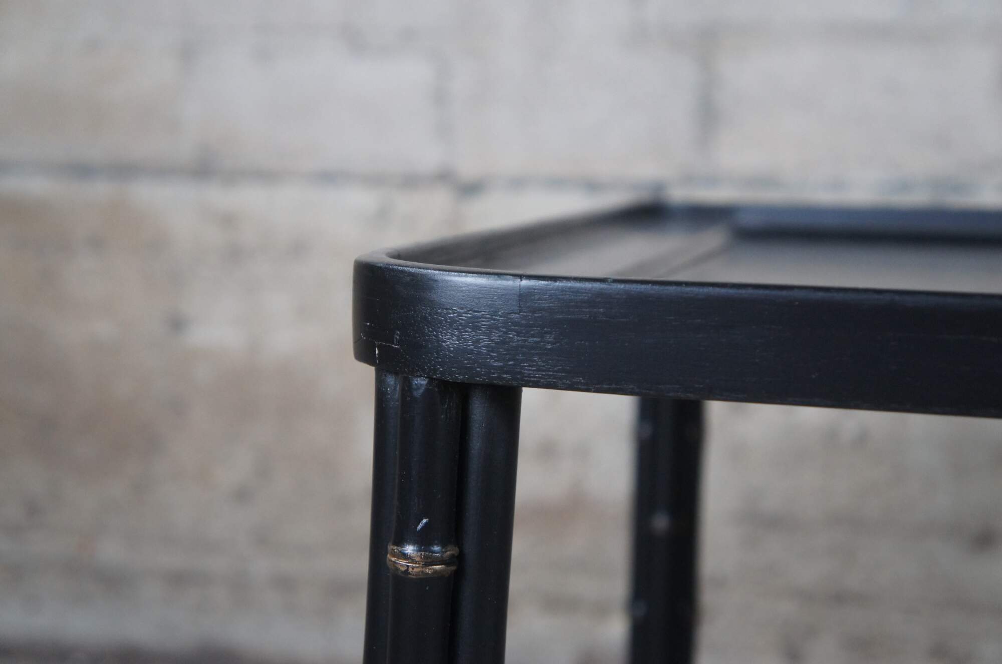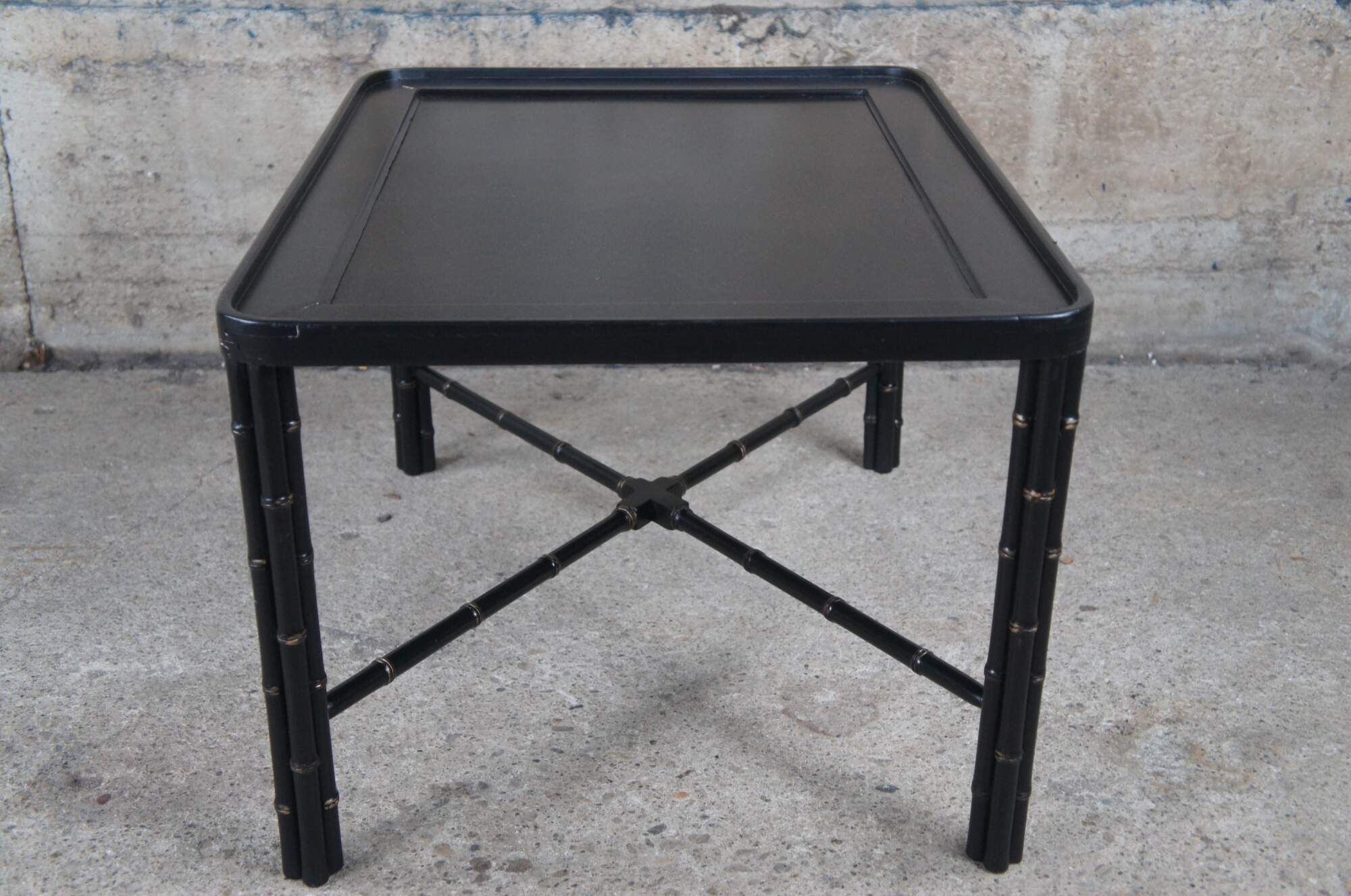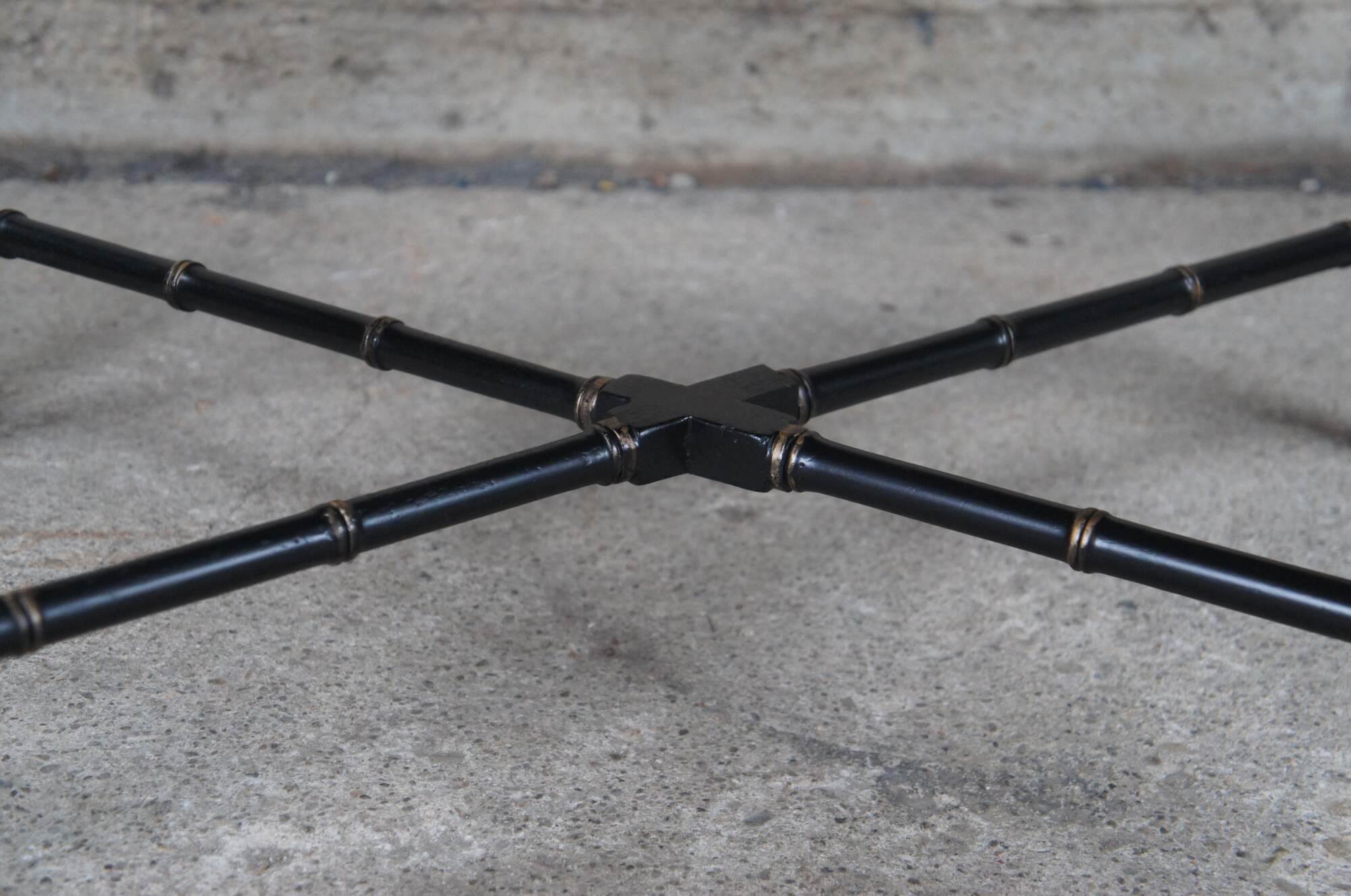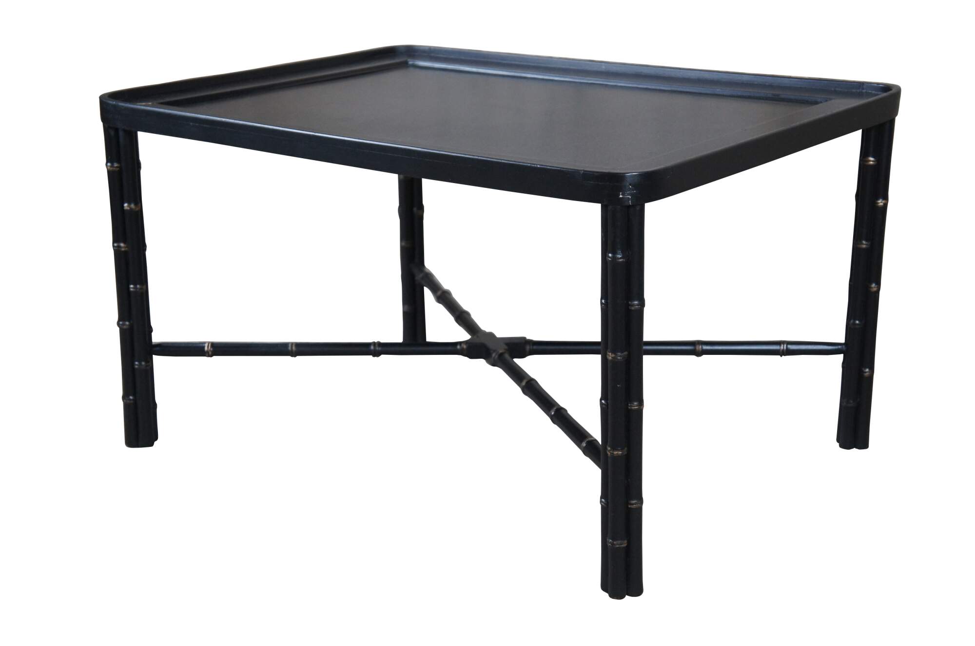 Vintage black lacquered / ebonized Chinese chinoiserie / Regency style coffee or cocktail table featuring rectangular form with faux bamboo legs connected by X stretcher.