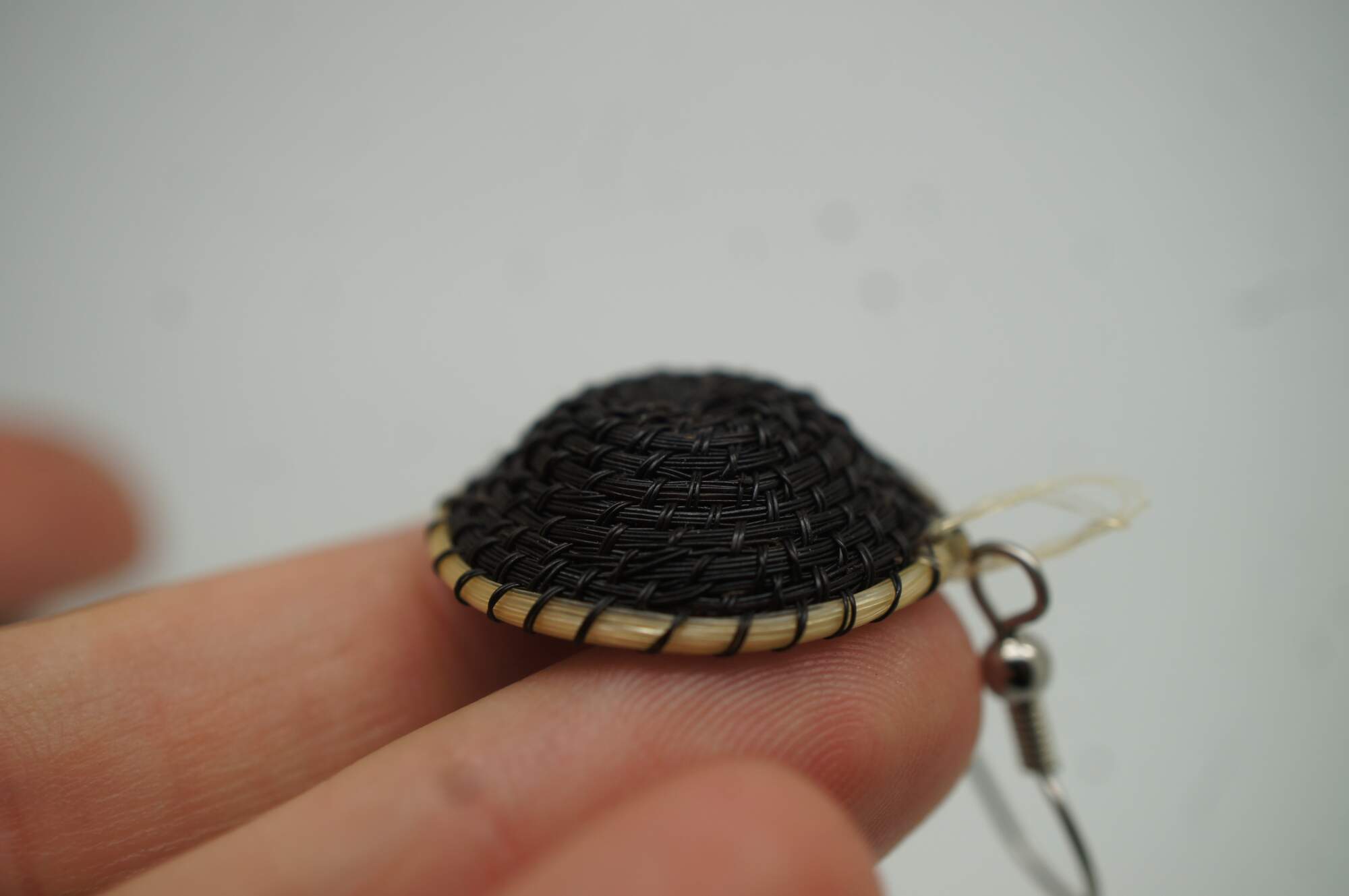 Two pairs of vintage Native American / Southwestern statement earrings. One woven round basket style and the other three strand beaded dangle. Purchased from OB's Indian American Shop in Gallup New Mexico, circa 1960s-1970s, signed Esalio.