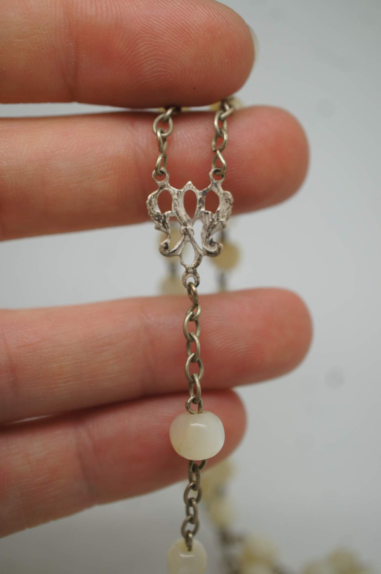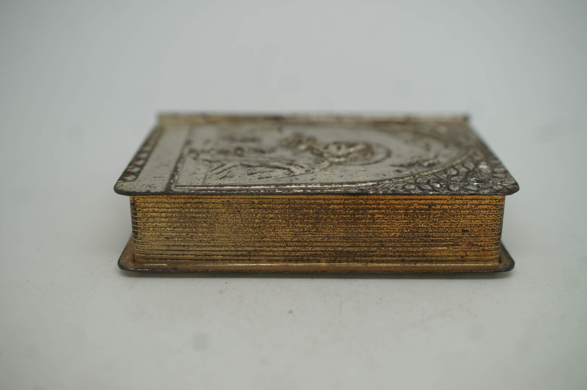 Mid to early 20th century German / French silver plate rosary holder case and necklace. Shaped like a bible book featuring a scene with Jesus giving communion and mother of pearl rosary with cross. Allemagne is the French name for Germany.