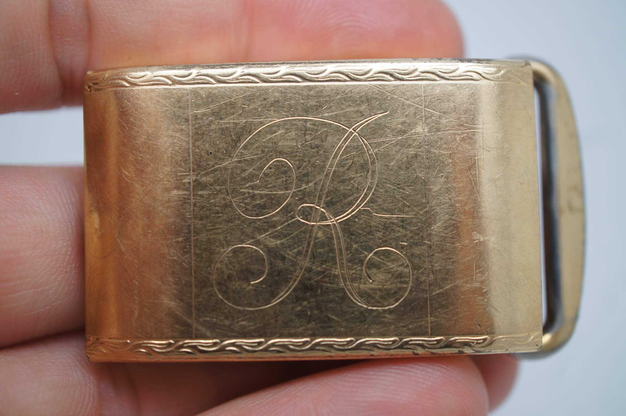 Mid century 1950s Hickok USA 1/20 10k gold filled R monogram belt buckle.