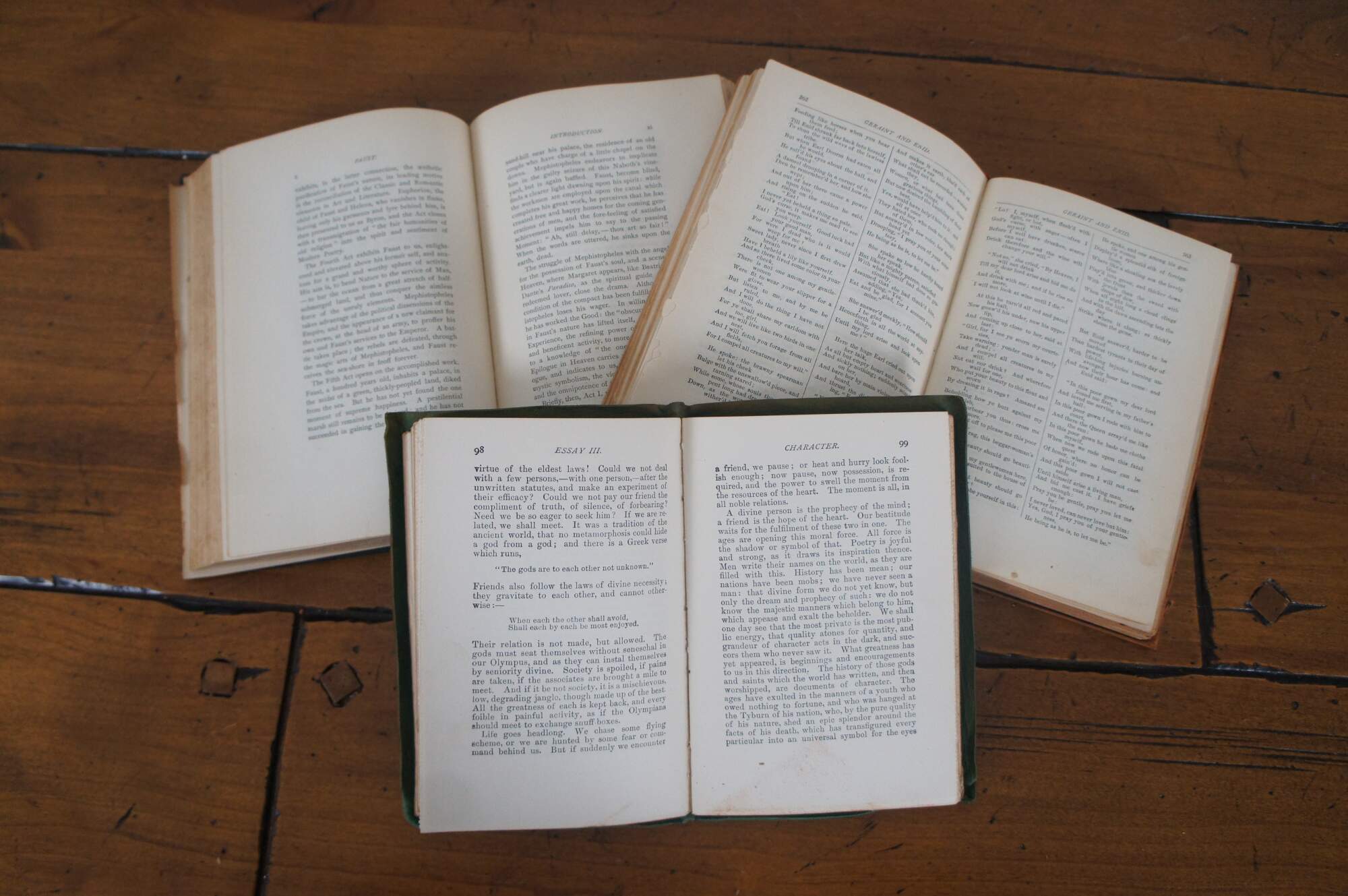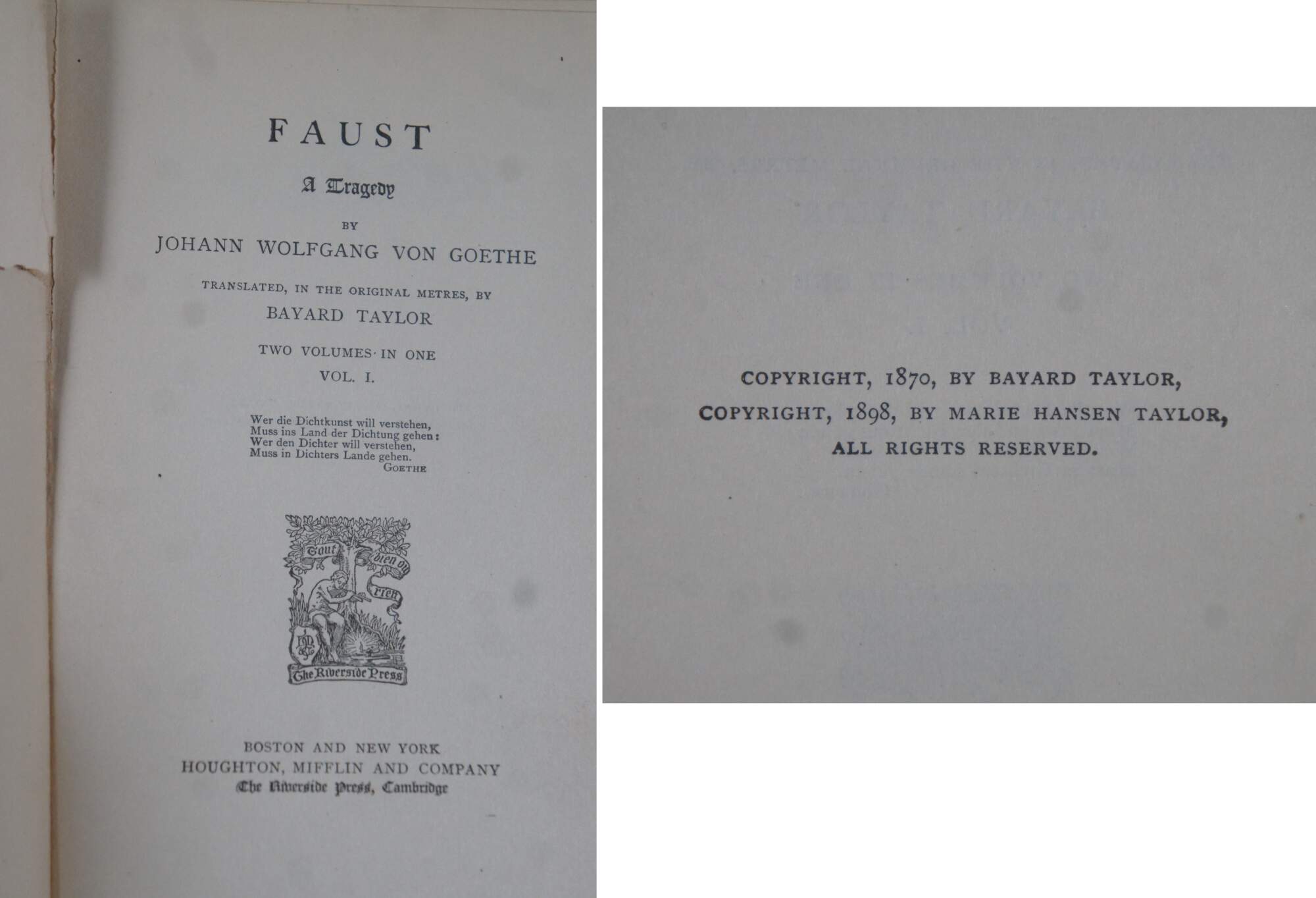 Faust: A Tragedy by johann Wolfgang von Goethe - Translated, in the Original Metres, by Baynard Taylor - Two Volumes in One Vol. I - Boston and New York, outon, Mifflin and Company - The Riverside Press, Cambridge - Copyright, 1870, by Bayard Taylor, Copyright, 1898, by Marie Hansen Tayor - Inscribed 1905 / / The Poetical Works of Alfred, Lord Tennyson with a Biographical and and Critical Introduction by Eugene Parsons - New York, Thomas Y. Crowell & Co, Publishers - Introduction dated 1806 / / The Poetical Works of John Milton with Introductions by David Masson, M.A., L.L.D. - Biographical Sketch by Nathan Haskell Dole - New York, Thomas Y. Crowell & Co, Publishers - Copyright, 1892, by T.Y. Crowell & Co / / Poems of Henry Wadsworth Longfellow with Biographical Sketch by Nathan Haskell Dole - New York, Thomas Y. Crowell & Co, Publishers - Copyright, 1893 and 1901, by Thomas Y. Crowell & Co / / Essays: Second Series by Ralph Waldo Emerson - Philadelphia, Henry Altemus Company - Inscribed 1904