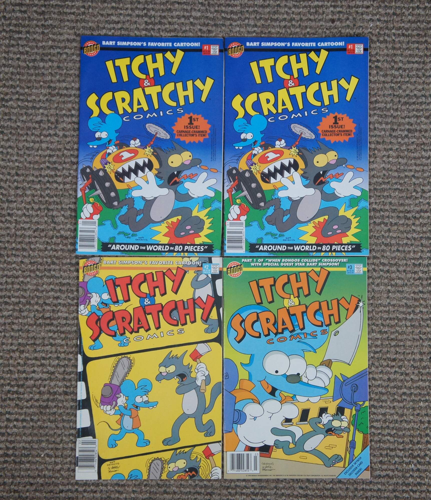 9 Simpsons Comics and Stories, 3 Krusty Comics, 5 Radioactive Man, Bartman Meets Radioactive Man, 4 Itchy and Scratchy Comics, 4 Simpson Mania: The History of TV's First Family, Childhood is Hell: A Cartoon Book by Matt Groening, 1 Simpsons poster, and 7 Life in Hell clipped newspaper comic strips/panels.