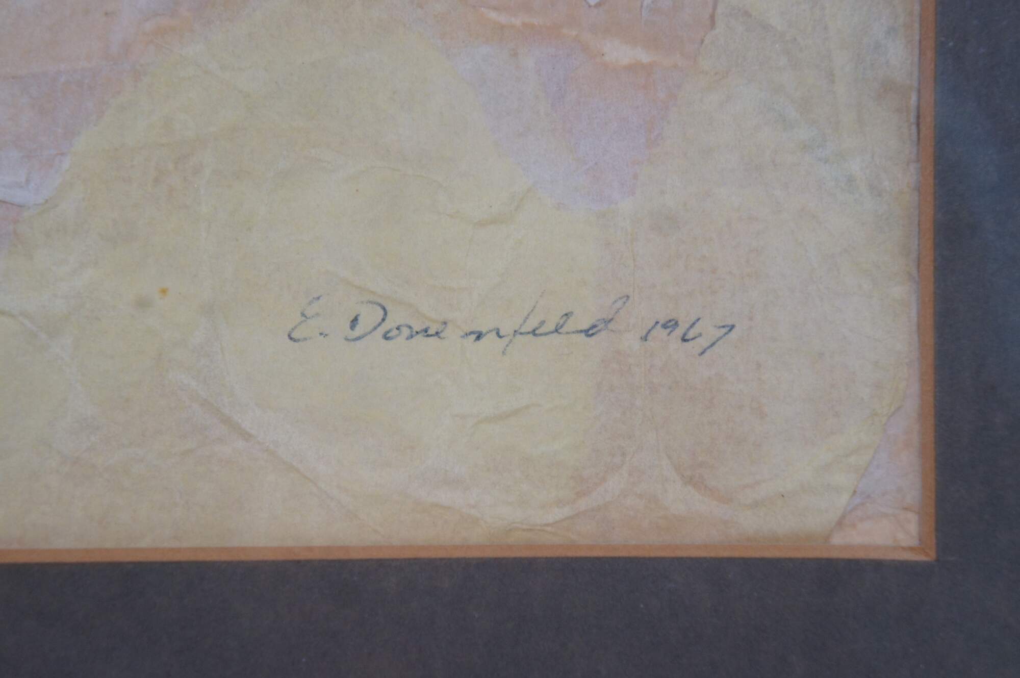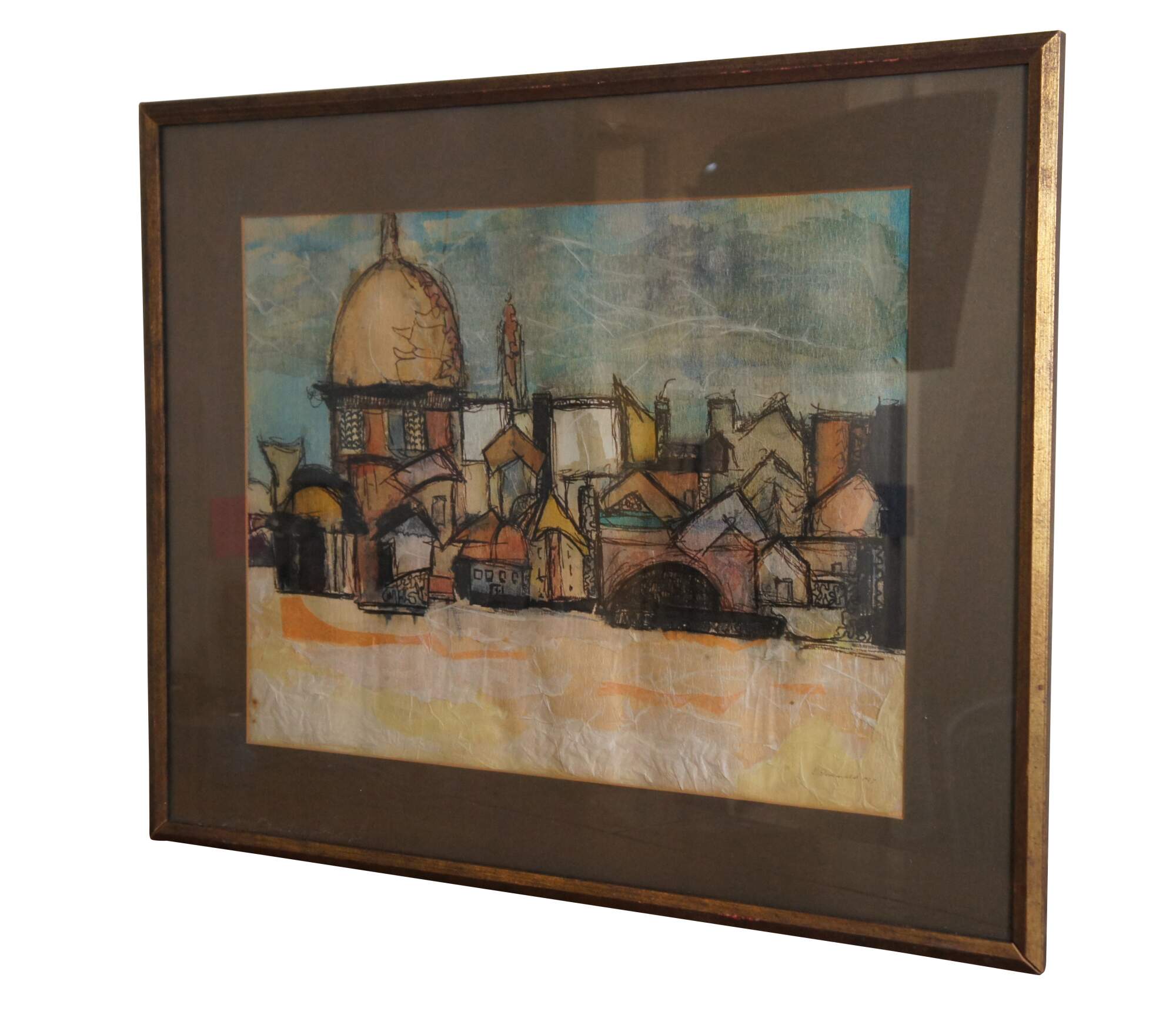 A beautiful abstract cityscape painting by Elaine Donenfeld from 1967. The watercolor is on paper and features a town with a domed temple. Signed lower right. Framed and matted.