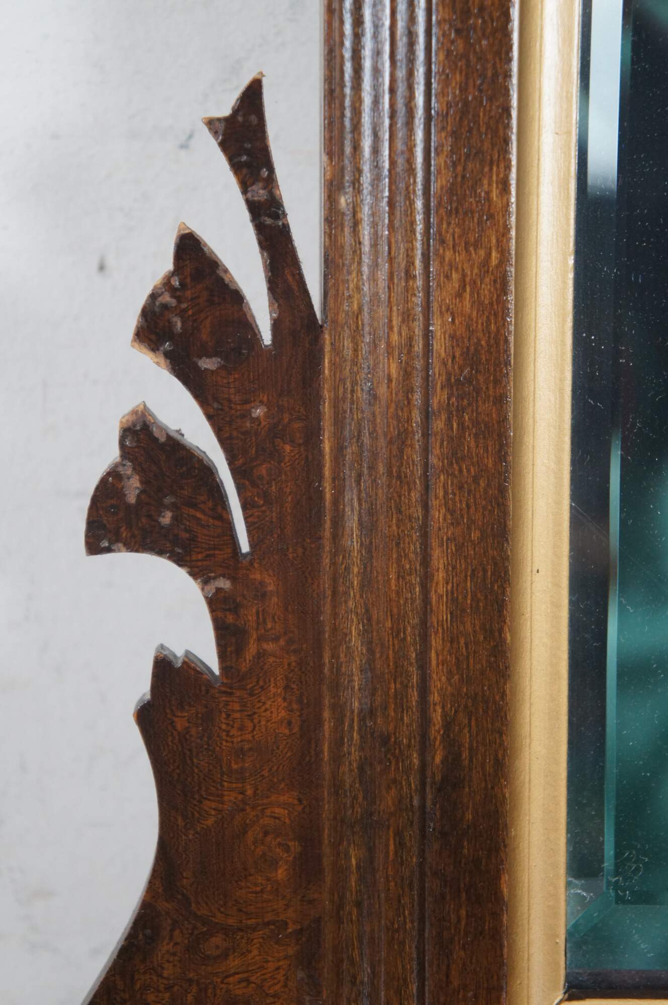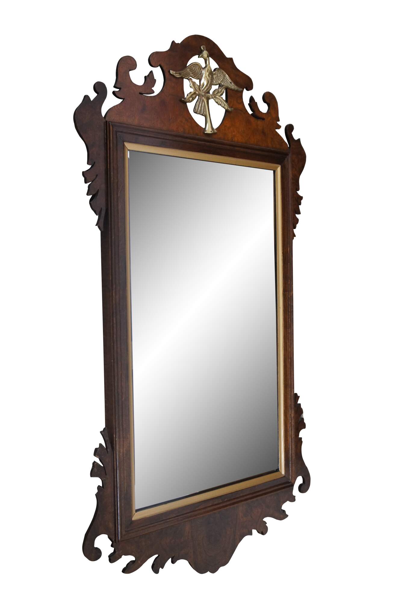 Intriguing Chippendale style wall mirror, circa second half 20th century. Features a burled and carved frame with beveled glass mirror and gold trim. The top of the mirror has a pierced oval with brass mouted dove.