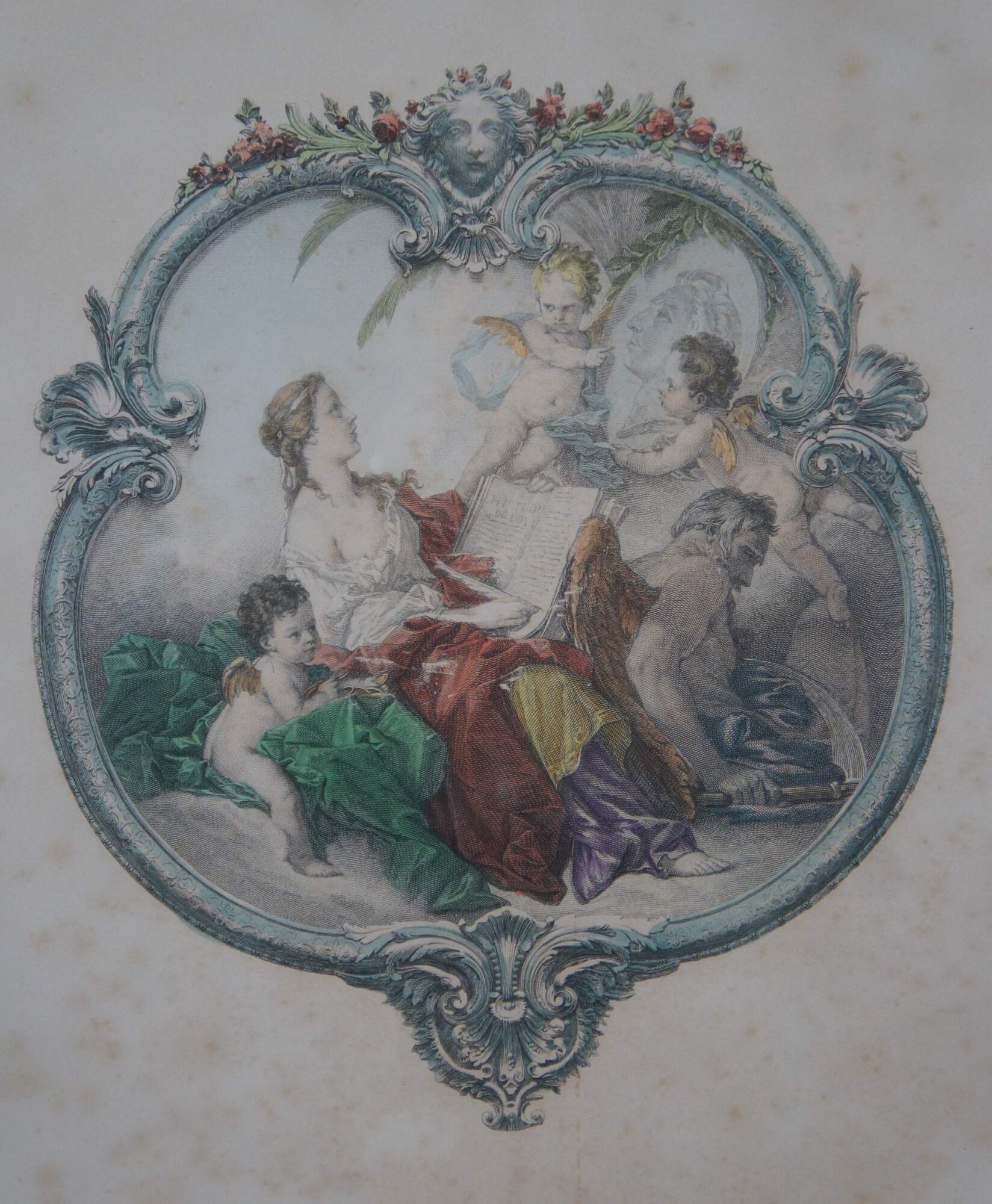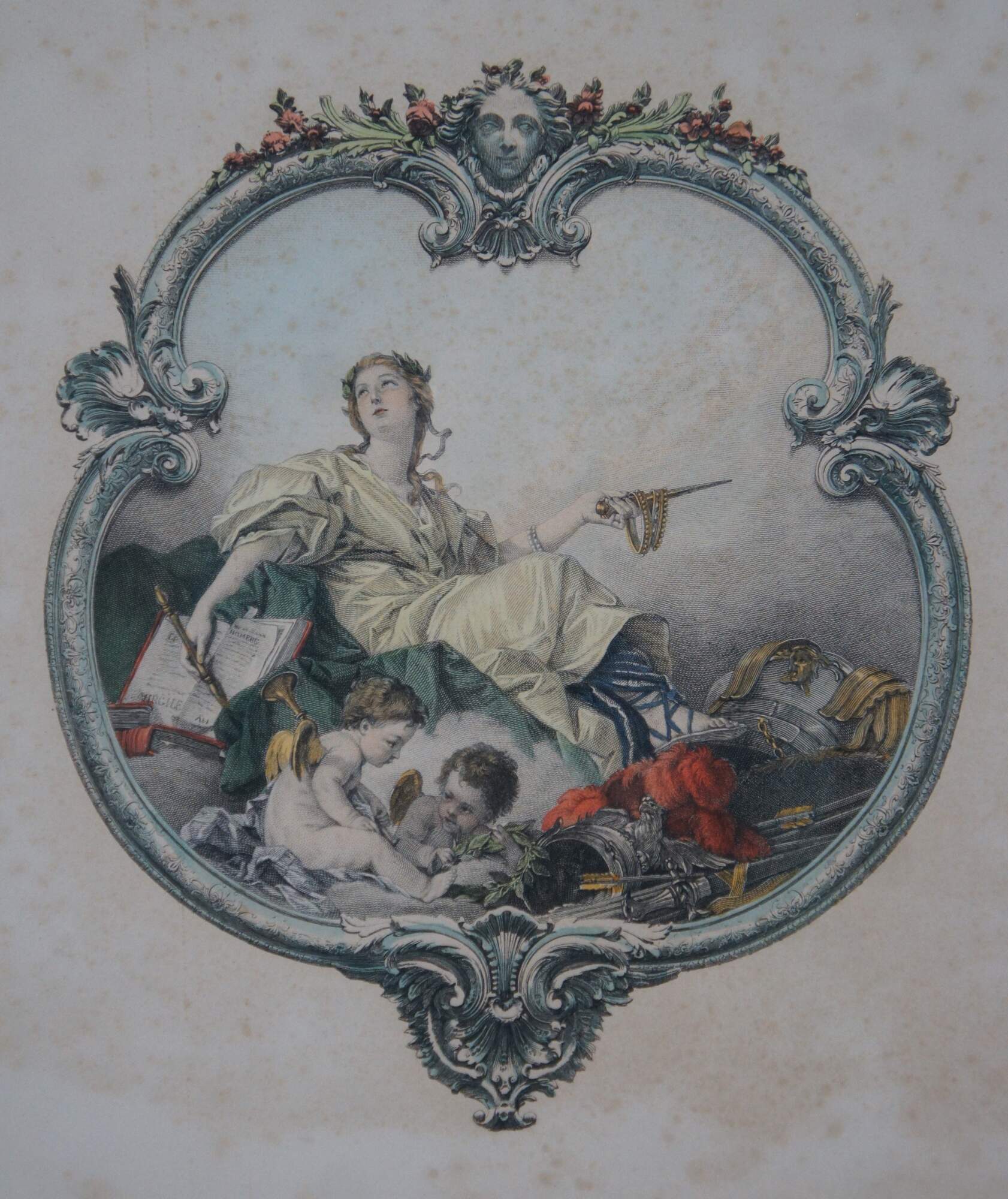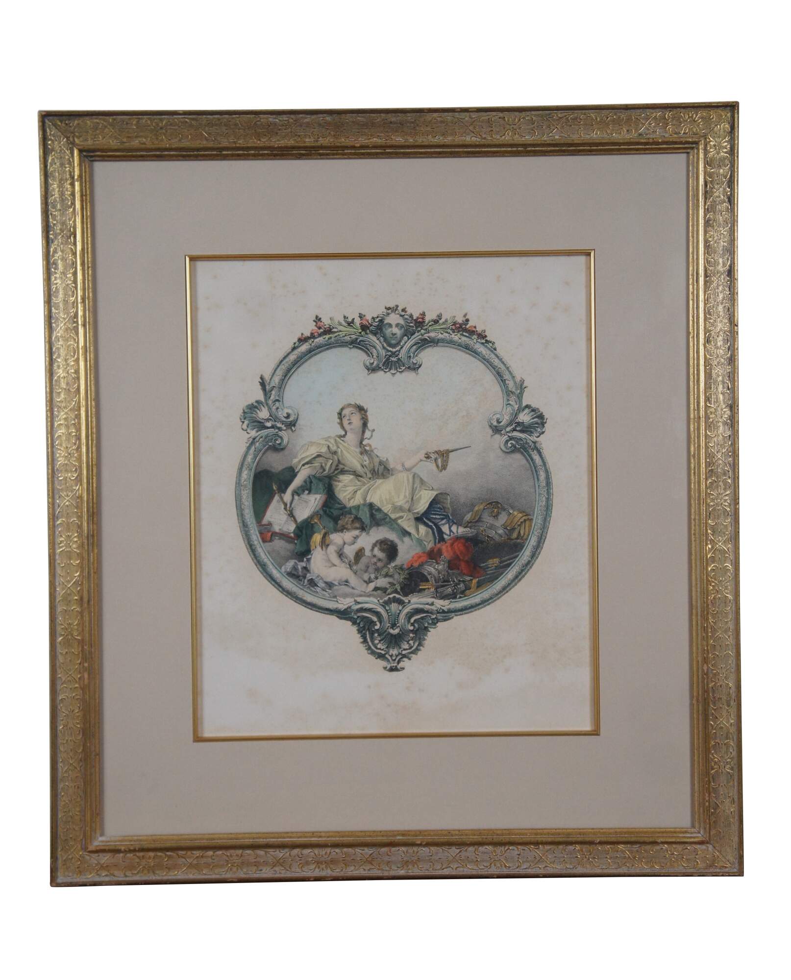 Pair of Fancois Boucher Mezzotint Engravings from the first half of the 20th century The colored engravingss have a classical design with a Poetry theme. Matted and framed in gold.