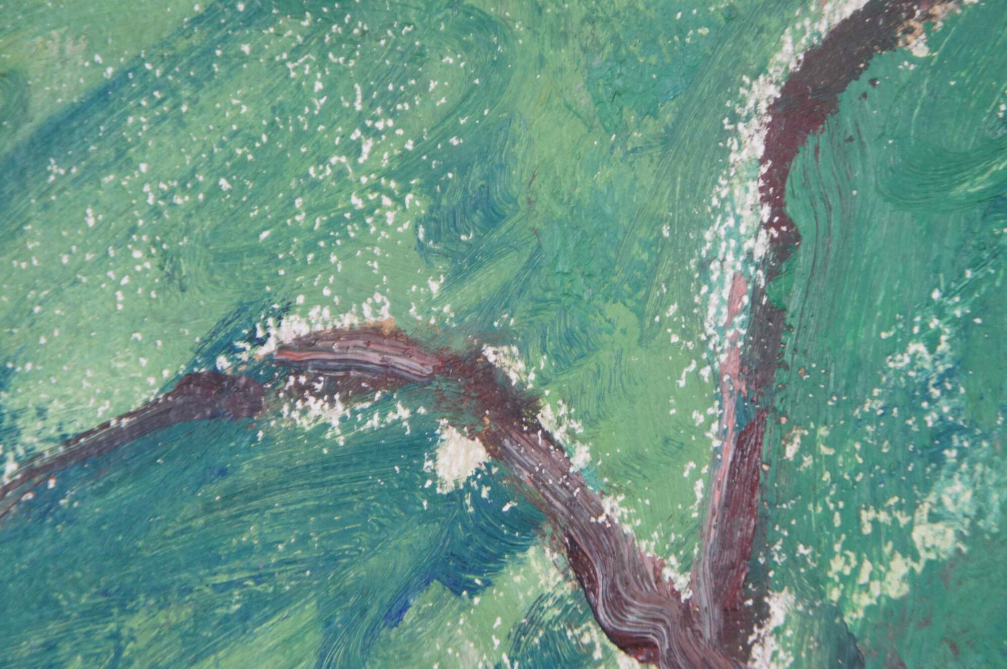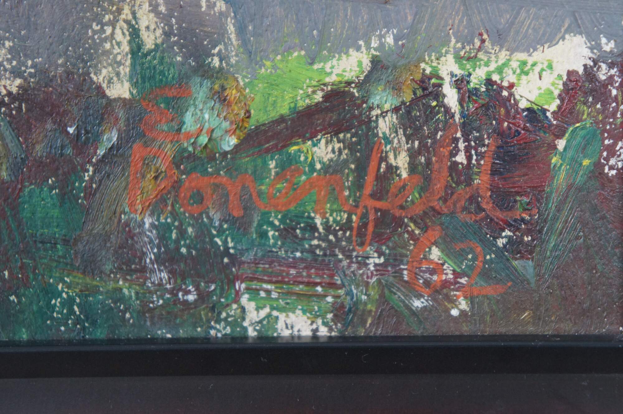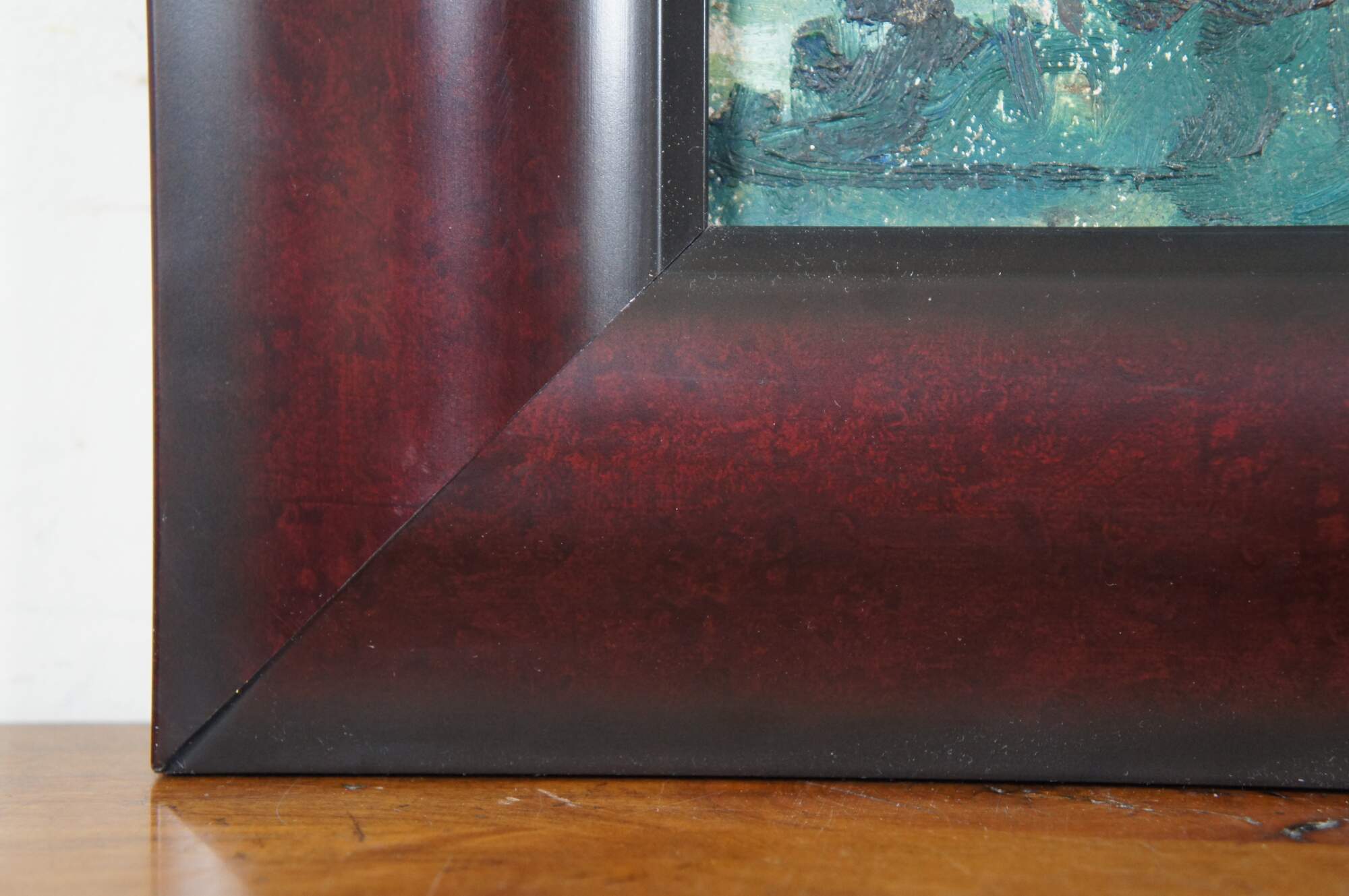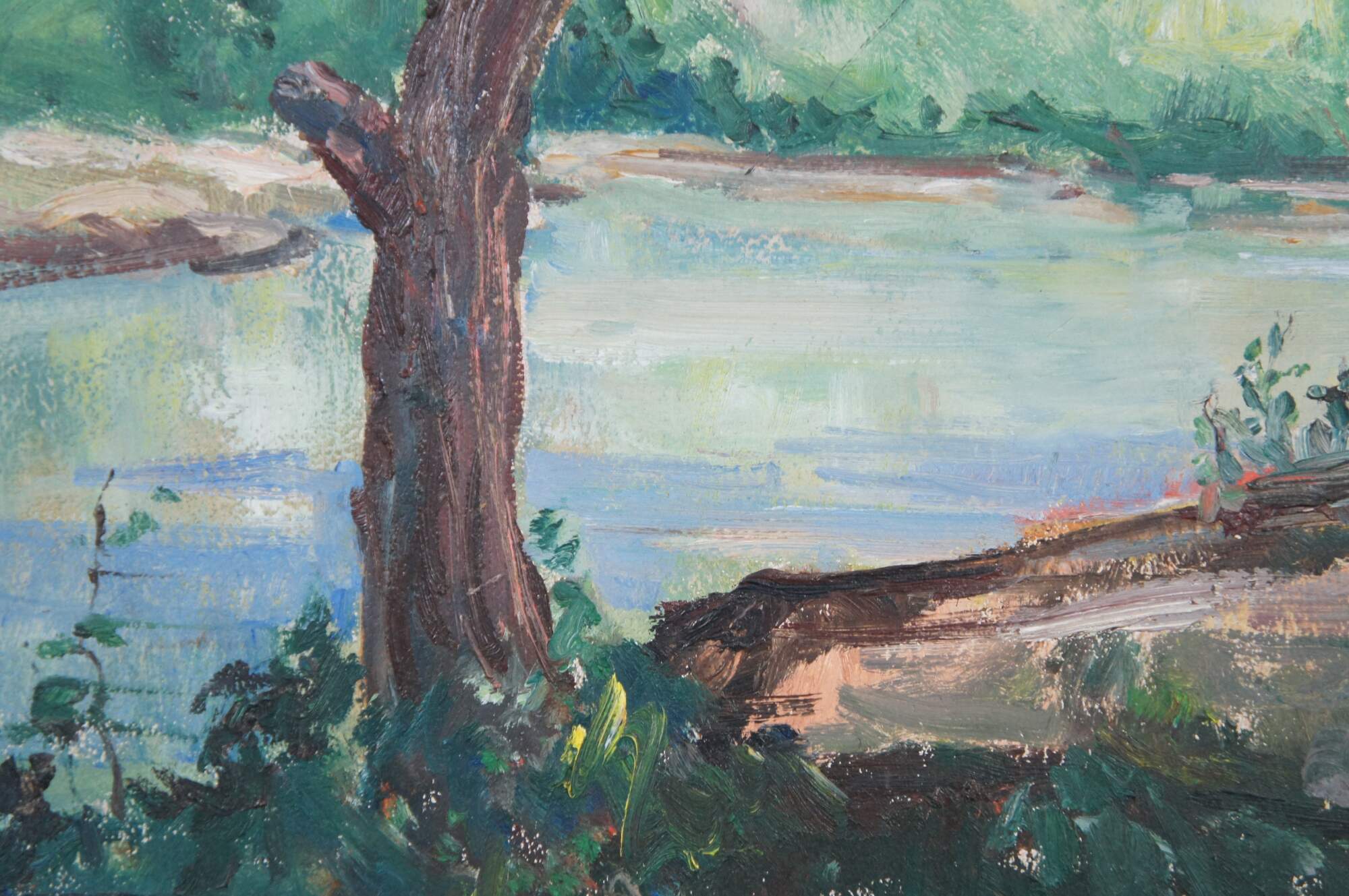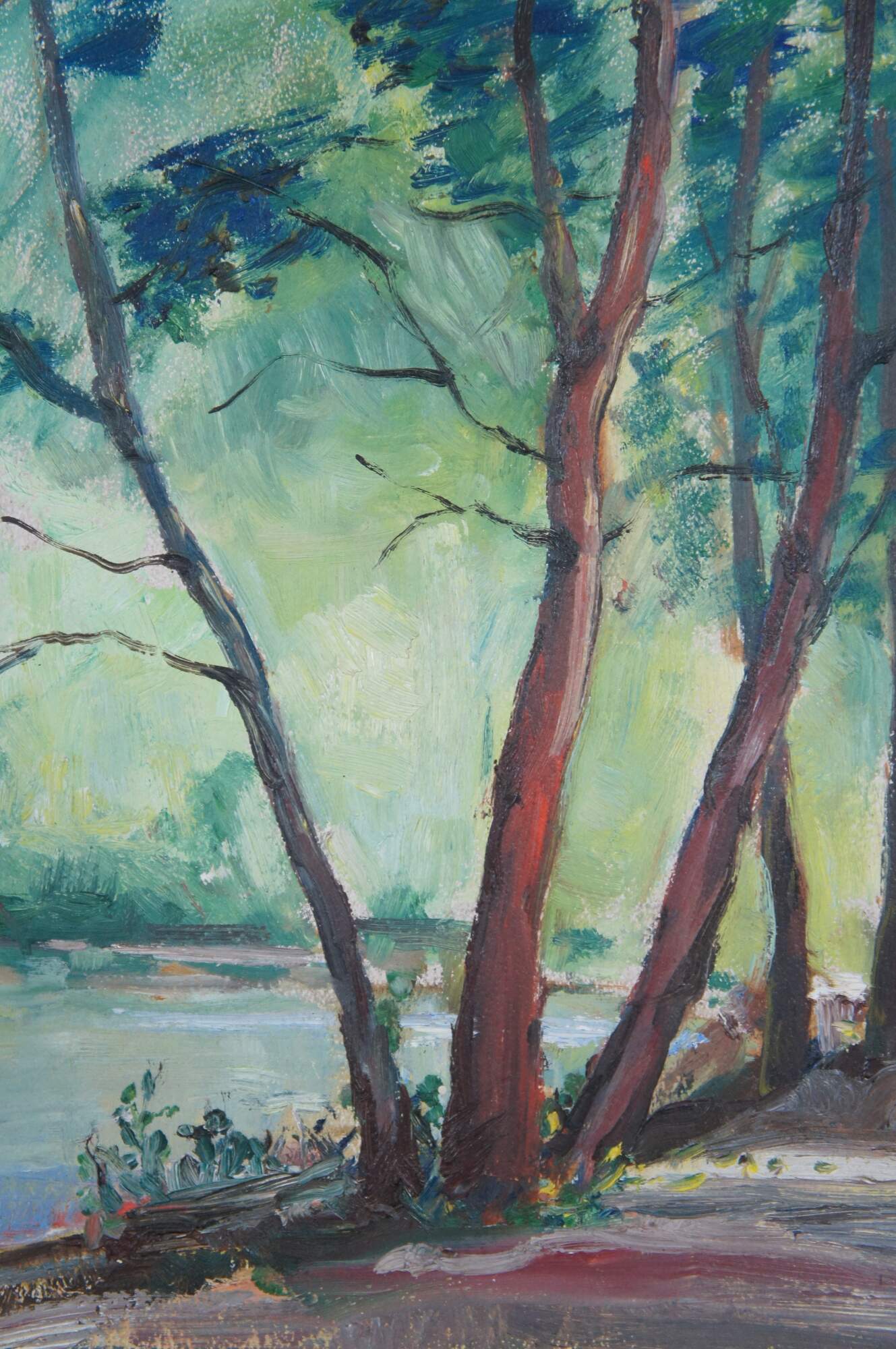 A beautiful Impressionist landscape painting by Elaine Donenfeld from 1962. The oild is painted on board and features a forest setting by the river. Signed lower right. Framed in wood with a red mahogany finish