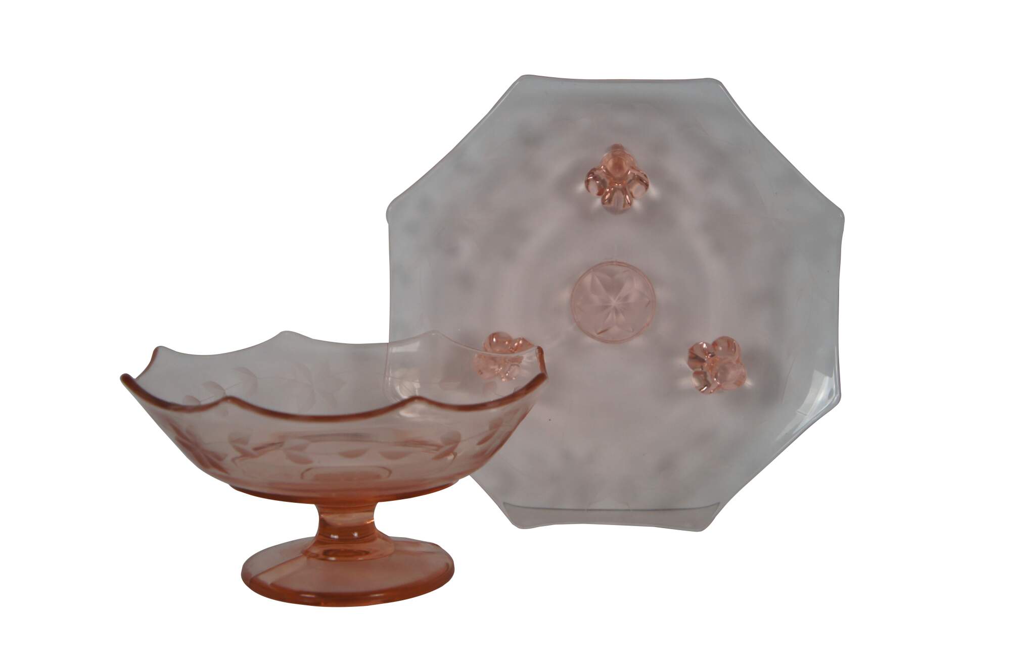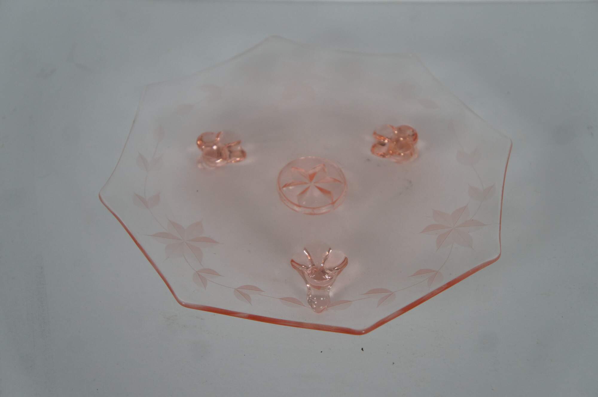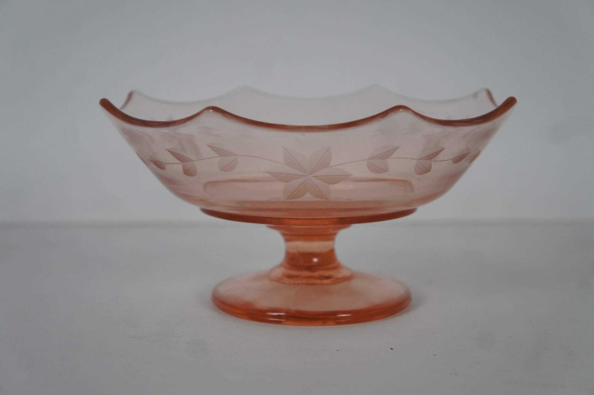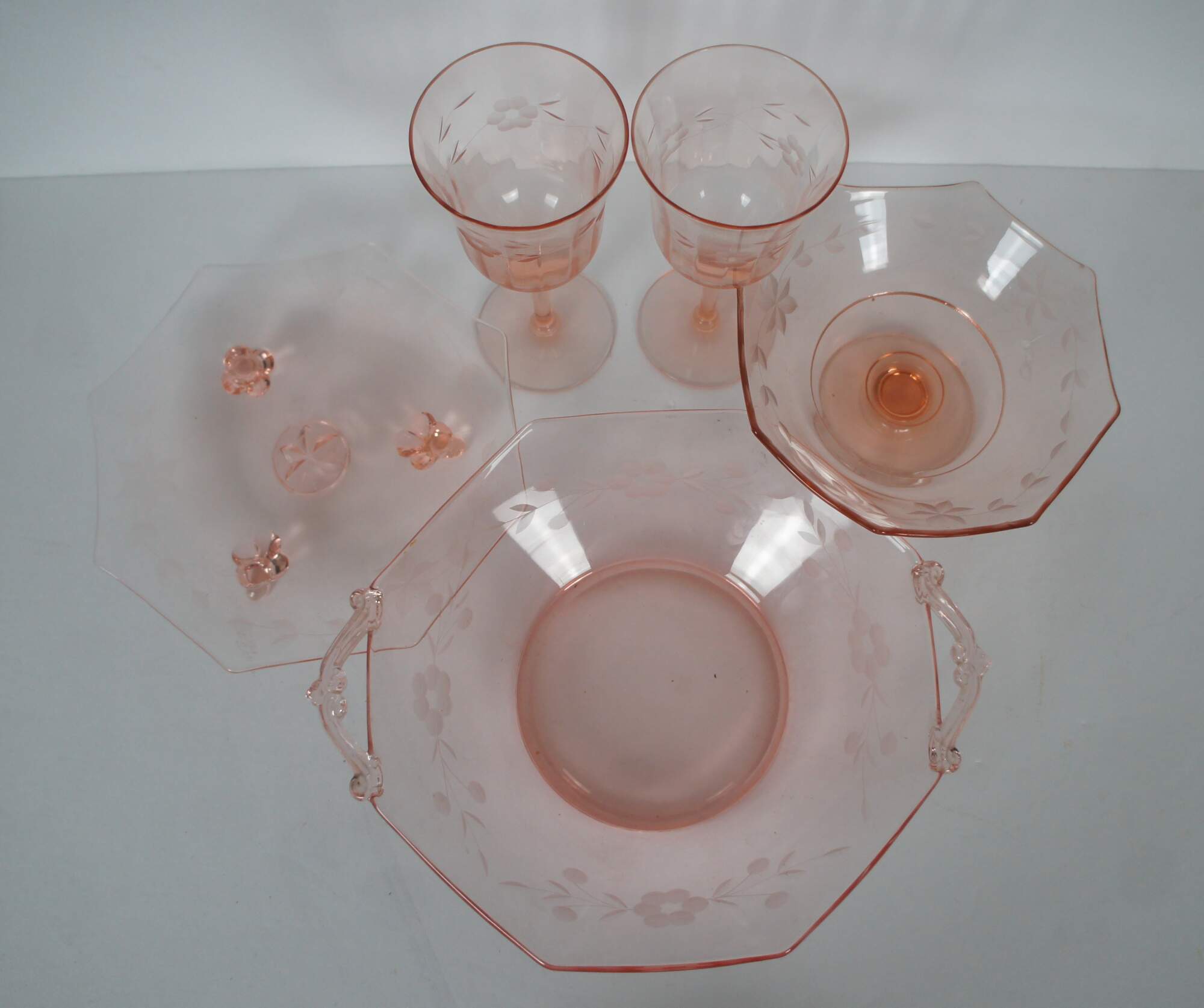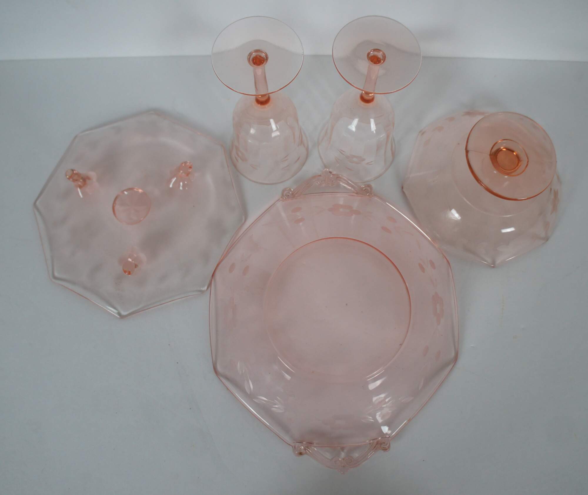 5 Pcs Antique Pink Floral Etched Depression Glass Goblet Compote Tray Stand