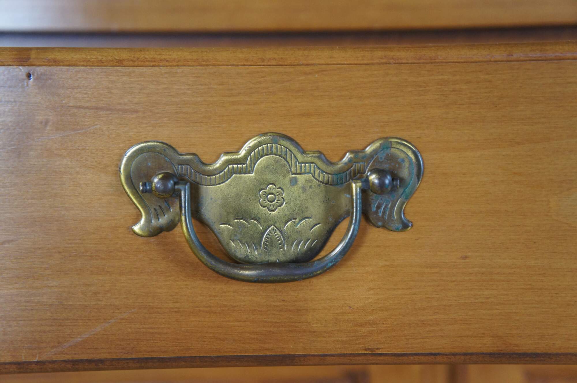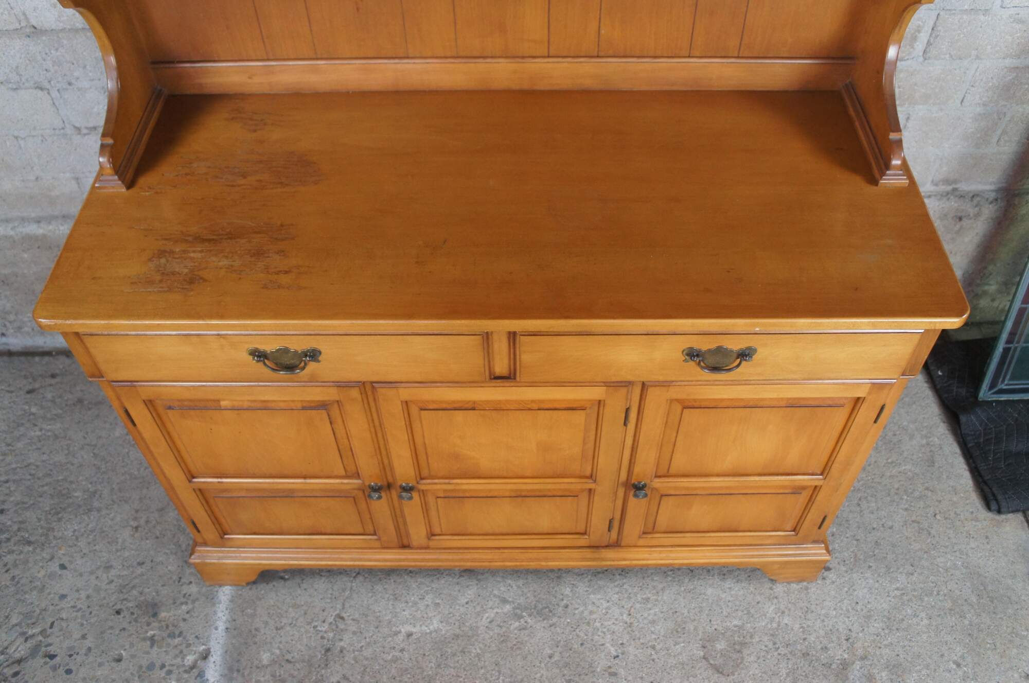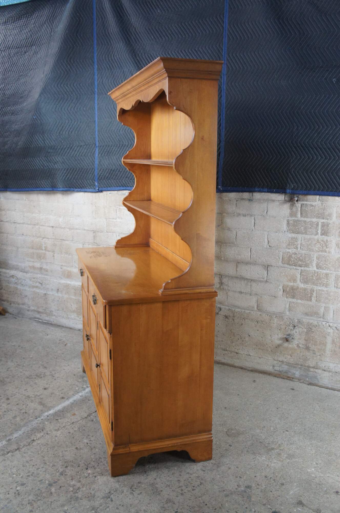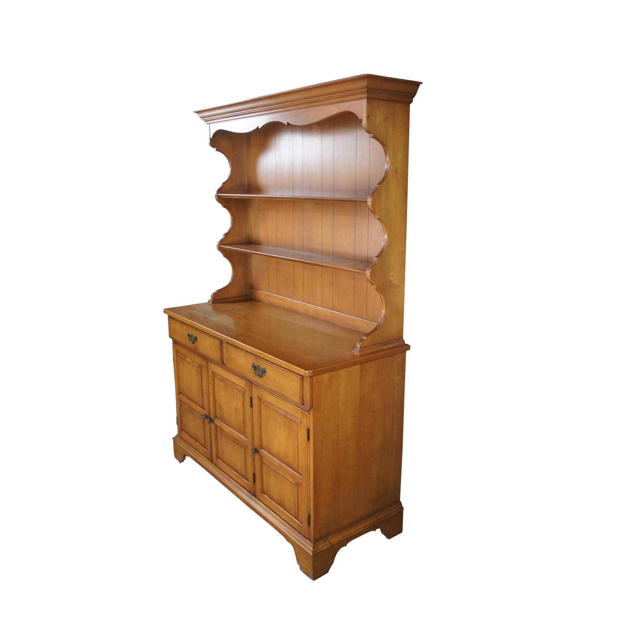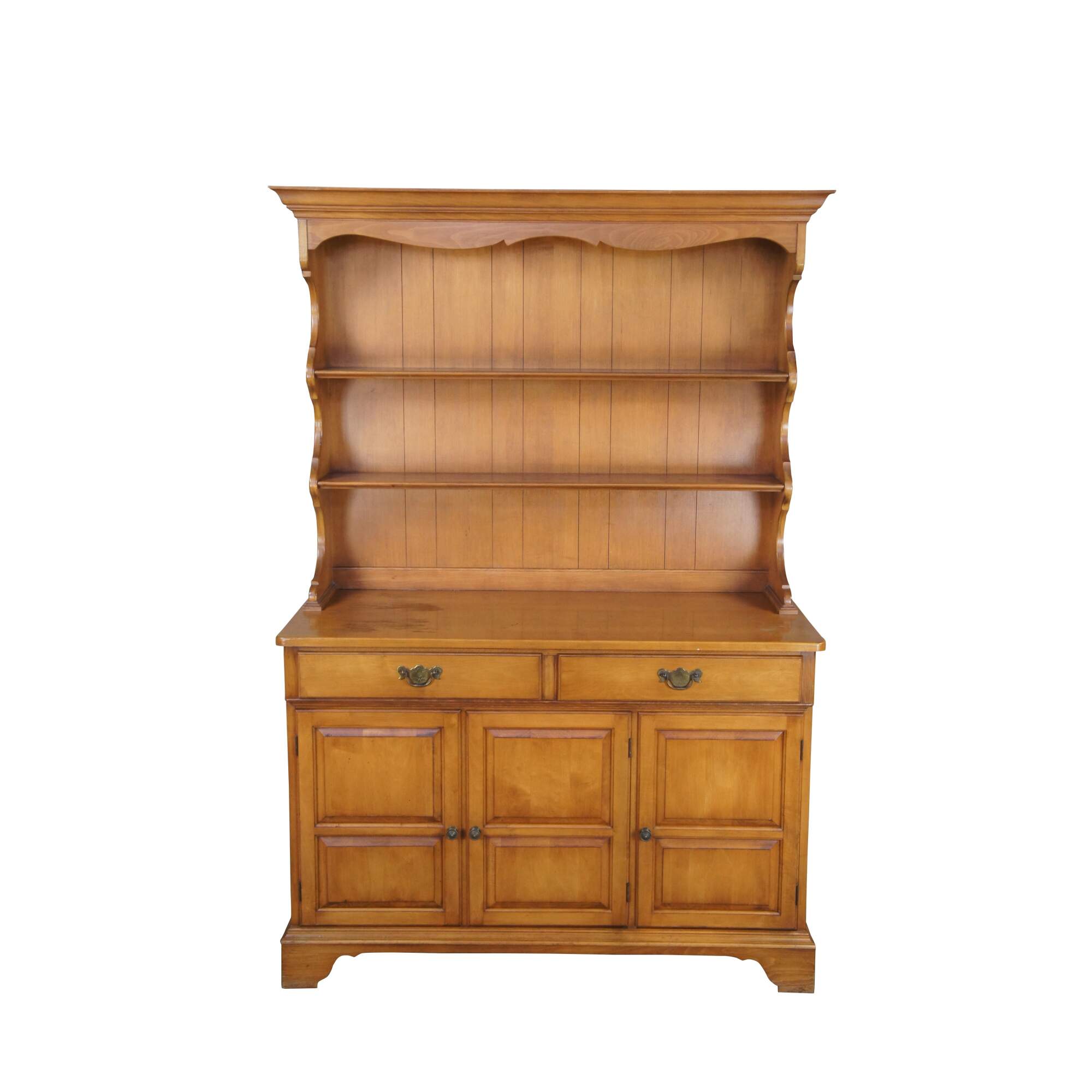 An Early American Colonial style cupboard by Pennsylvannia House, circa 1970s. Made from maple with a serpentine hutch featuring a panelled back and two shelves with plate grooves. Buffet portions has two upper drawers for flatware storage and a lower cabinet with shelf. The case is supported by bracket feet. No-9646, Porestone finish.