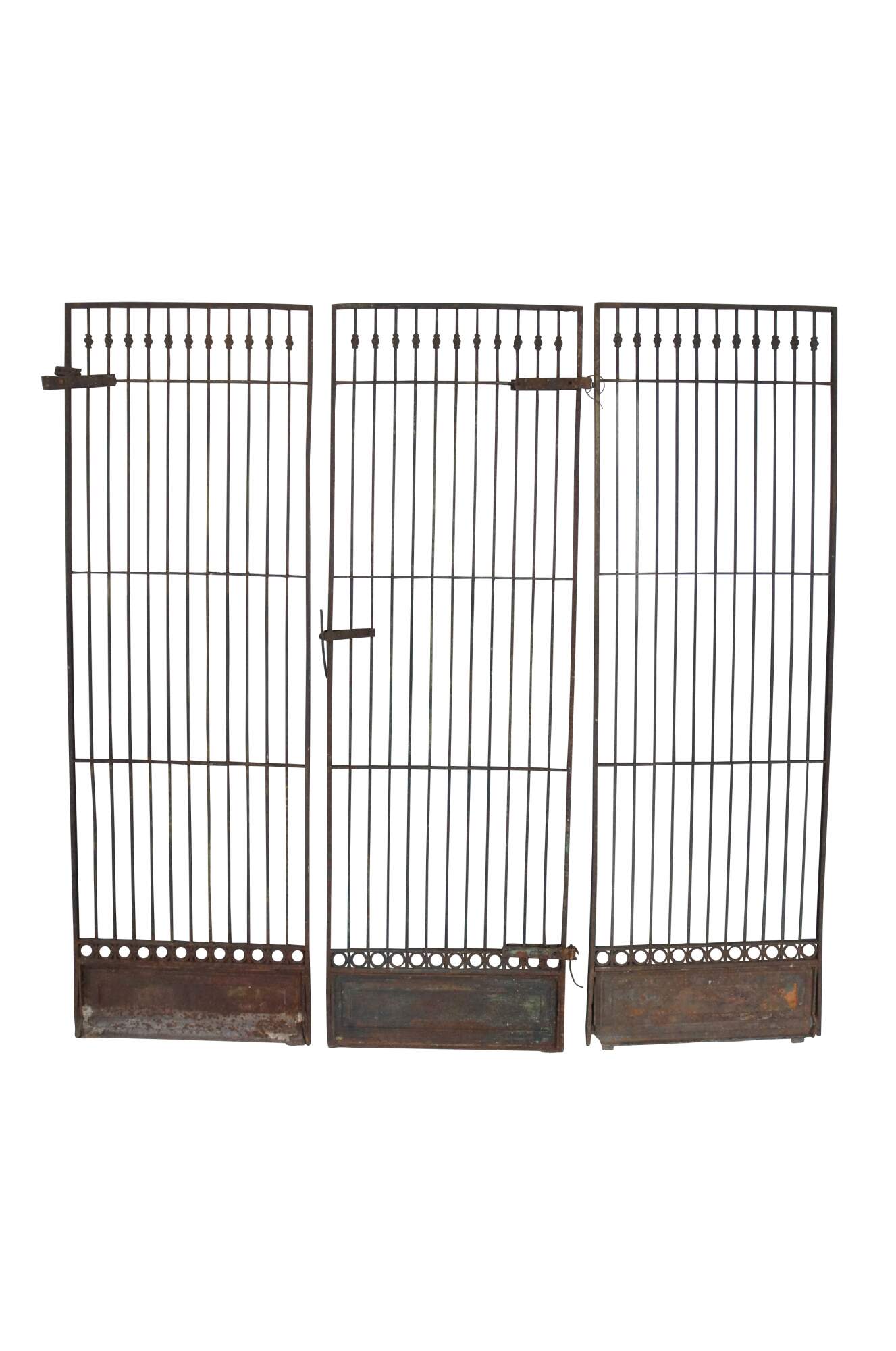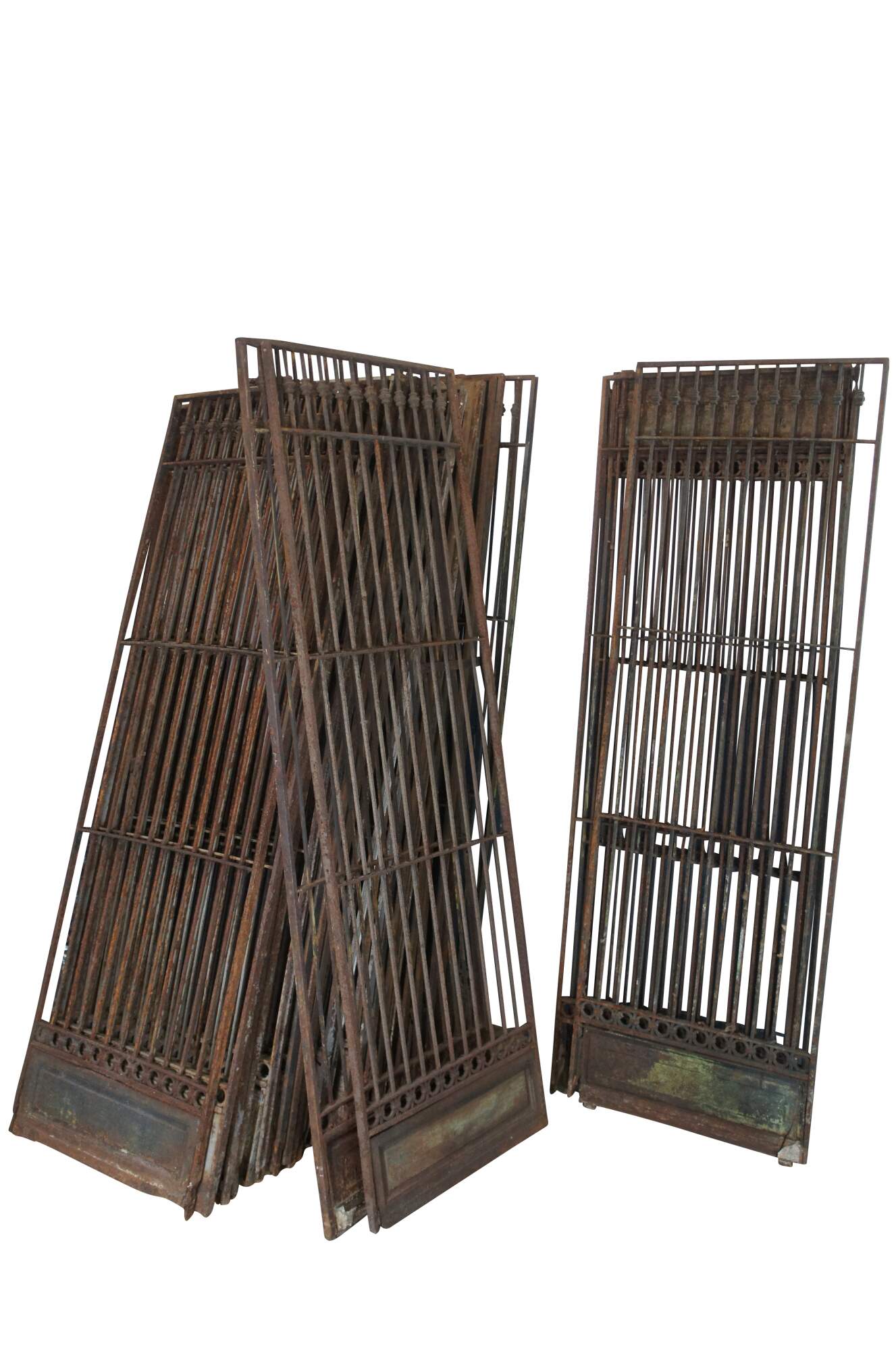 Intriguing set of 37 antique Victorian Era reclaimed architectural garden fence grates. Made from Iron with ornate Neoclassical styling. Each door or panel features squared off vertical posts offset by rungs. The bases have an inset panel below a row of rings. Great for use as fencing or a doorway.