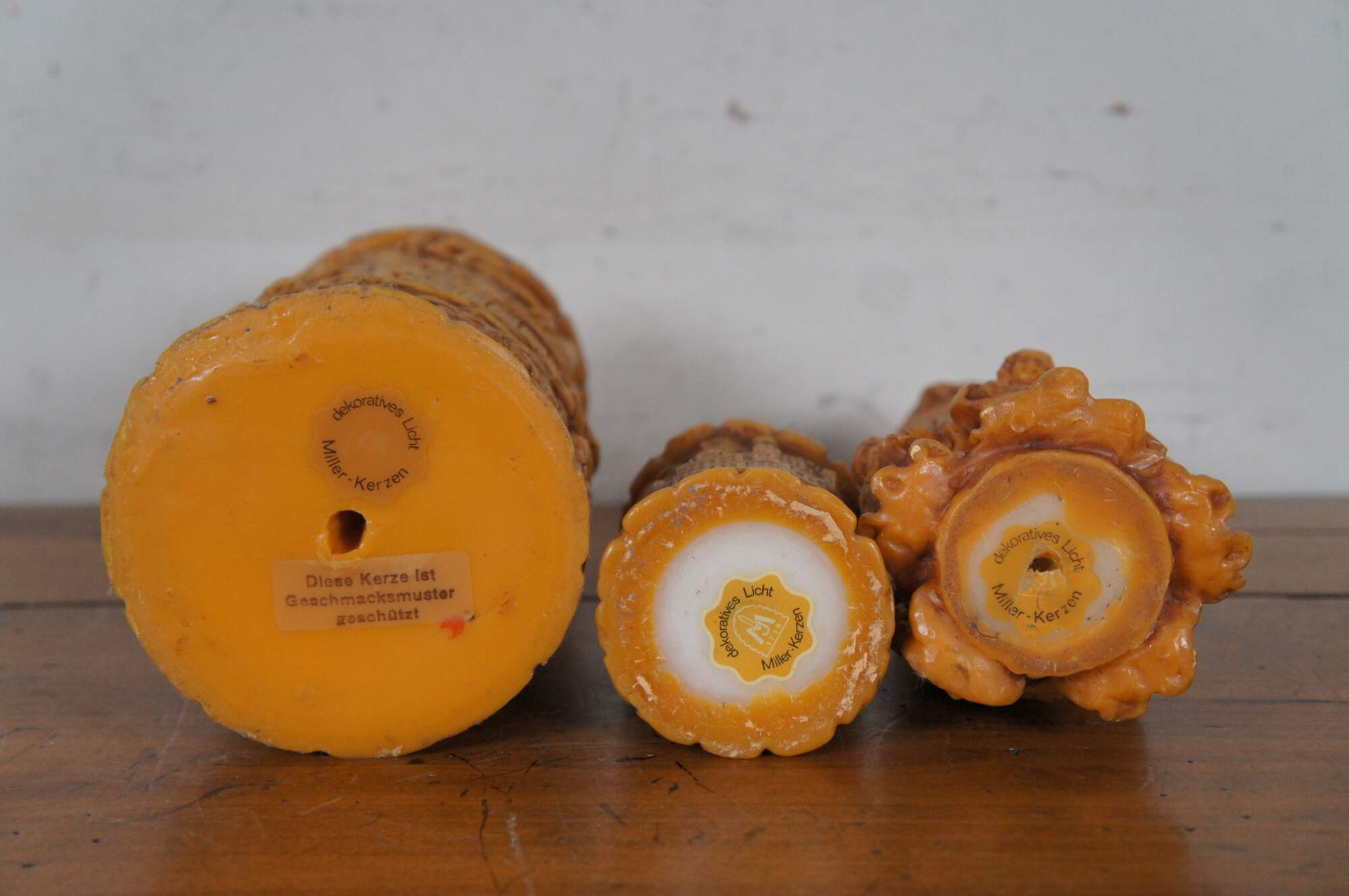 3 Vintage German candles by Miller-Kerzen. Features a Renaissance tavern scene, Augsberg-Steinmann cityscape, and one featuring a choir of angels under a starry sky.