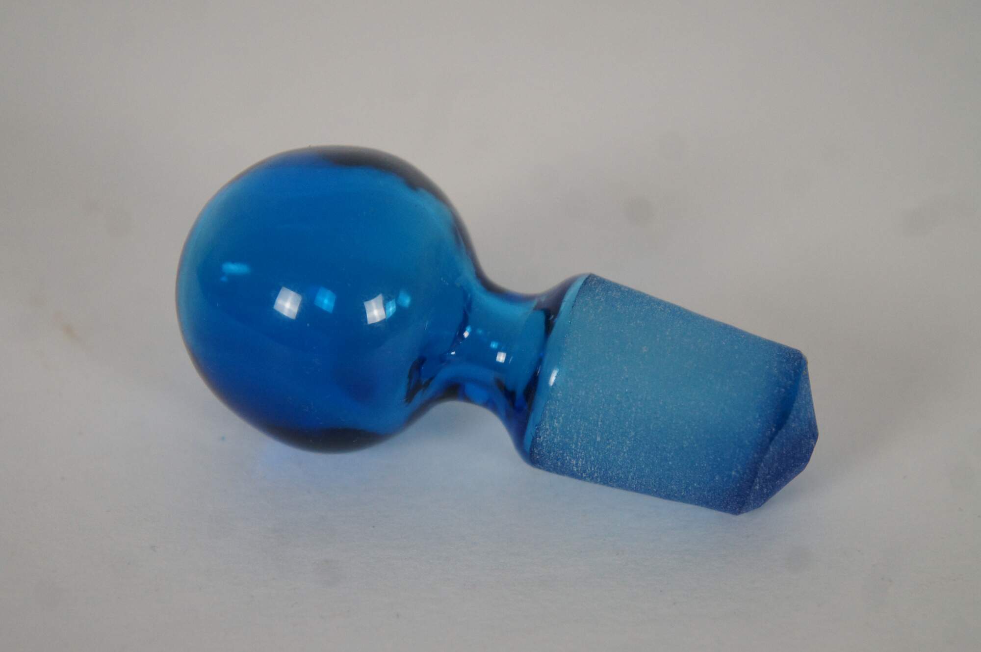 Mid century hand blown Czechoslovakian / Bohemian blue glass decanter and six cordial shot glasses featuring a stopper and spout.