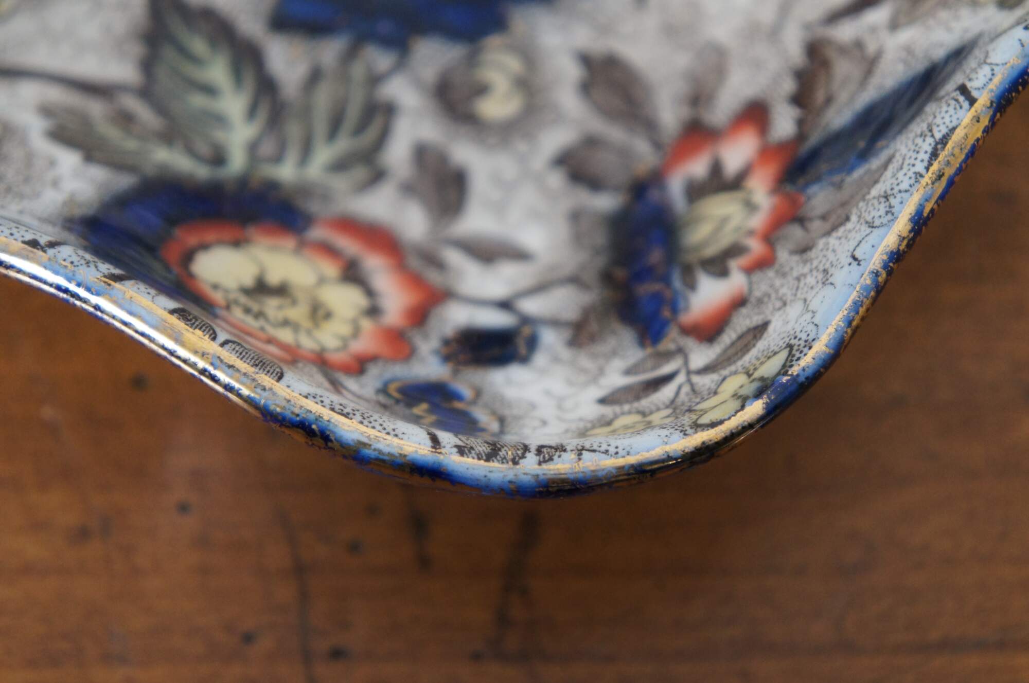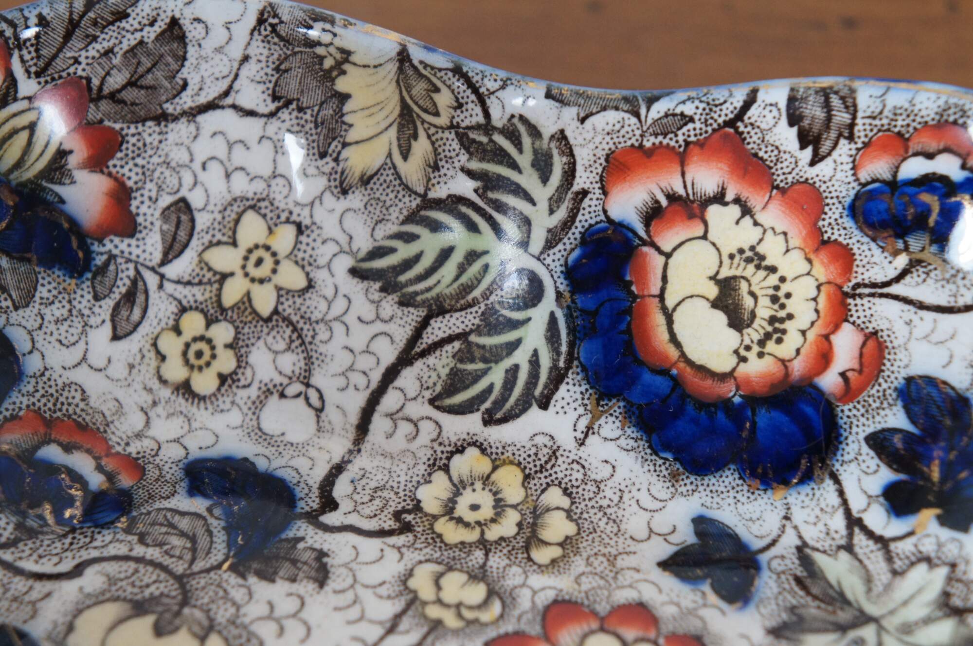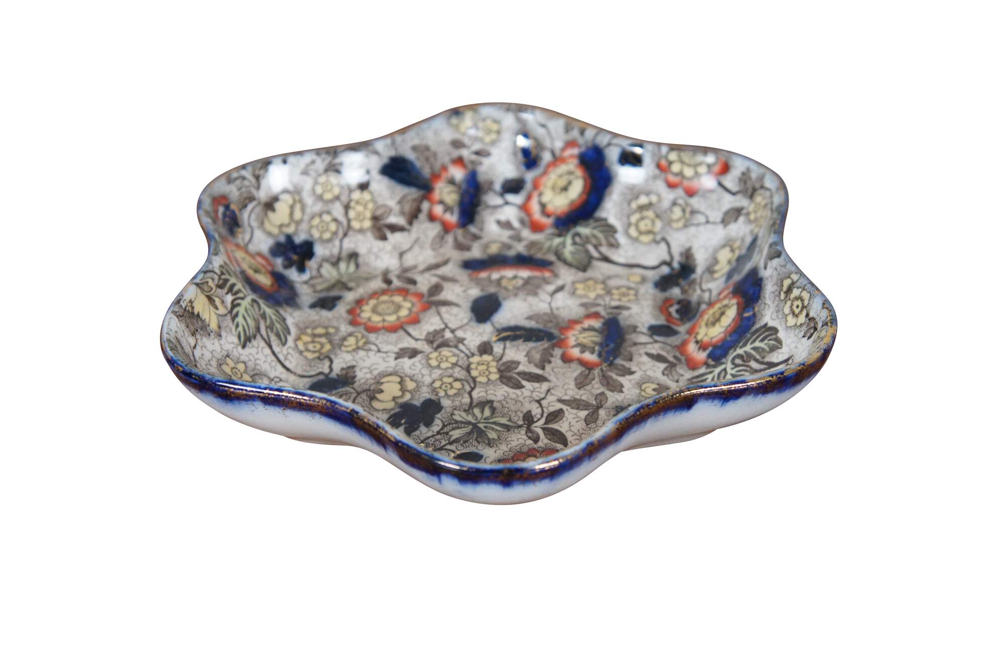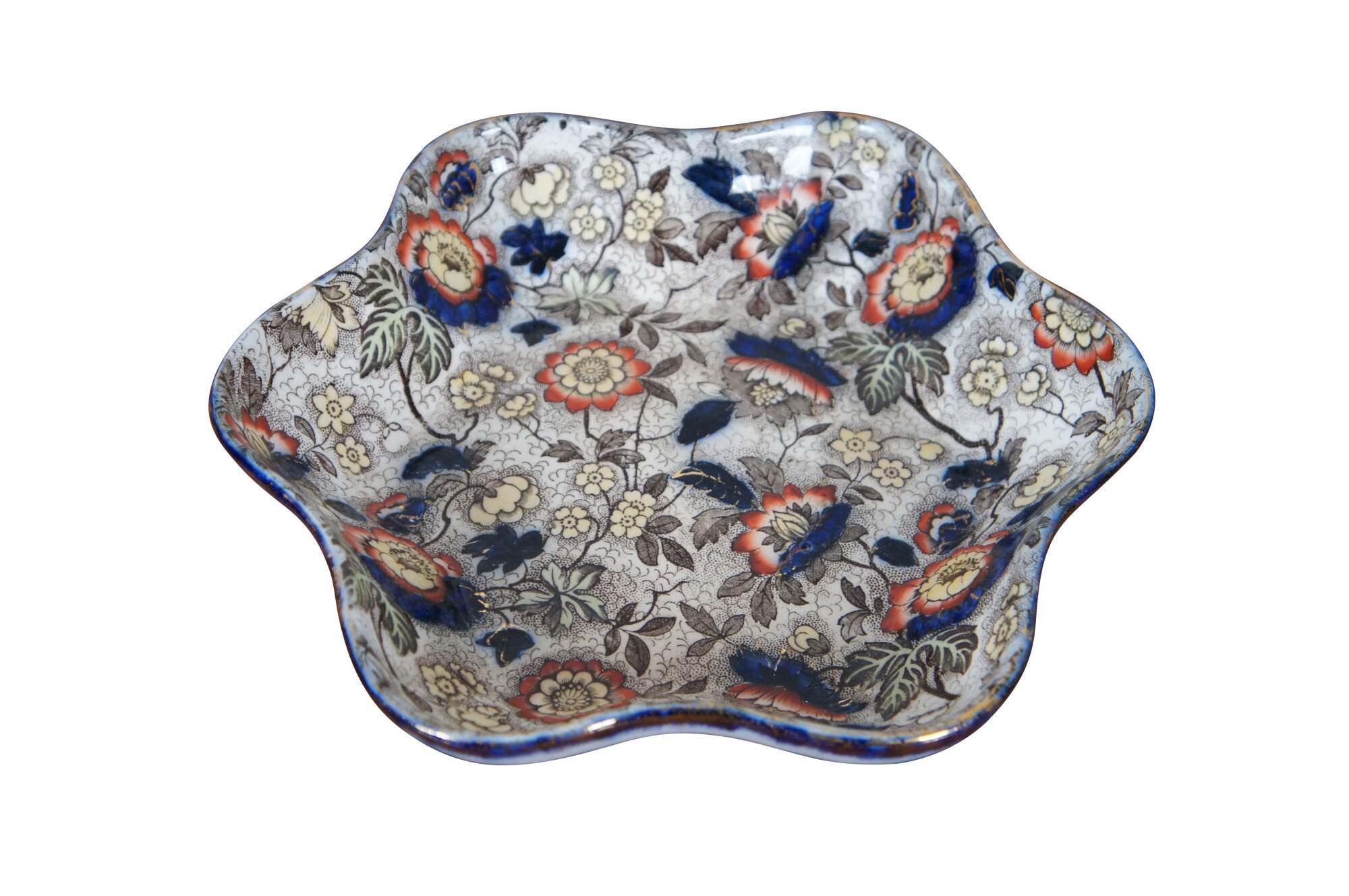 Antique Japanese Imari serving dish or bowl featuring a hexagonal freeform ruffled serpentine edge with floral motif. Attributed to Hollinshead & Kirkham. Marked 3092 P on base.