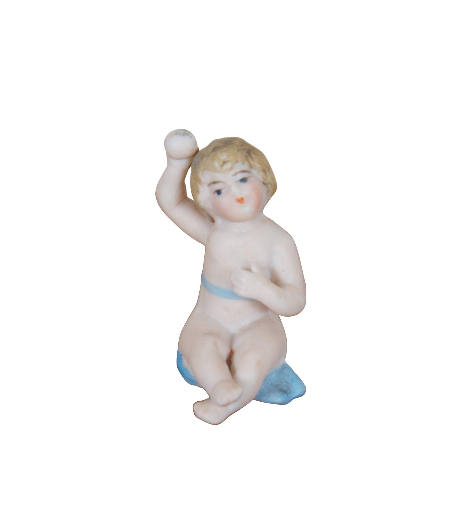 Pair of circa early 20th century un-glazed bisque porcelain cherub / angel figurines with hand painted loin cloths and features. The larger one has green wings accented with gold. The smaller one (missing his wings) is marked 00651 on base.