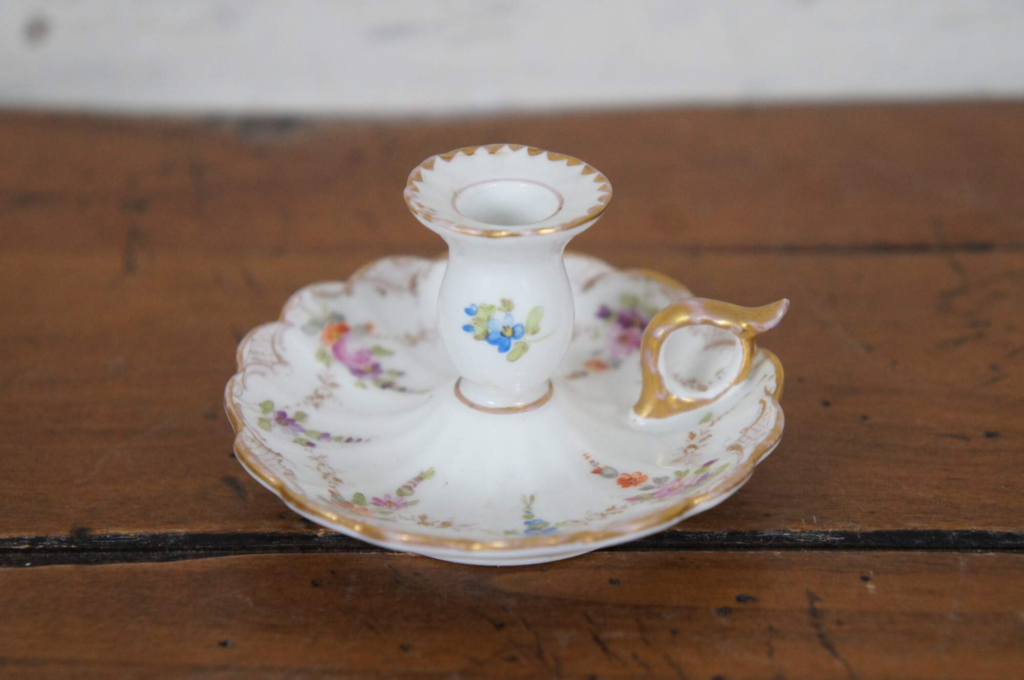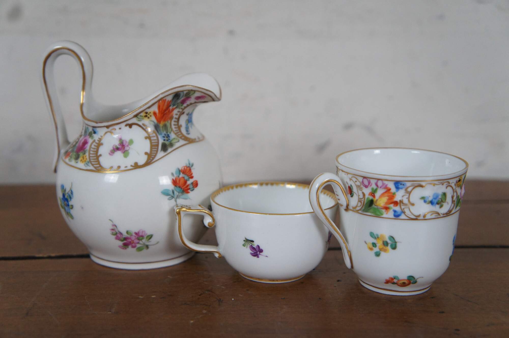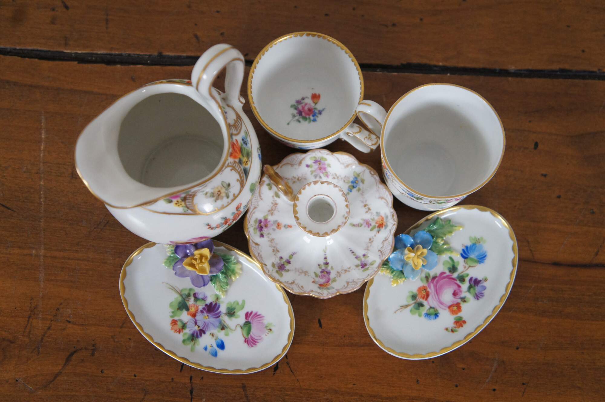 Antique lot includes creamer, demitasse cup, and two bone dishes by Dresden, one demitasse cup by Meissen, and one candlestick by Klemm.