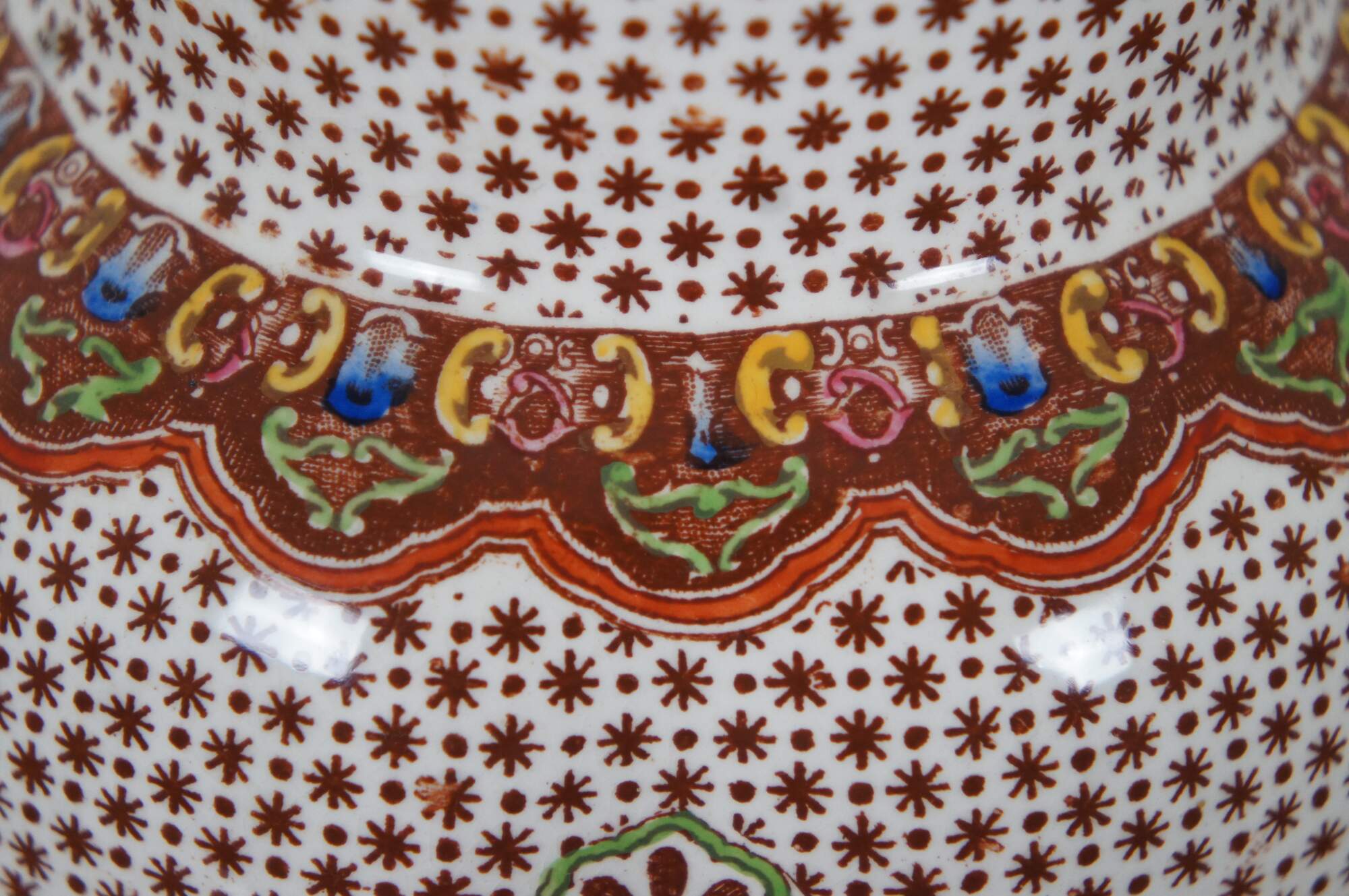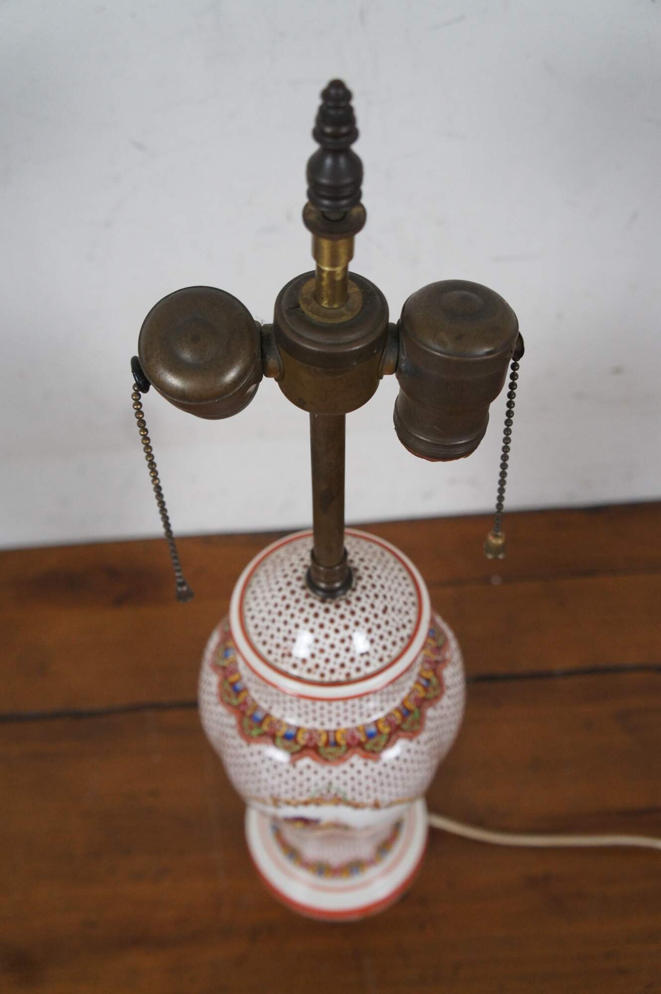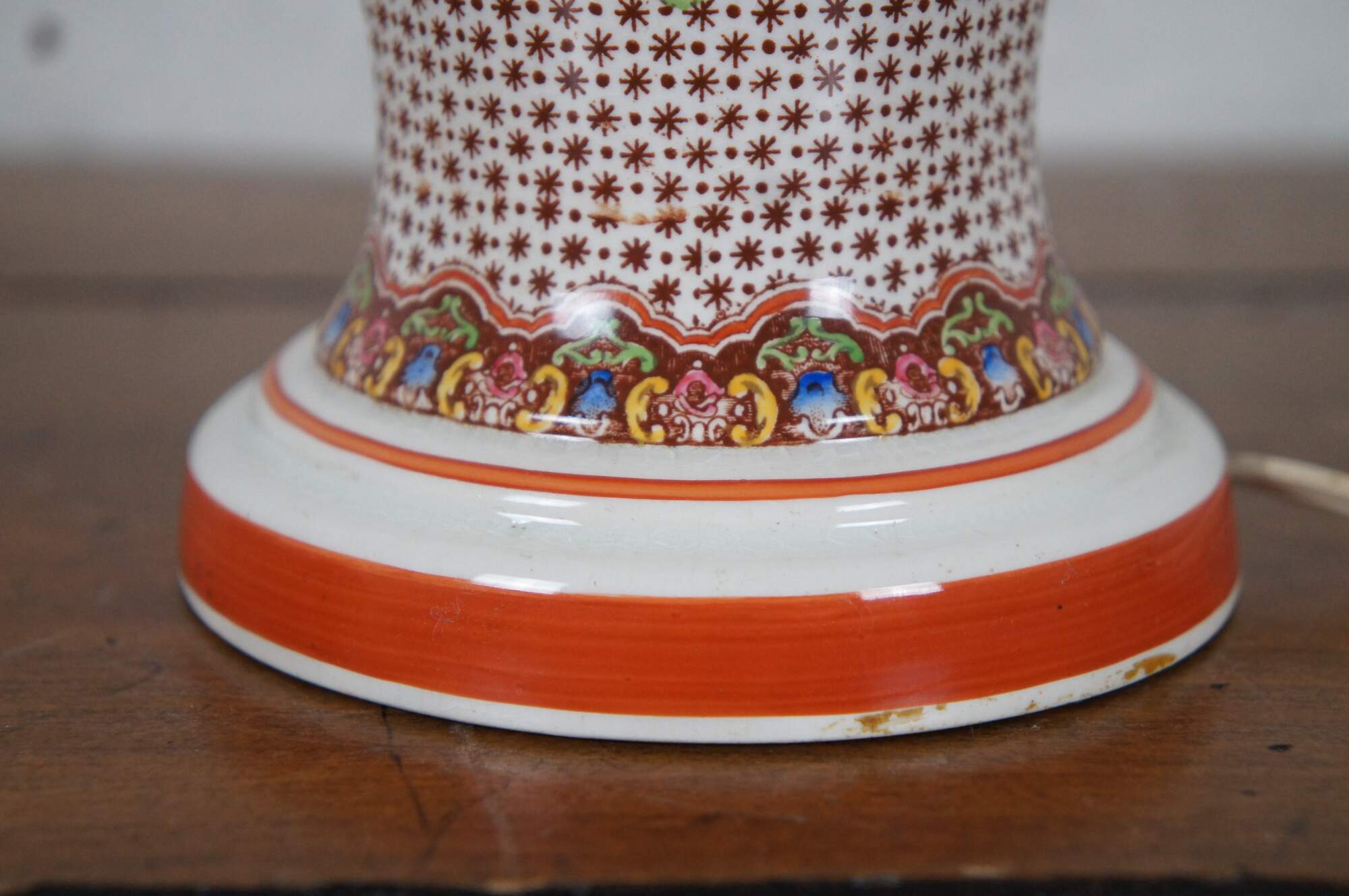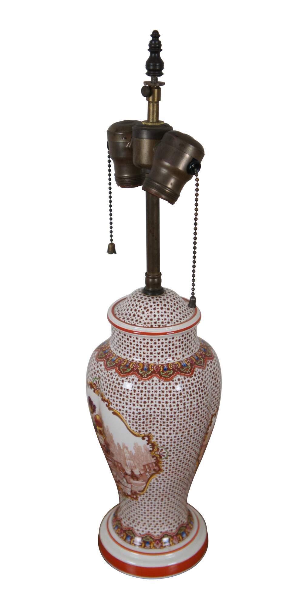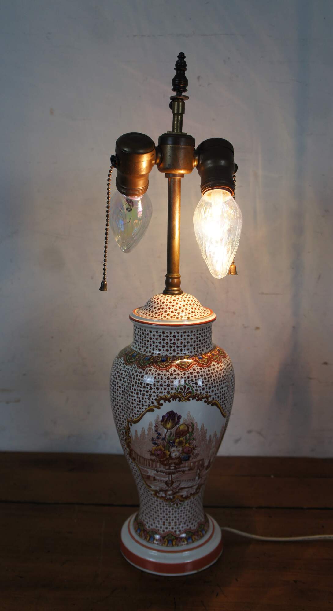 Vintage porcelain transferware two light table lamp featuring a ginger jar or mantel urn with still life landscape scene of a table with a colorful bouquet of flowers at the center of a magnificent garden.