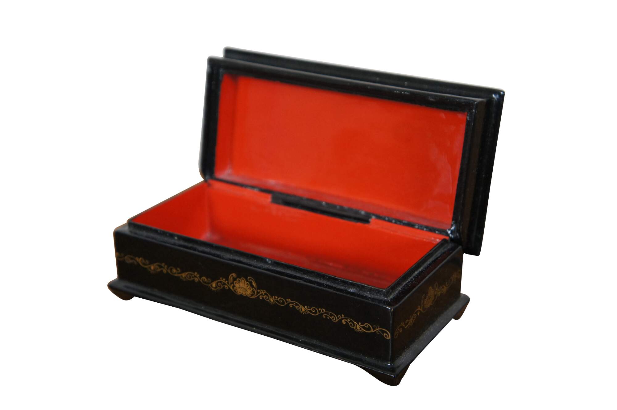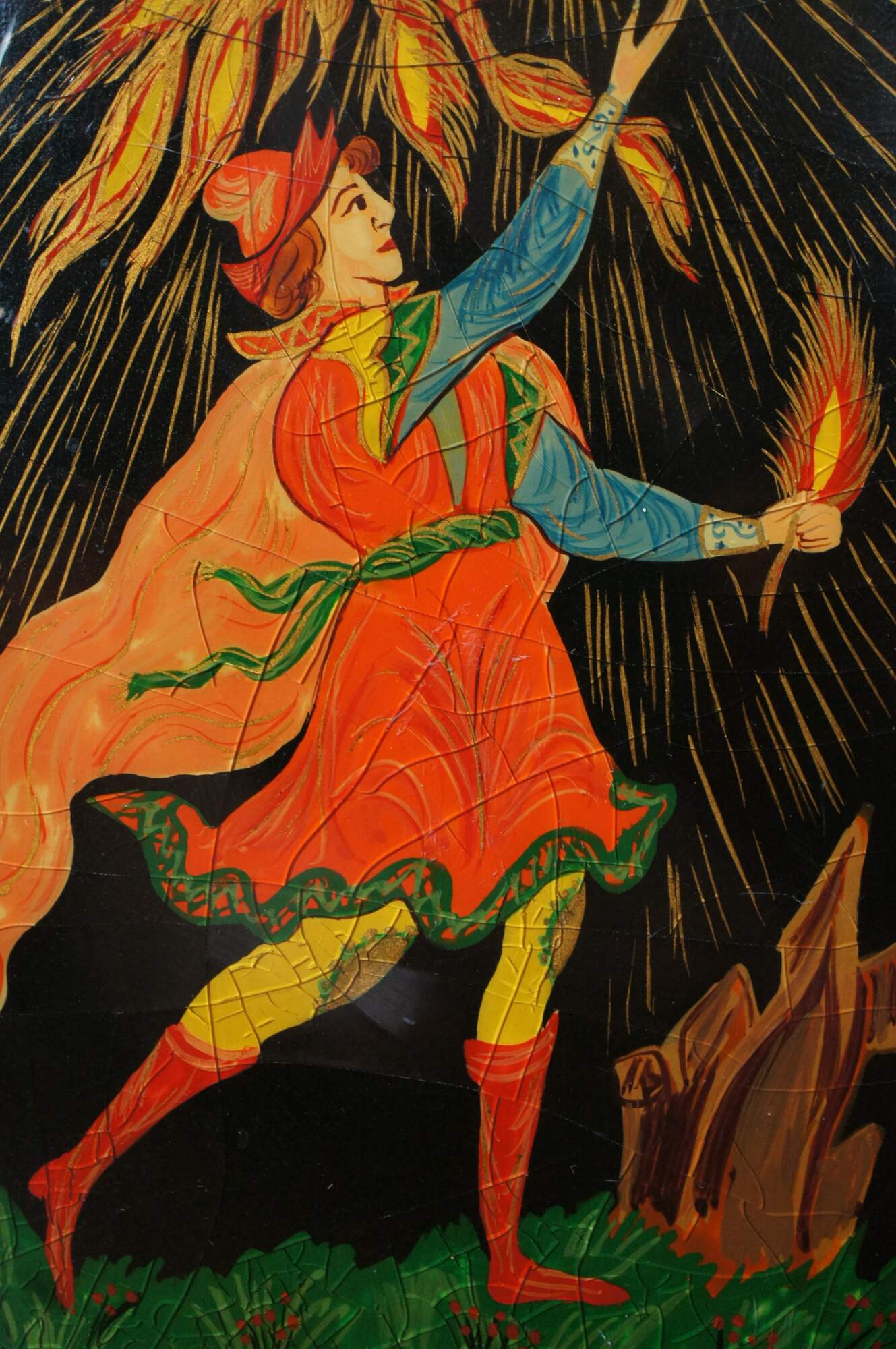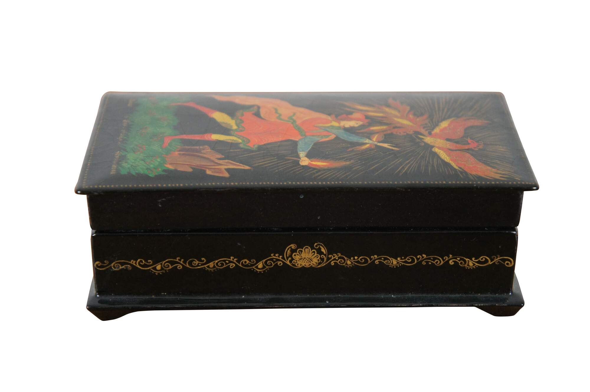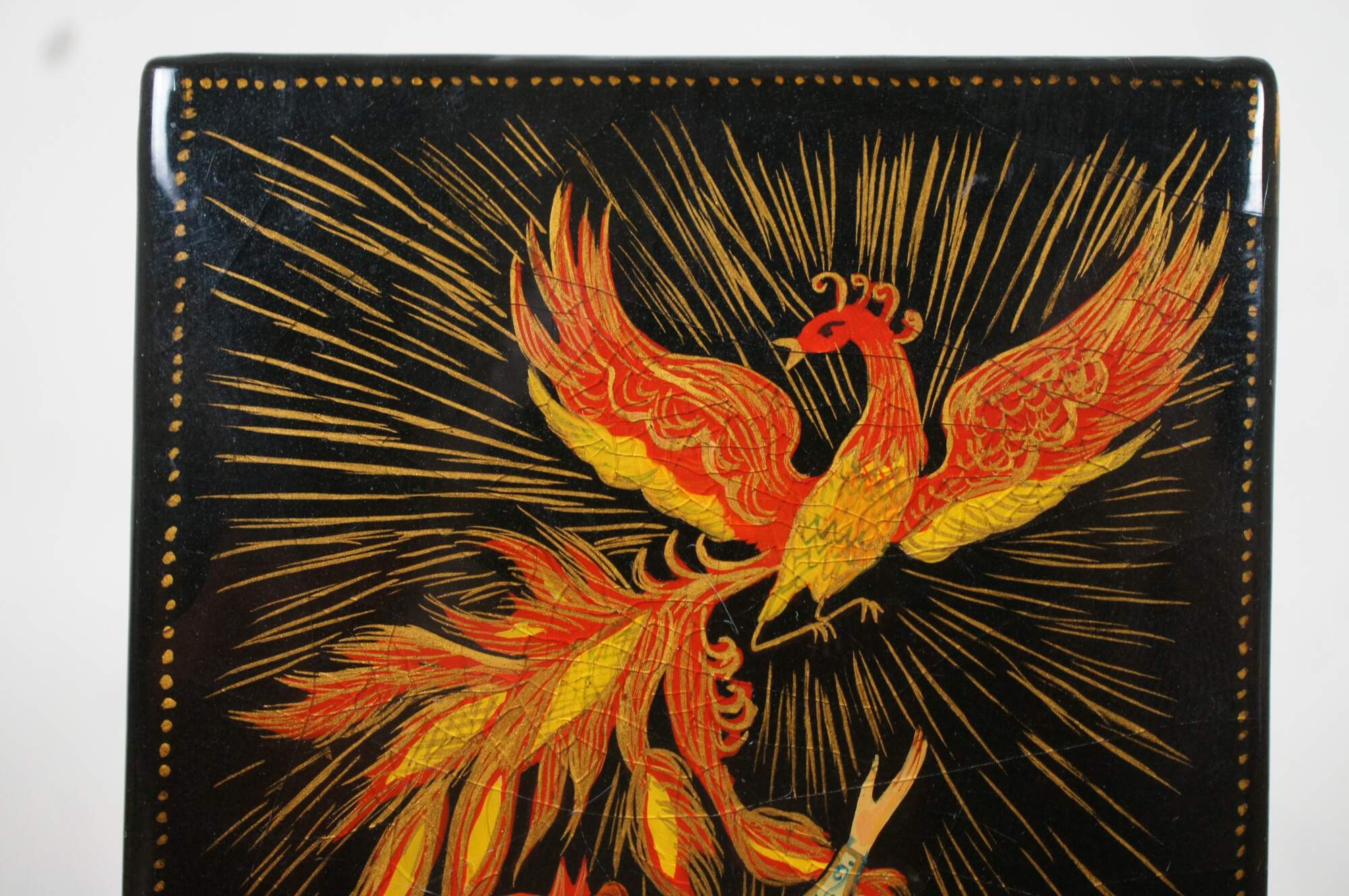Vintage USSR Russian Firebird folklore / fairy tale keepake trinket box featuring hinged lid, footed base and red interior.