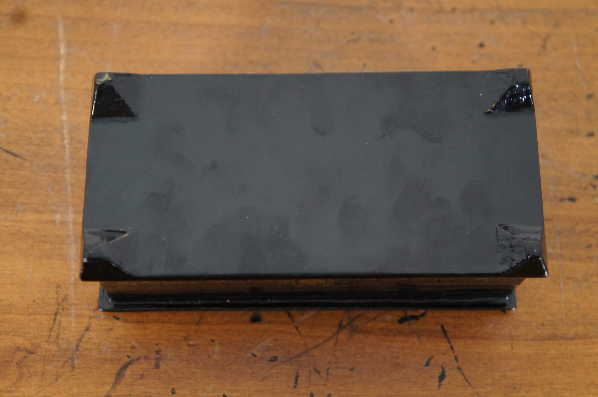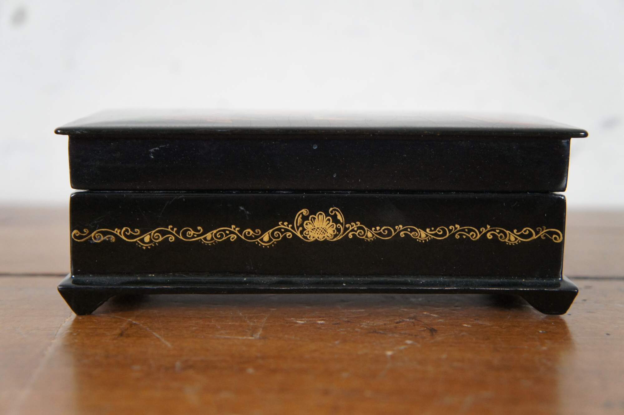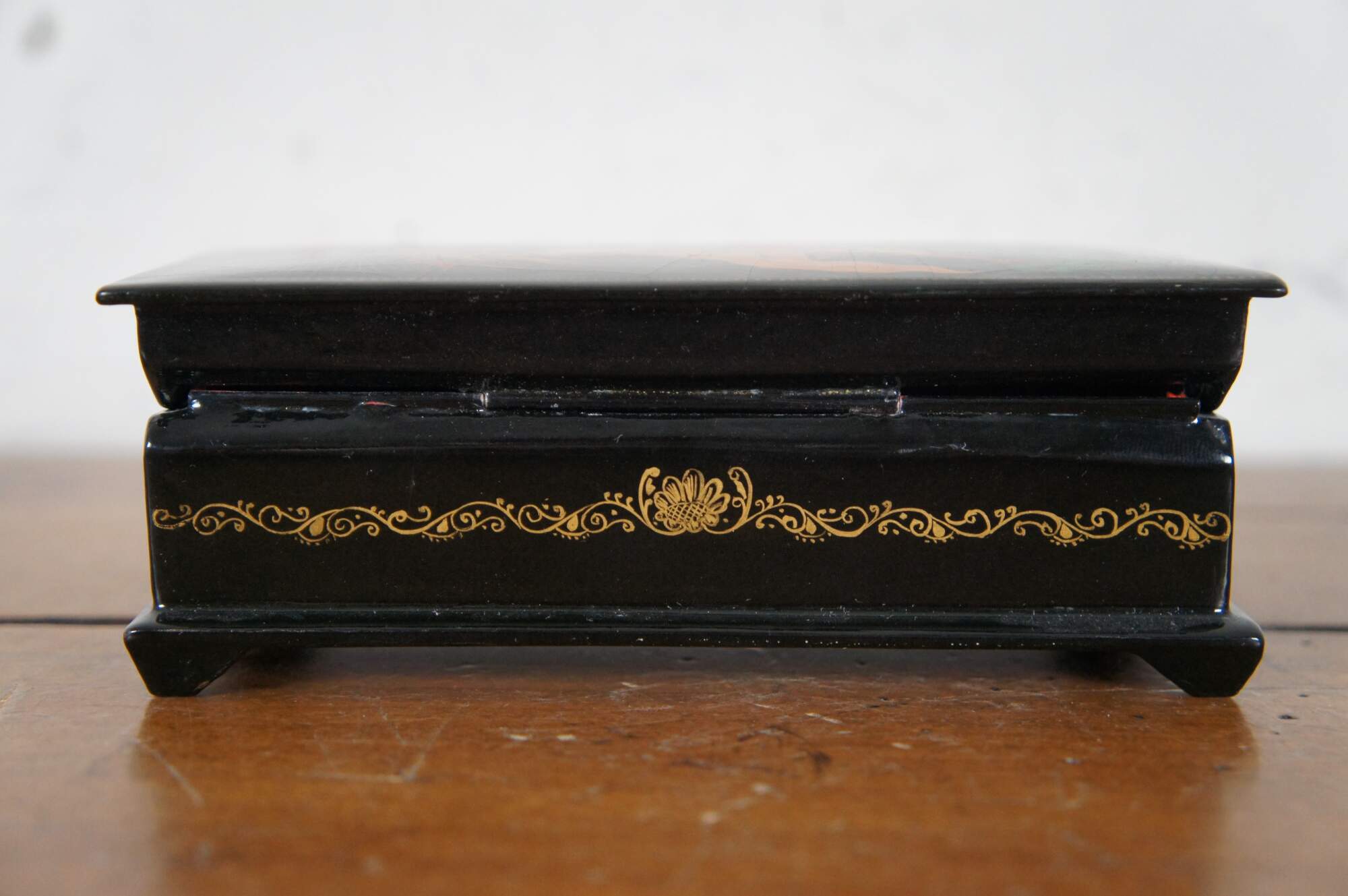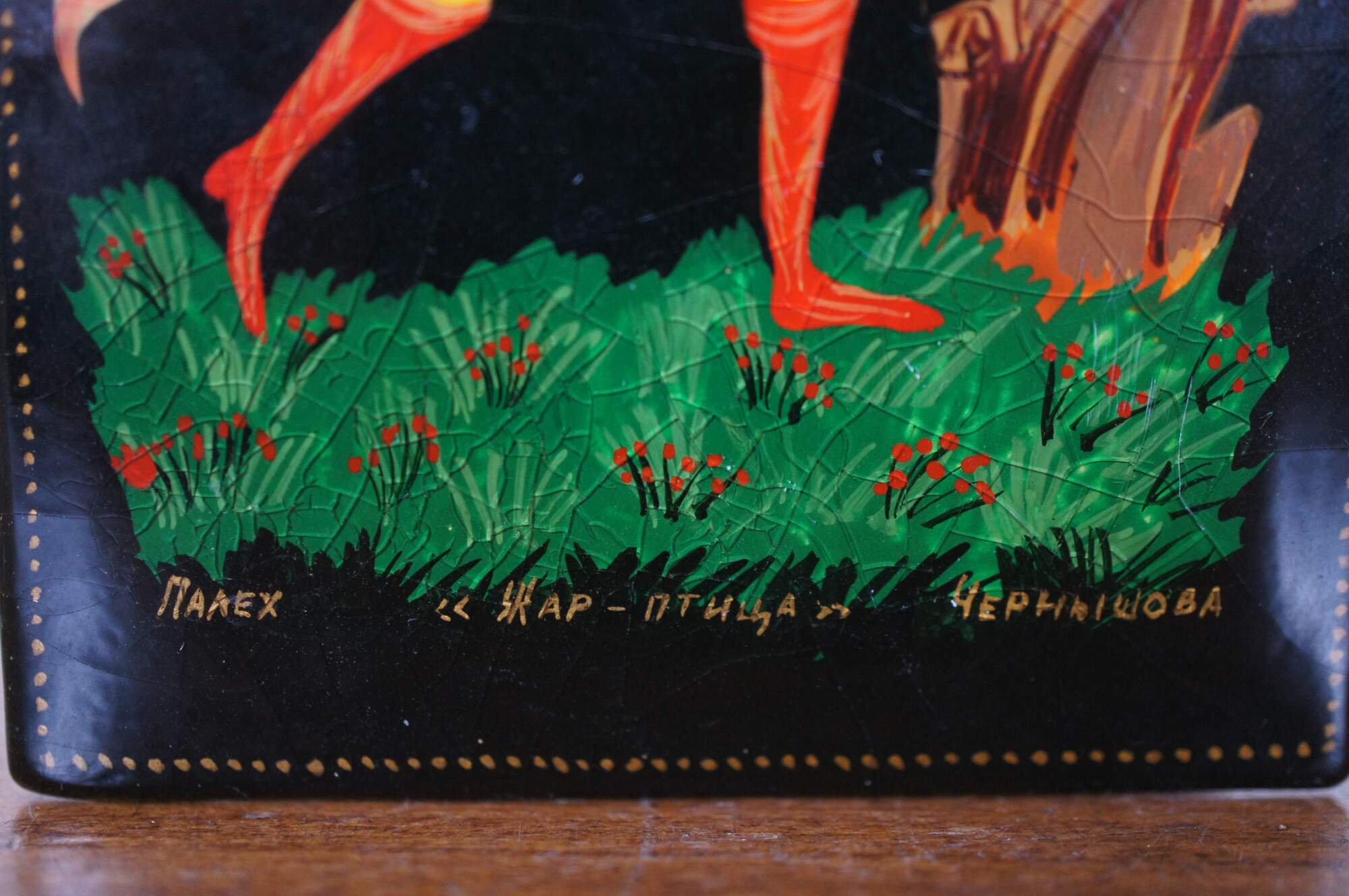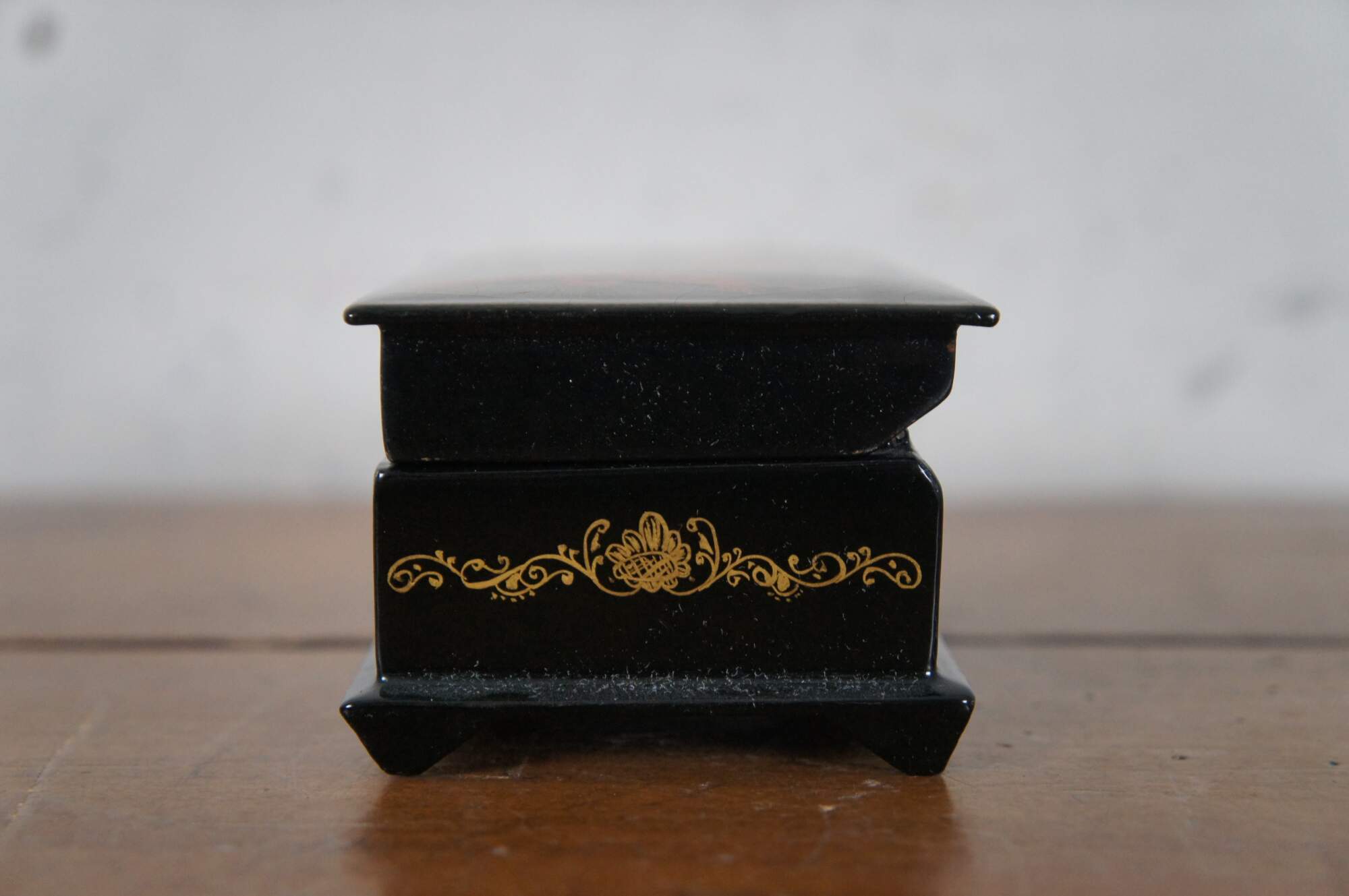 Vintage USSR Russian Firebird folklore / fairy tale keepake trinket box featuring hinged lid, footed base and red interior.