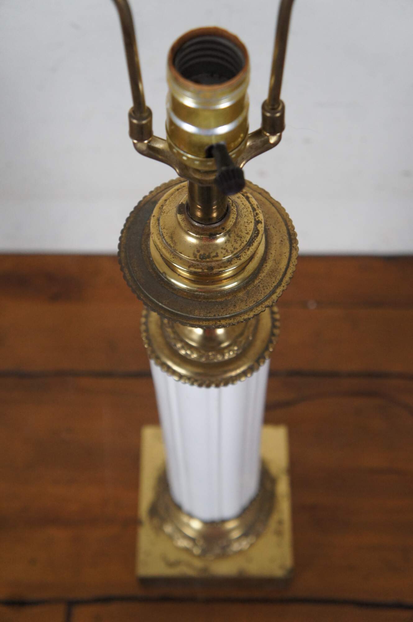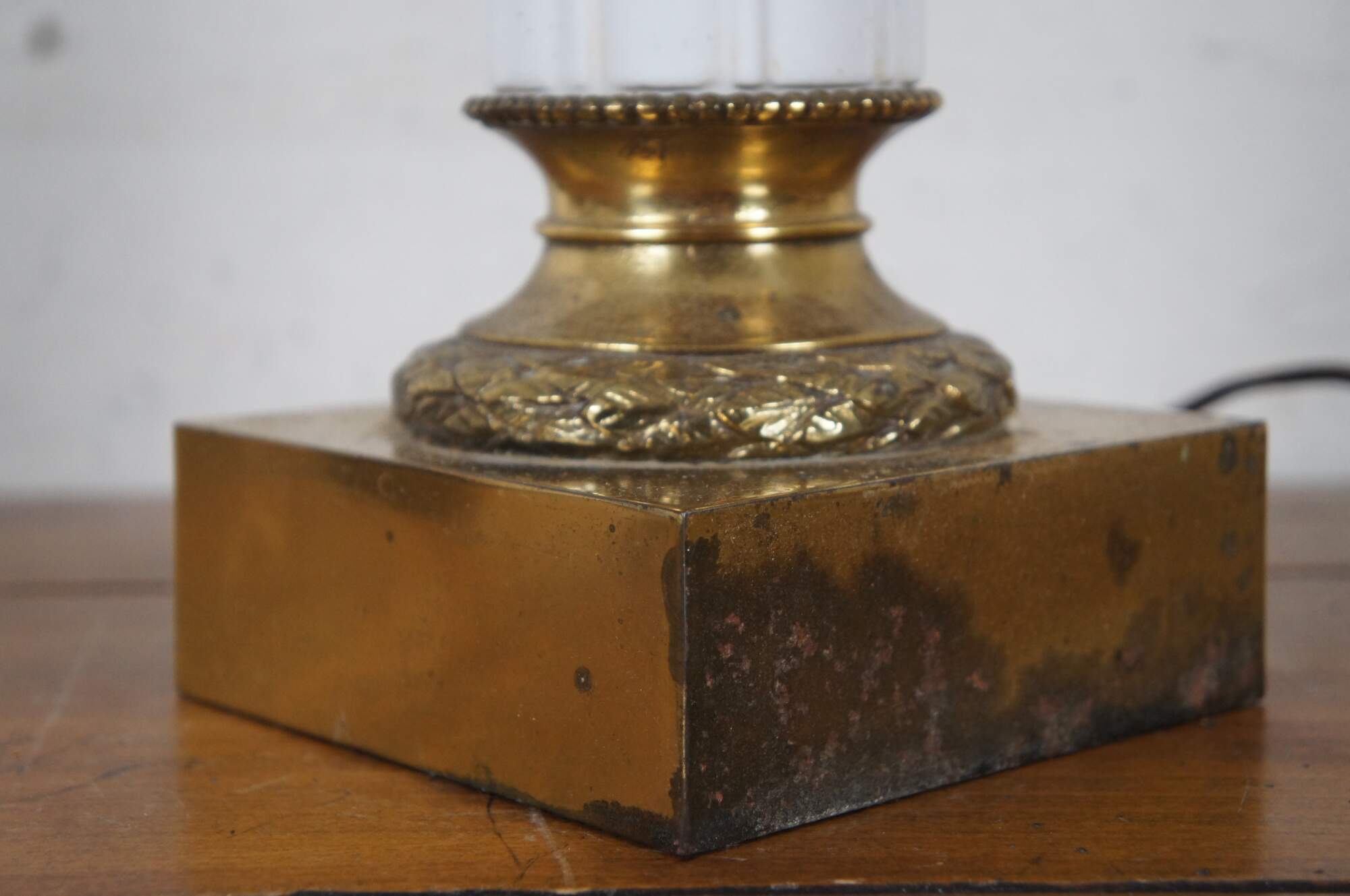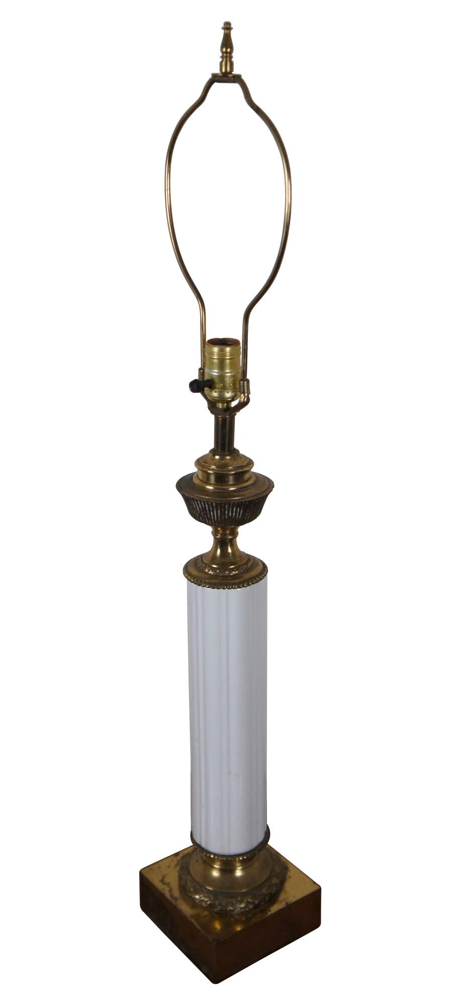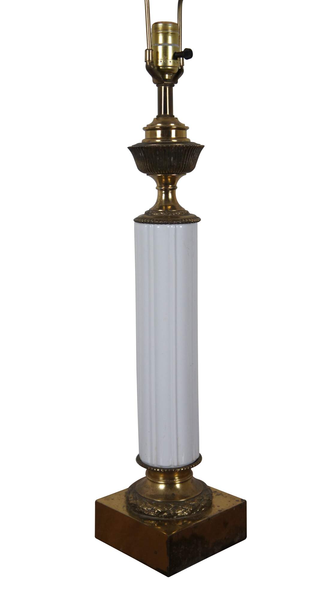 Vintage Tyndale brass and milk glass table lamp featuring Neoclassical styling.