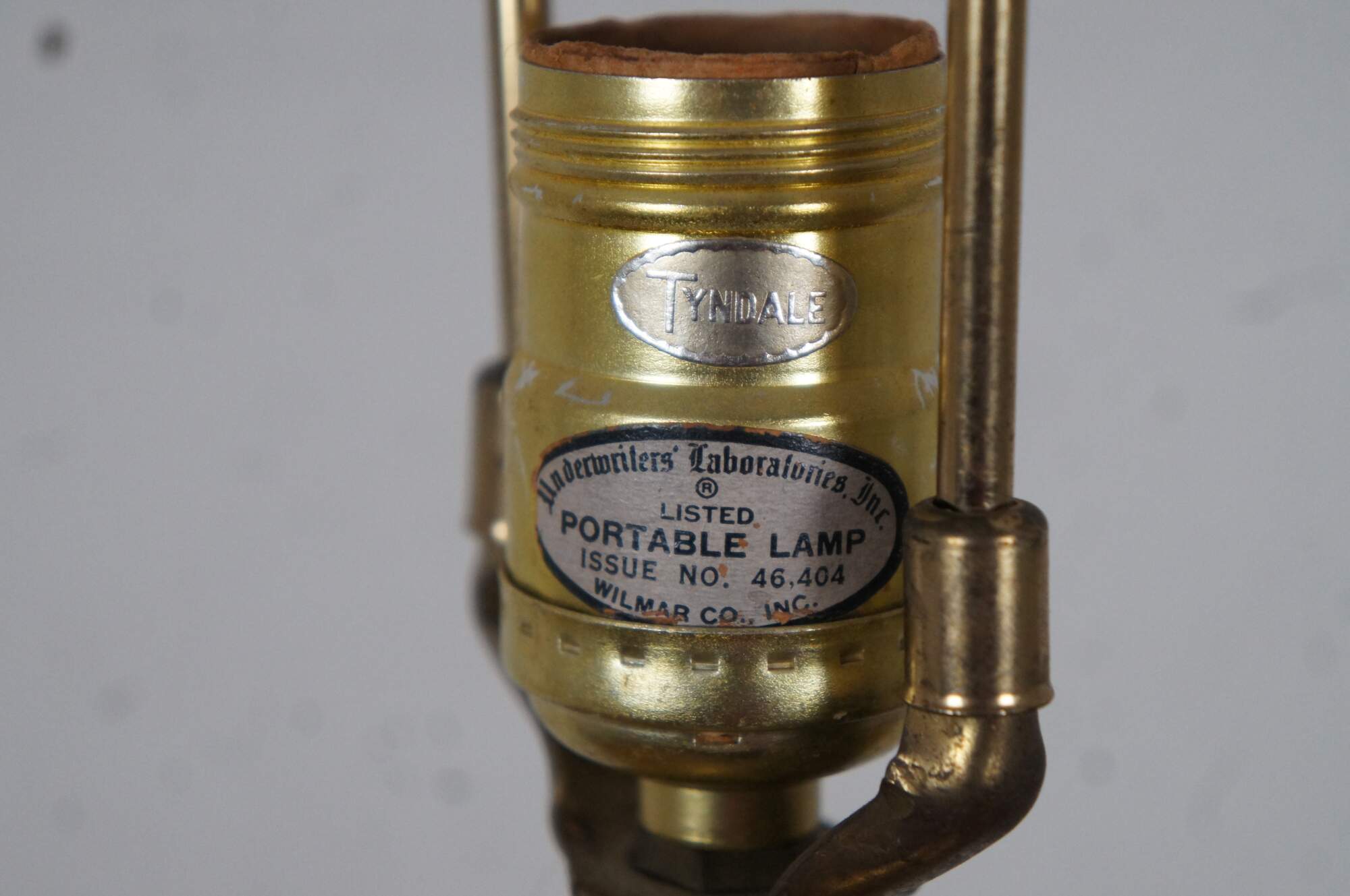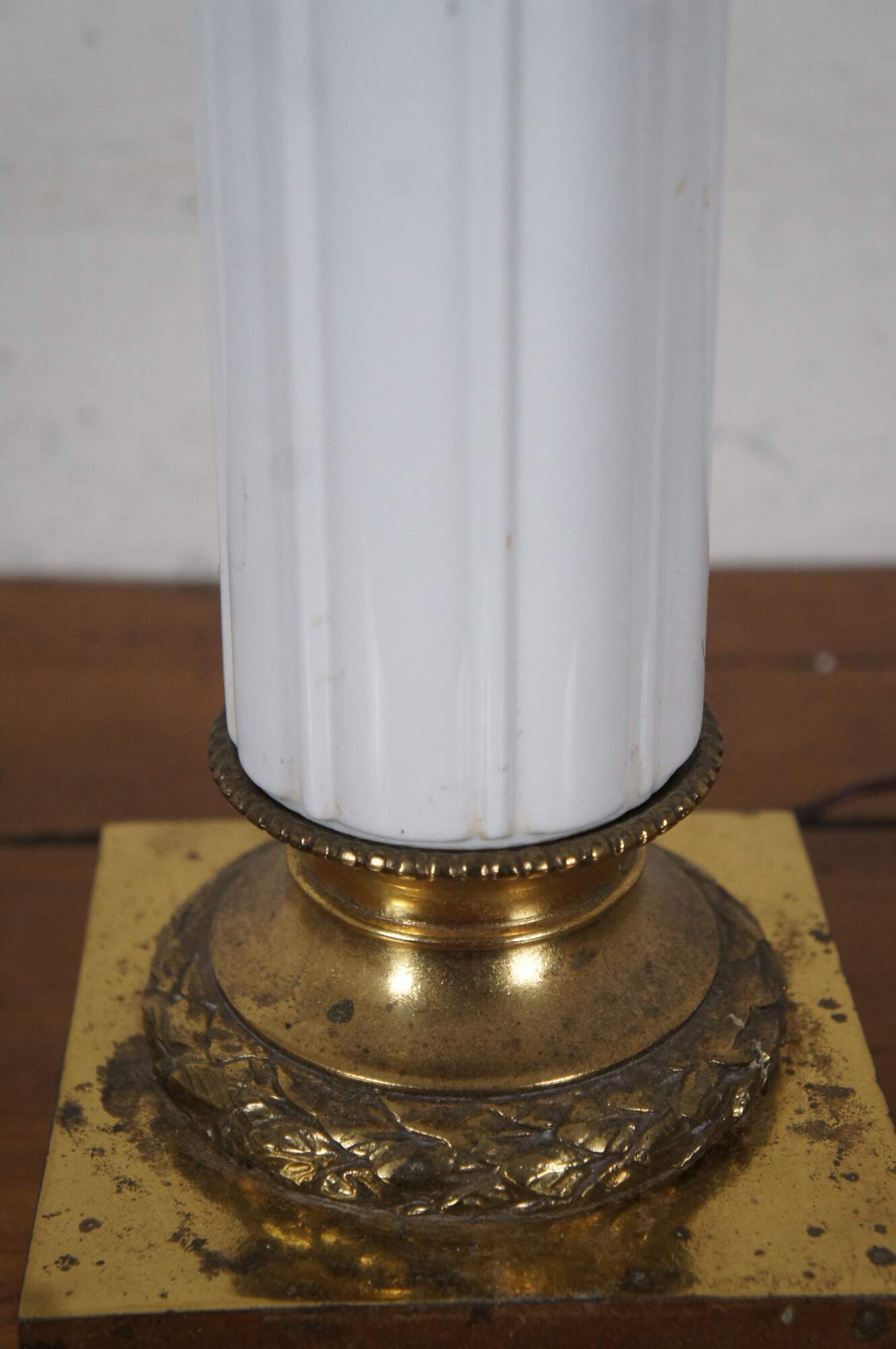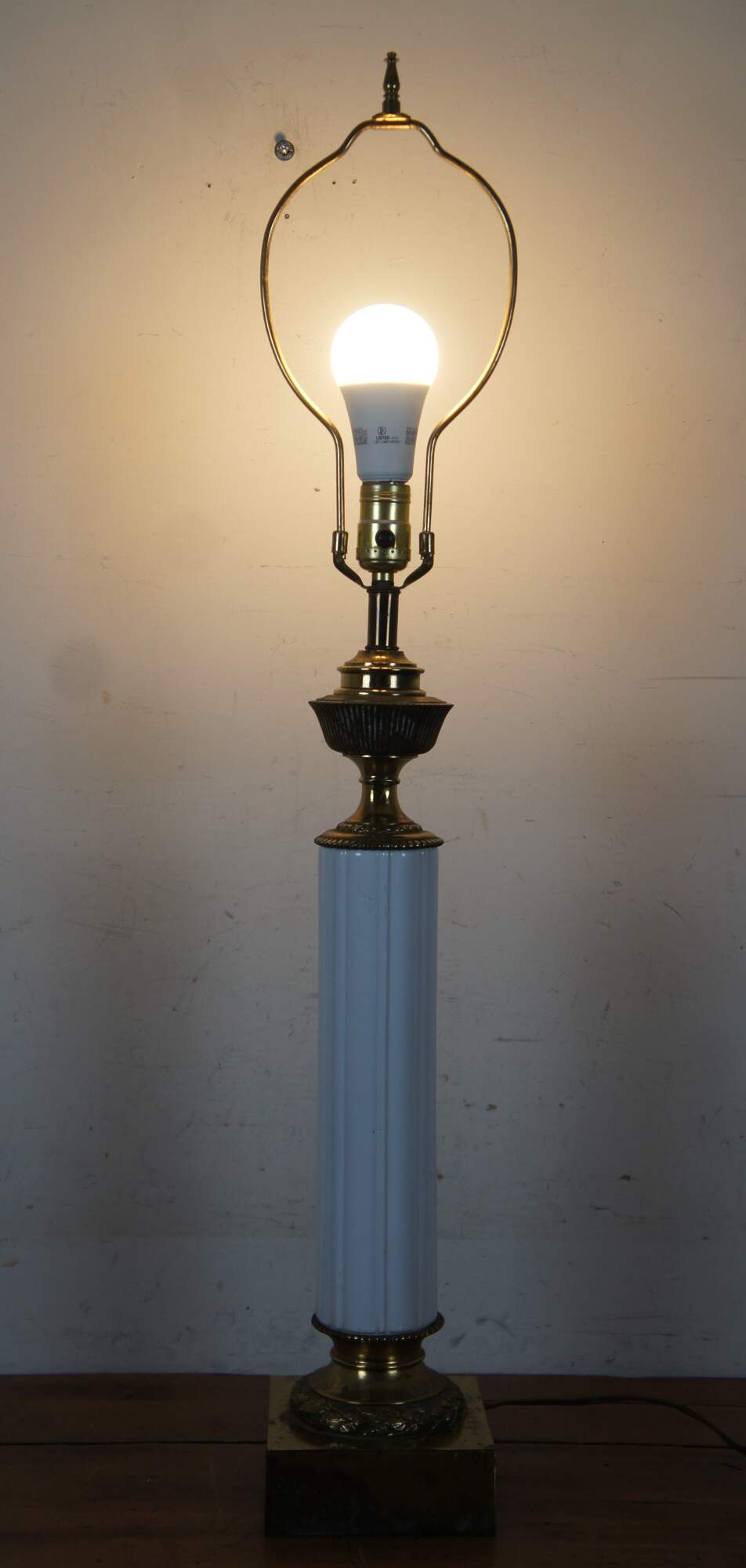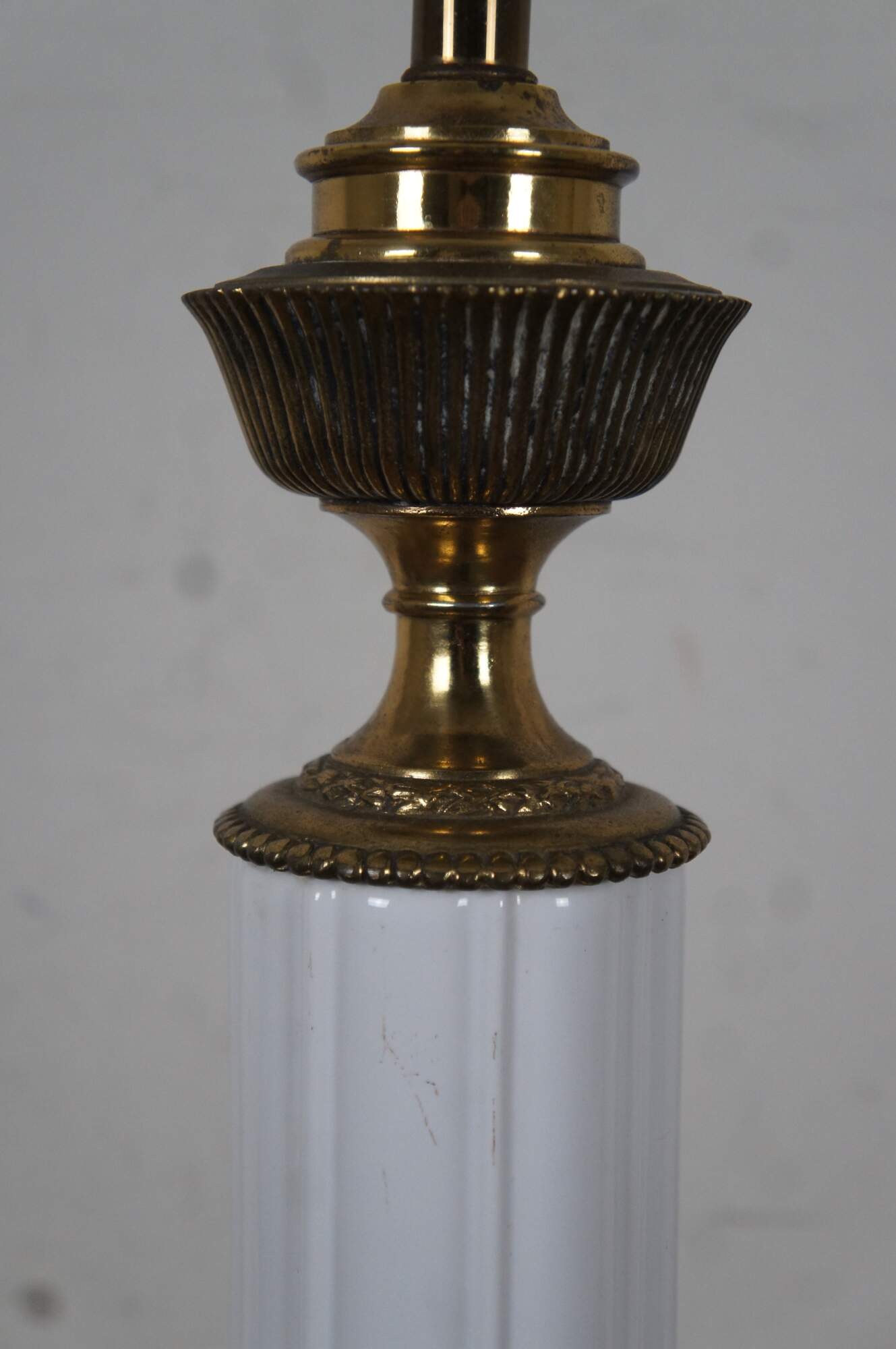 Vintage Tyndale brass and milk glass table lamp featuring Neoclassical styling.