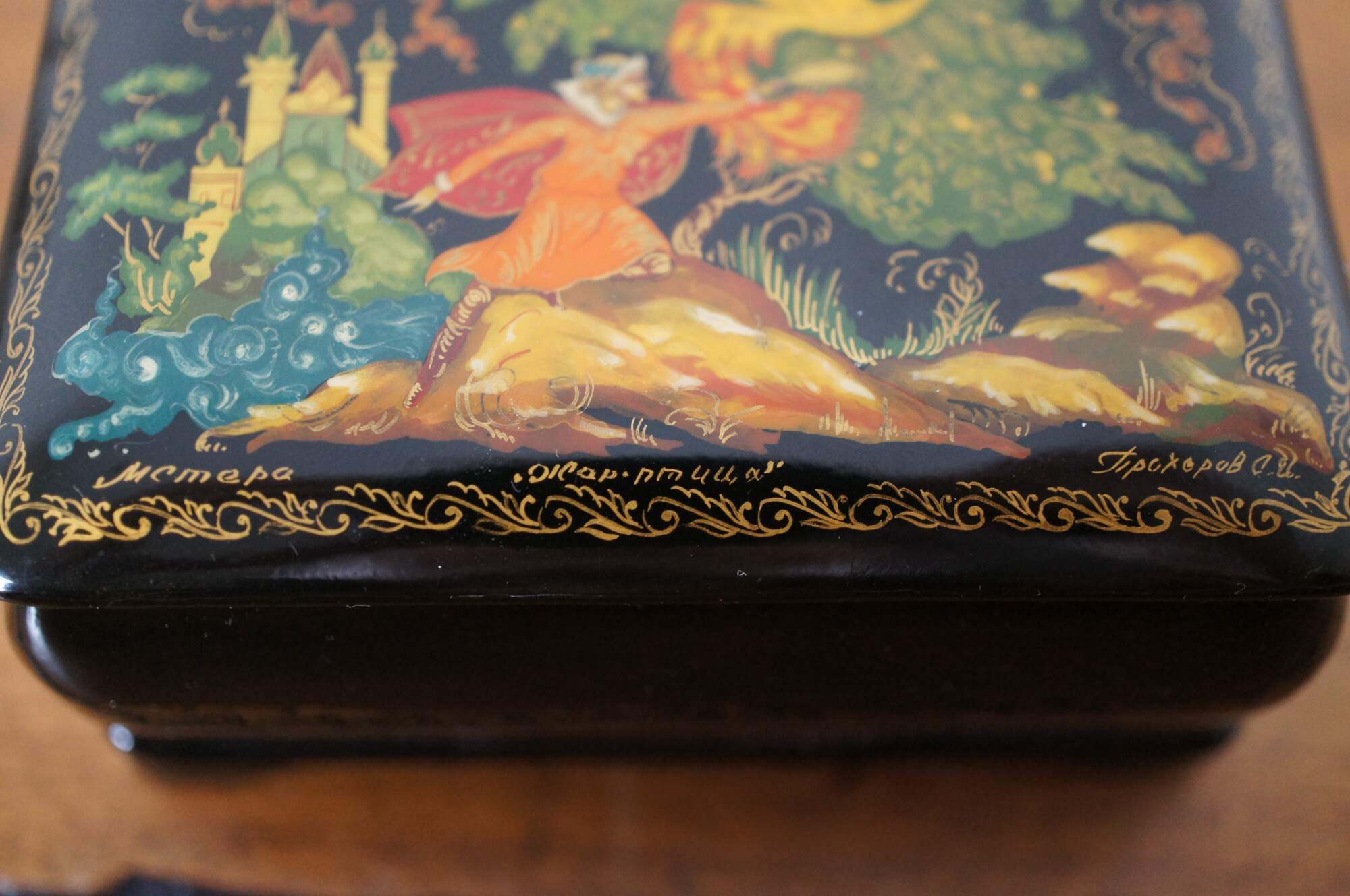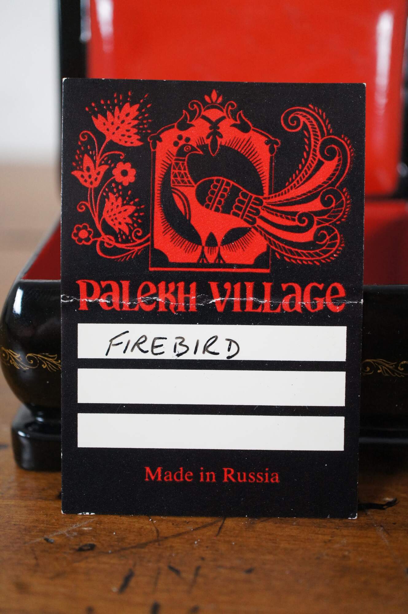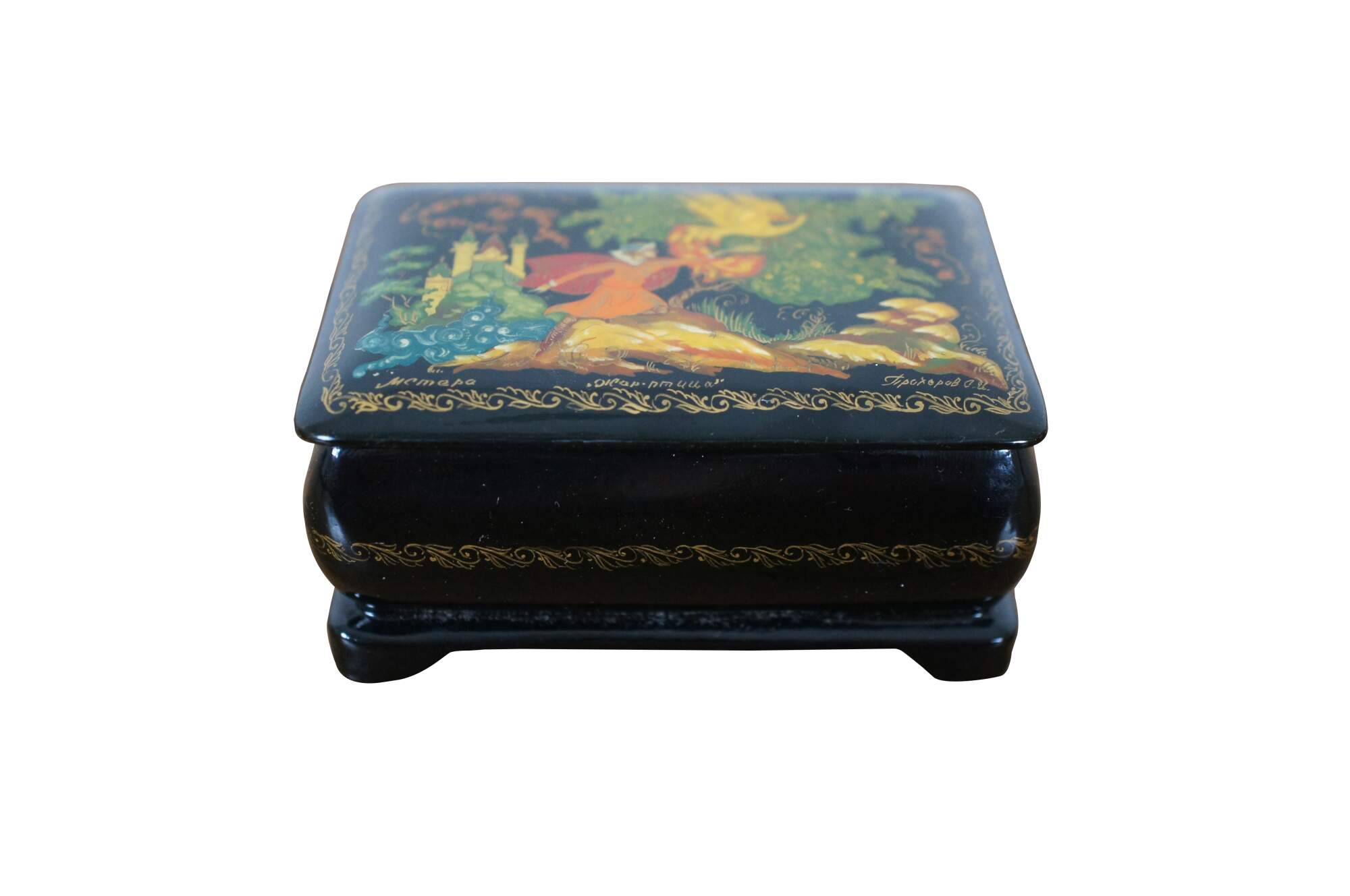 Vintage USSR Russian Firebird folklore / fairy tale keepake trinket box featuring red interior with hinged lid and landscape scene of a man with firebird and castle.