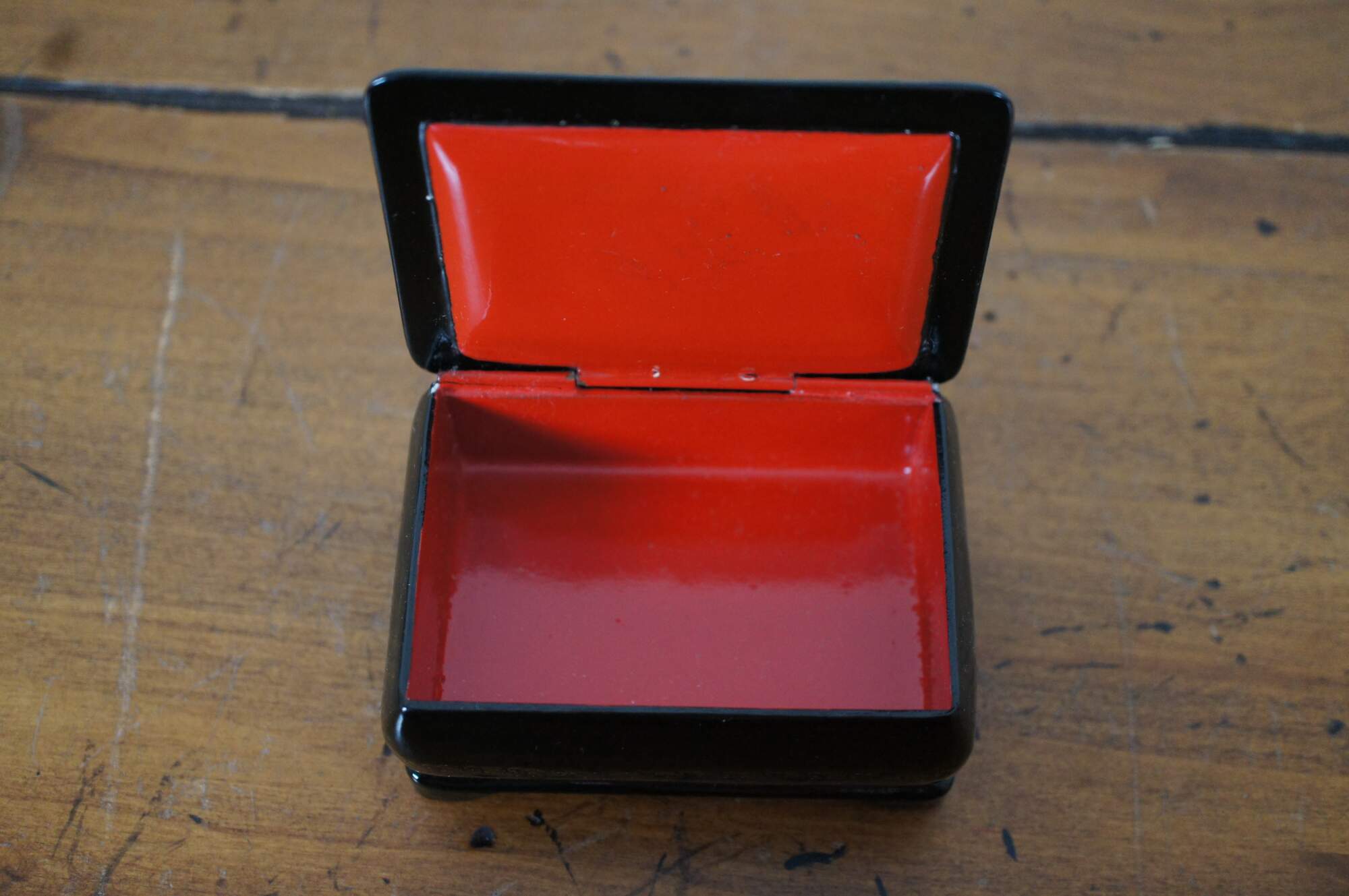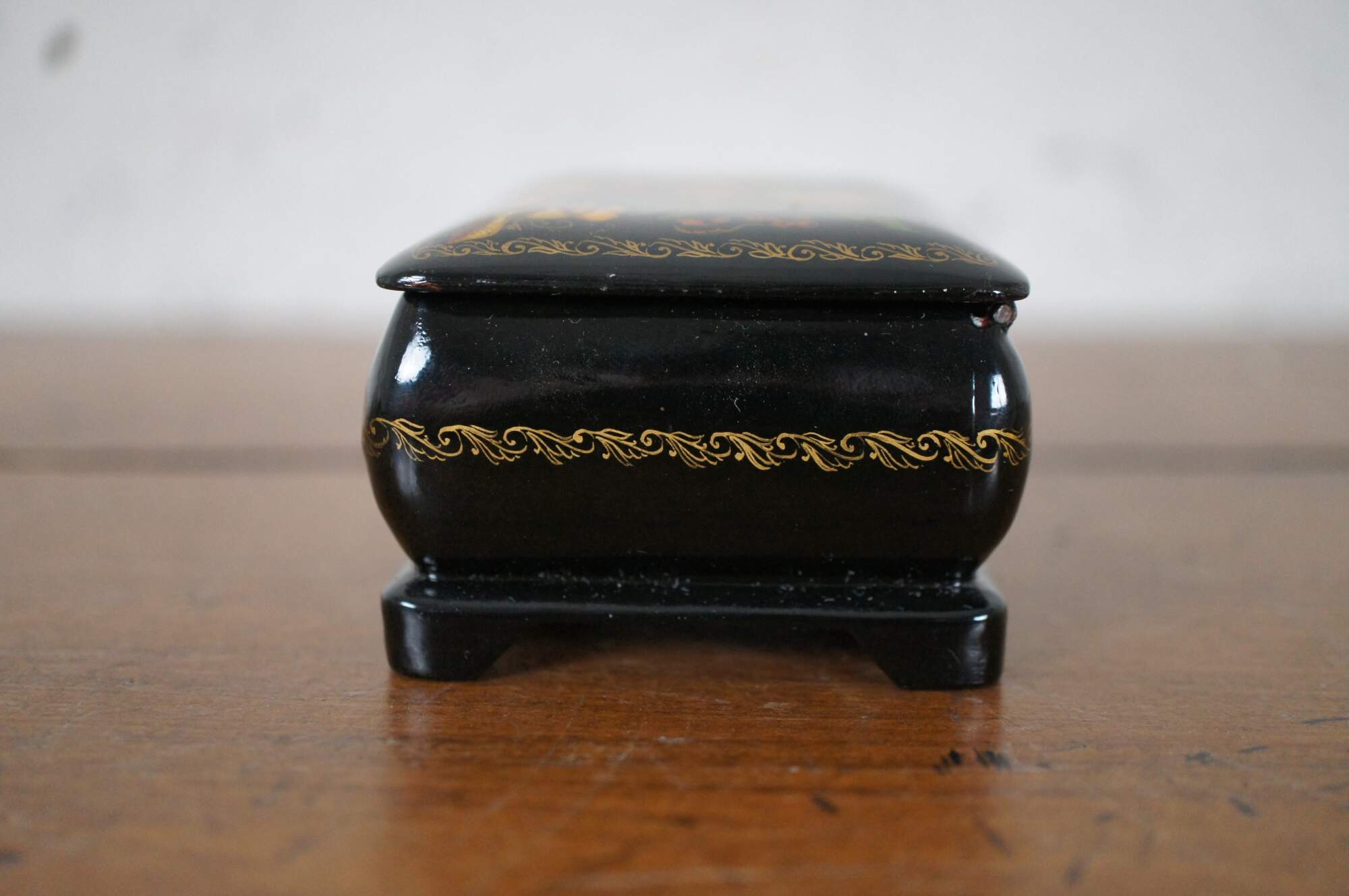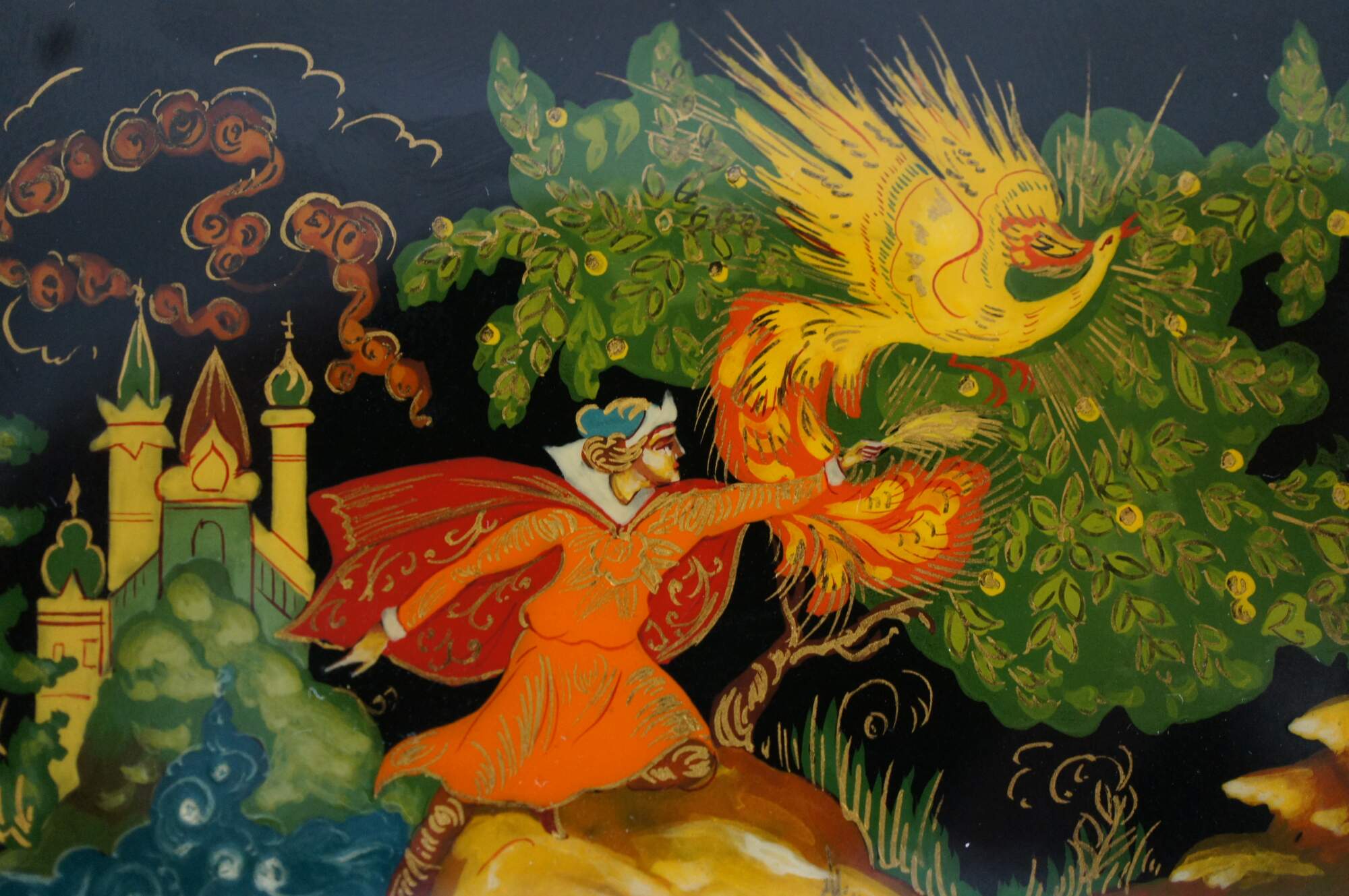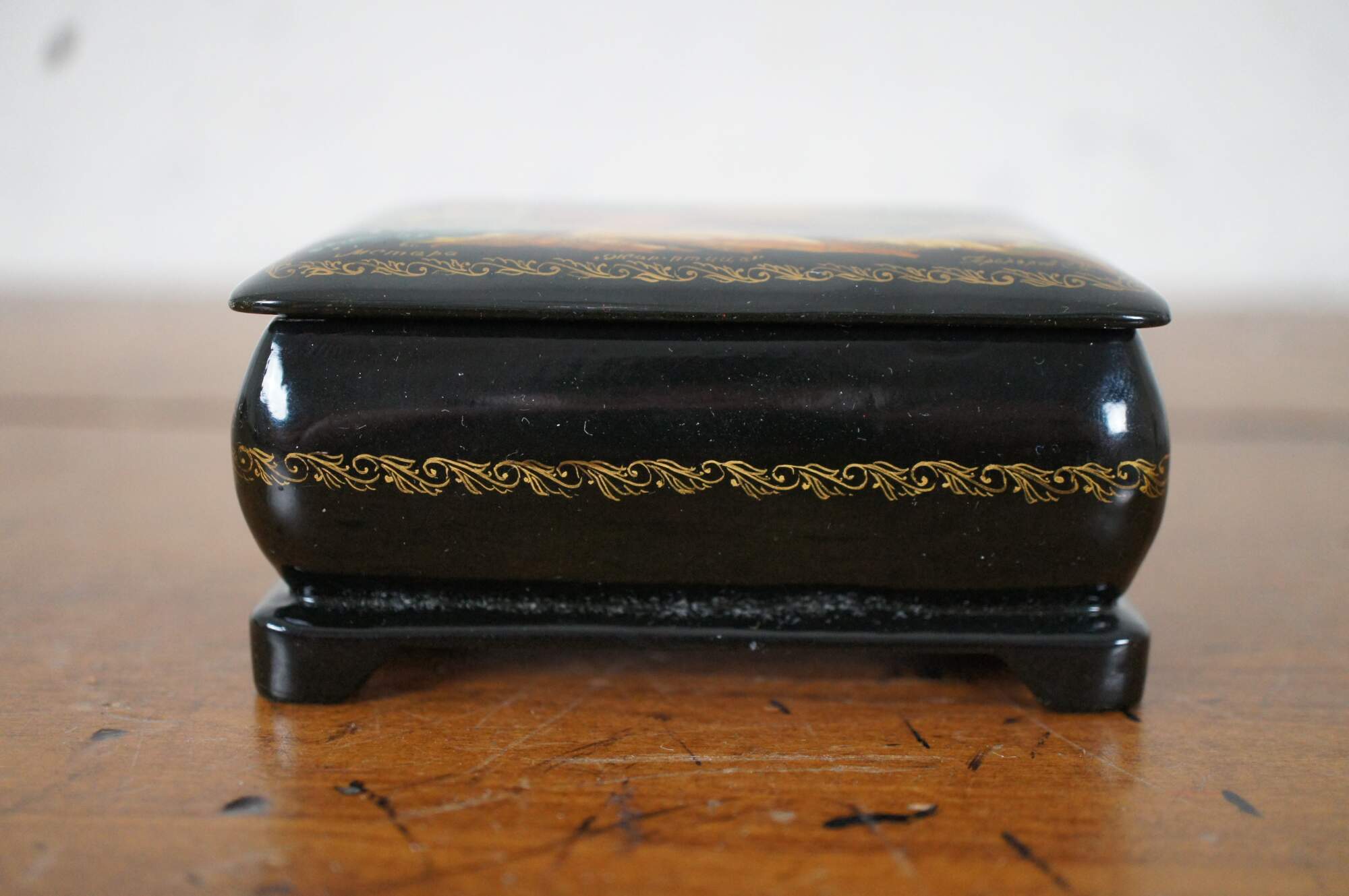 Vintage USSR Russian Firebird folklore / fairy tale keepake trinket box featuring red interior with hinged lid and landscape scene of a man with firebird and castle.