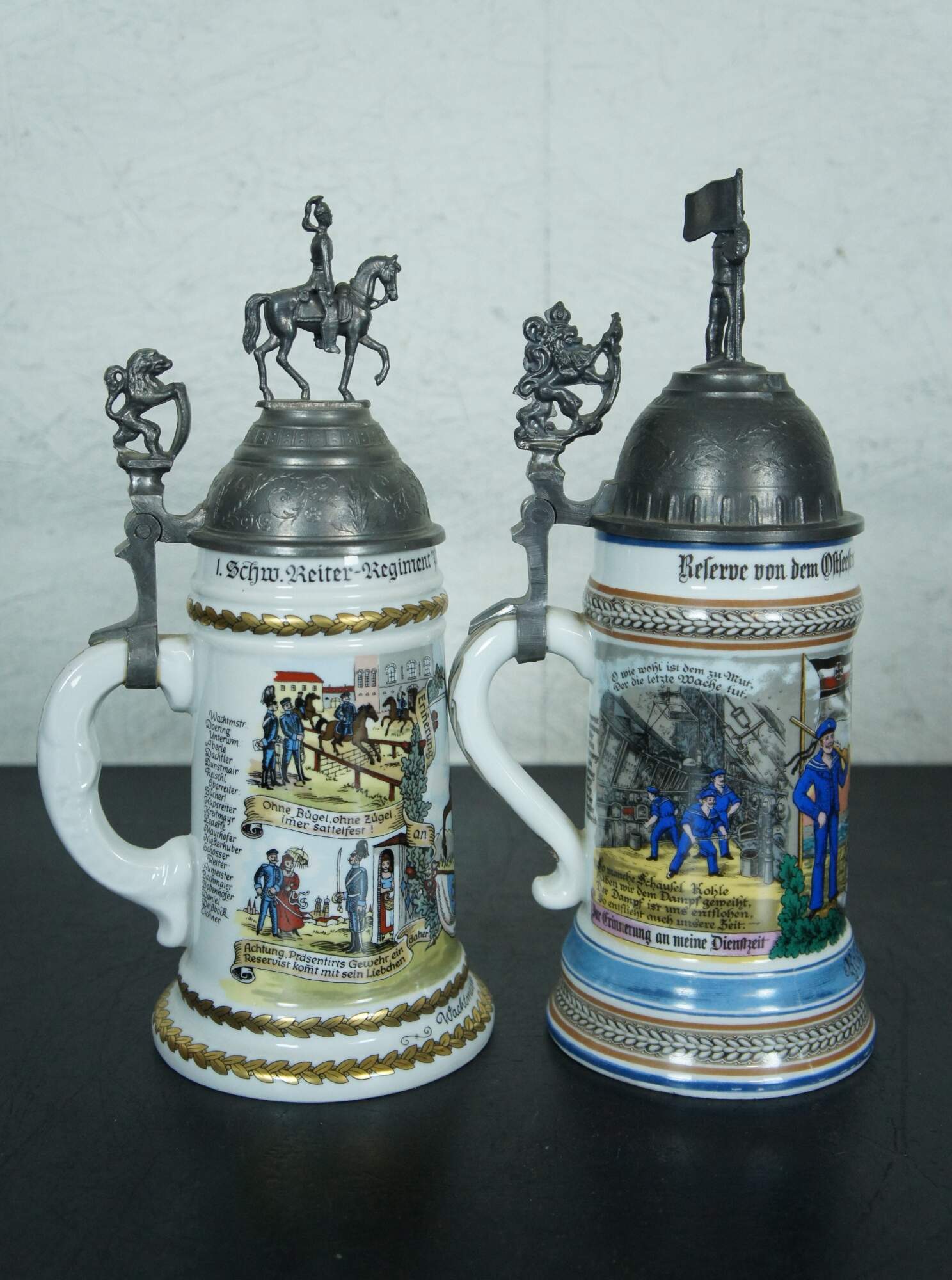 An impressive pair of German military lithopane steins. Colorful with bold scenes and ornate figural lids.