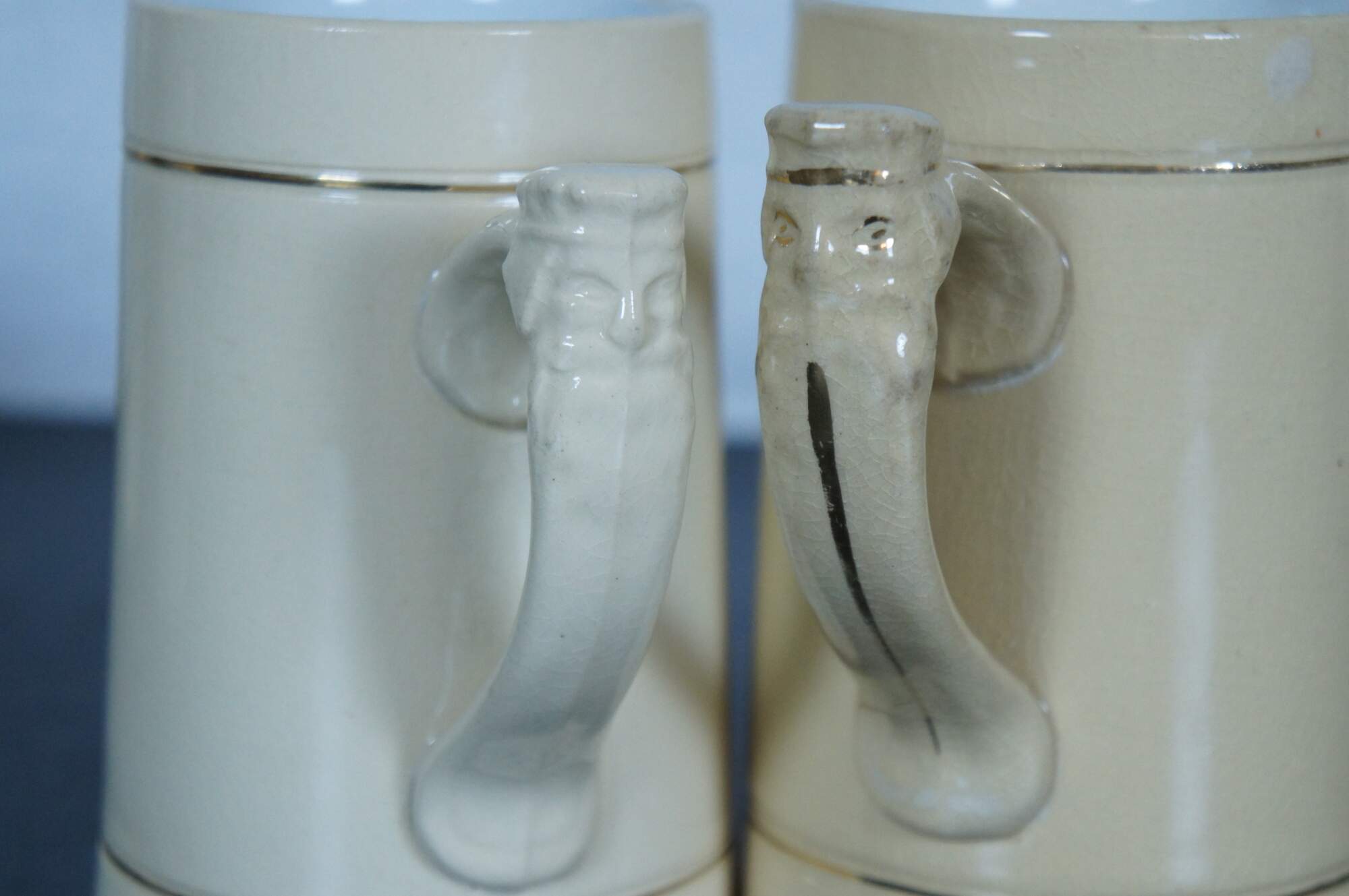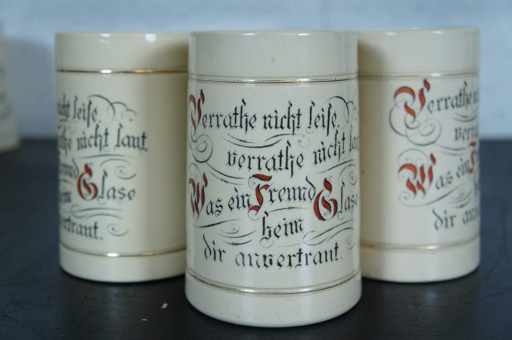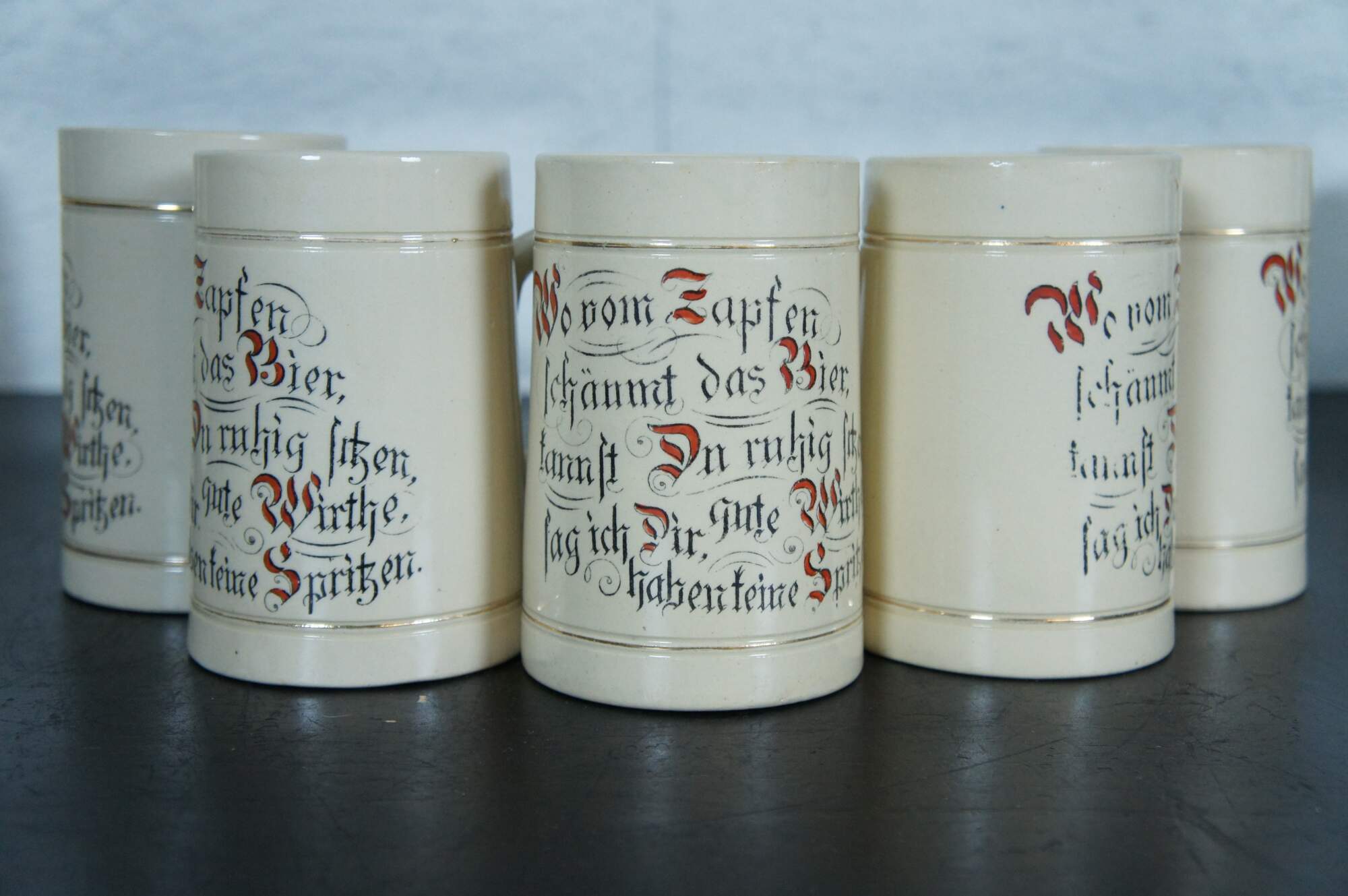 Antique set of eleven 19th century German earthenware steins / beer mugs / tankards with applied mask handle, distributed as a promotional advertising / sales incentive by F.A. Schwill & Company of Cincinnati, Ohio. Likely produced by the Hugo Thuemler Maufacturing Co - Representation of Gambrinus on the top of the handle on these steins has been seen on others produced by Thuemler. Gambrinus is a legendary European culture hero celebrated as an icon of beer, brewing, joviality, and joie de vivre. Typical representations in the visual arts depict him as a rotund, bearded duke or king, holding a tankard or mug, and sometimes with a keg nearby.