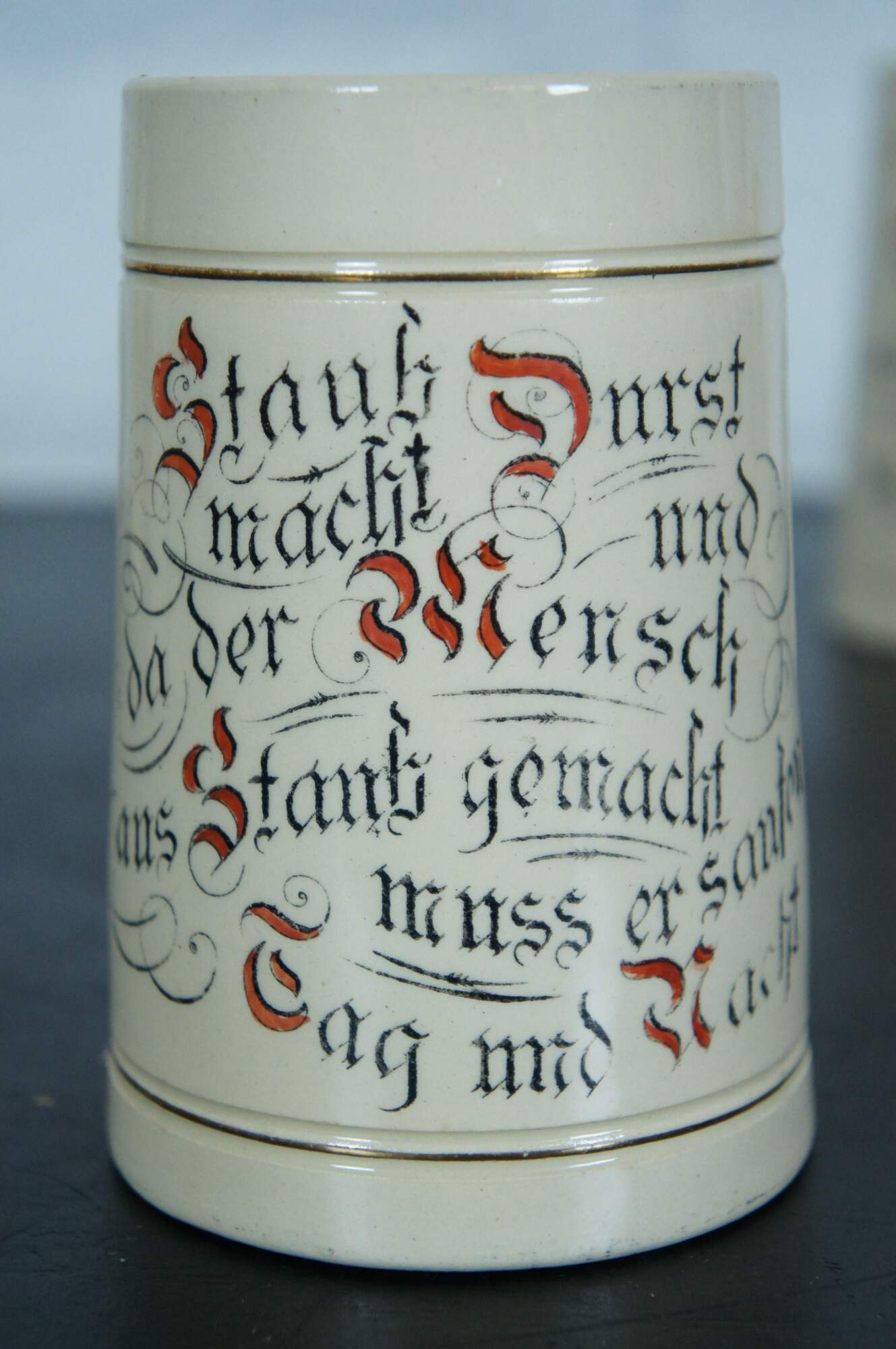 Dust makes thirst and since humans are made of dust, we should drink day and night". Staub macht Durst Und da der Mensch aus Staub gemacht muss er saufen Tag und Nacht.