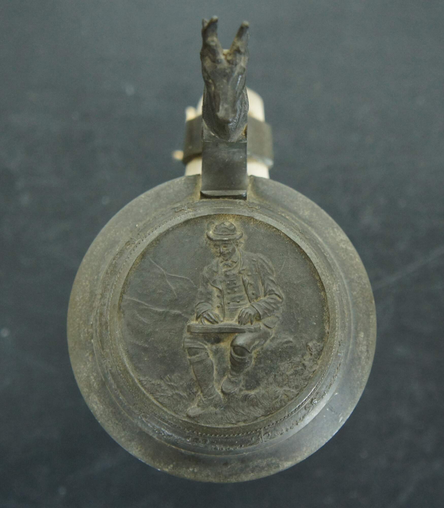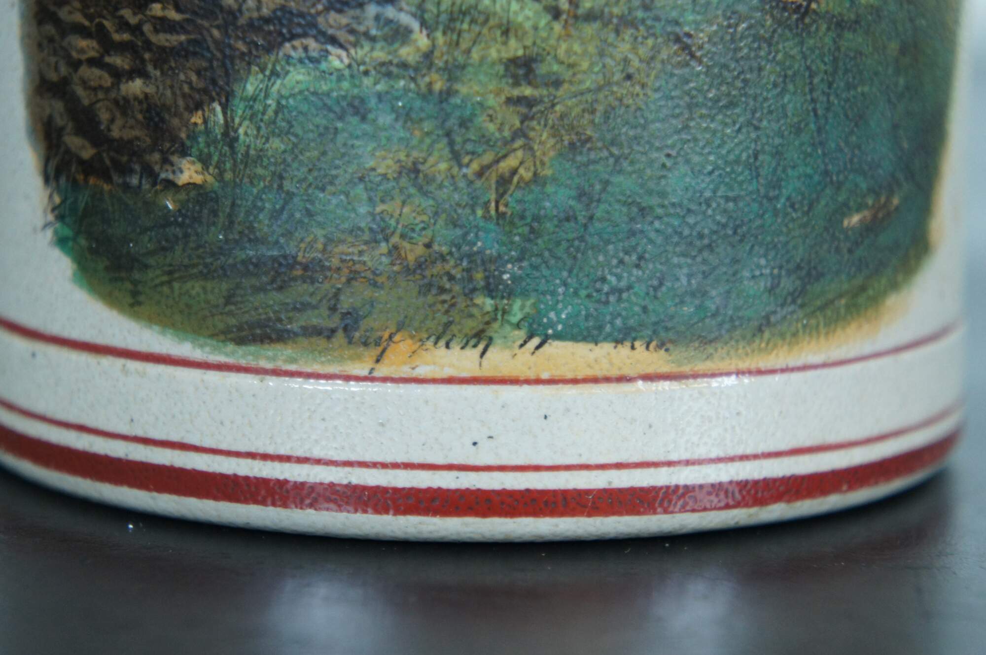 Antique German 1/2 Liter stoneware beer stein featuring a pewter lid with figural stag and landscape scene.
