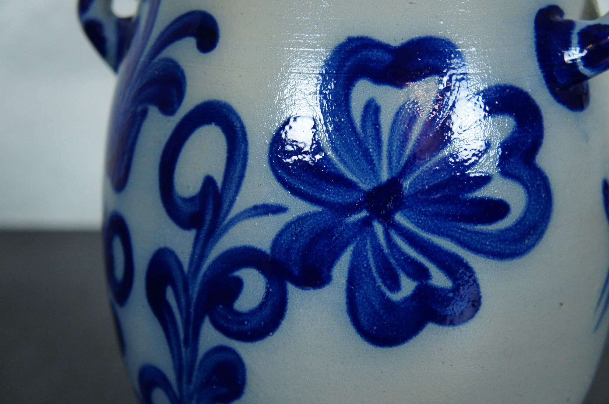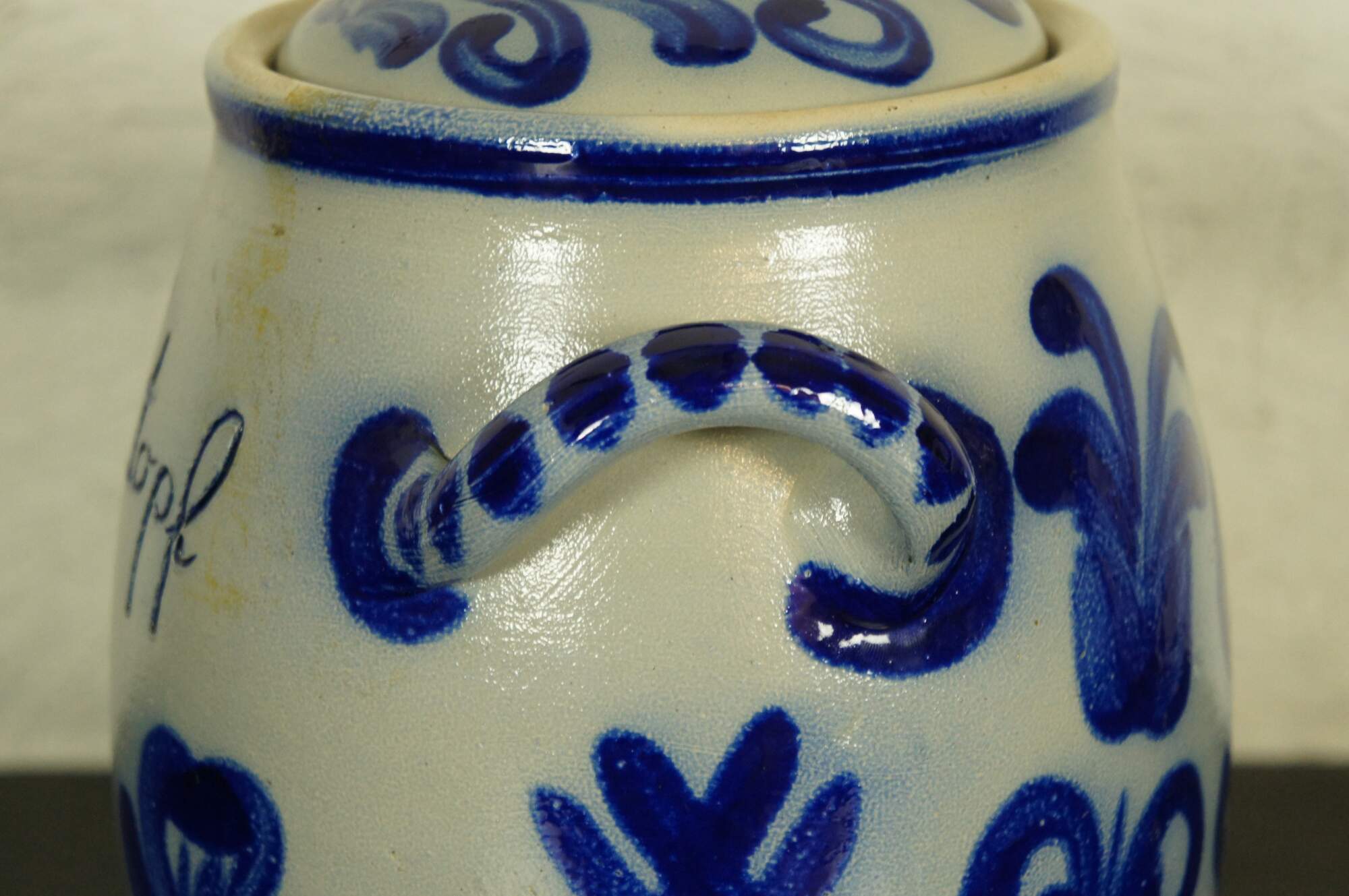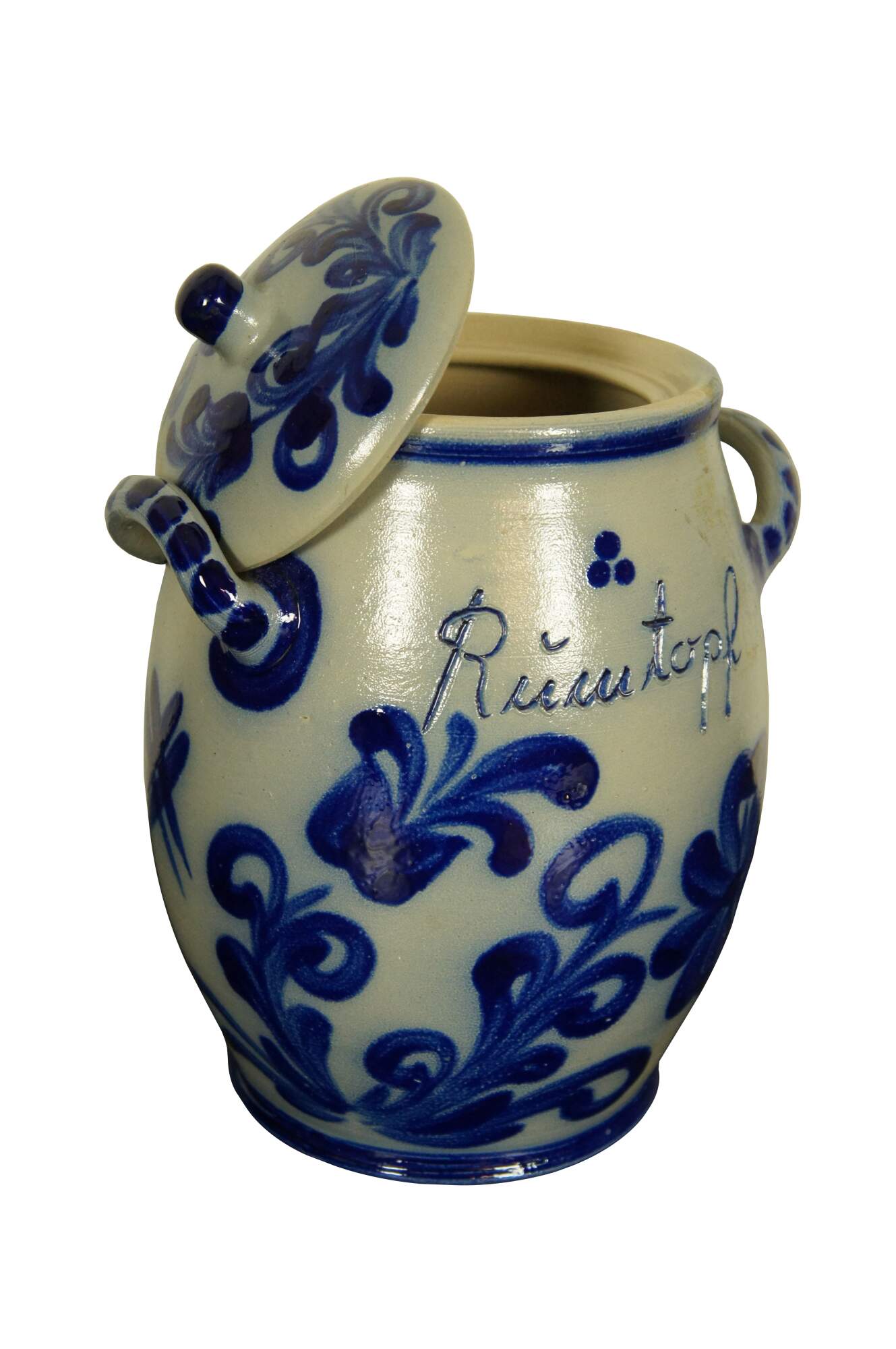 Antique German Westerwald cobalt blue salt glaze stoneware pottery rumtopf jar / crock / tureen with lid. Features a cobalt blue floral theme.