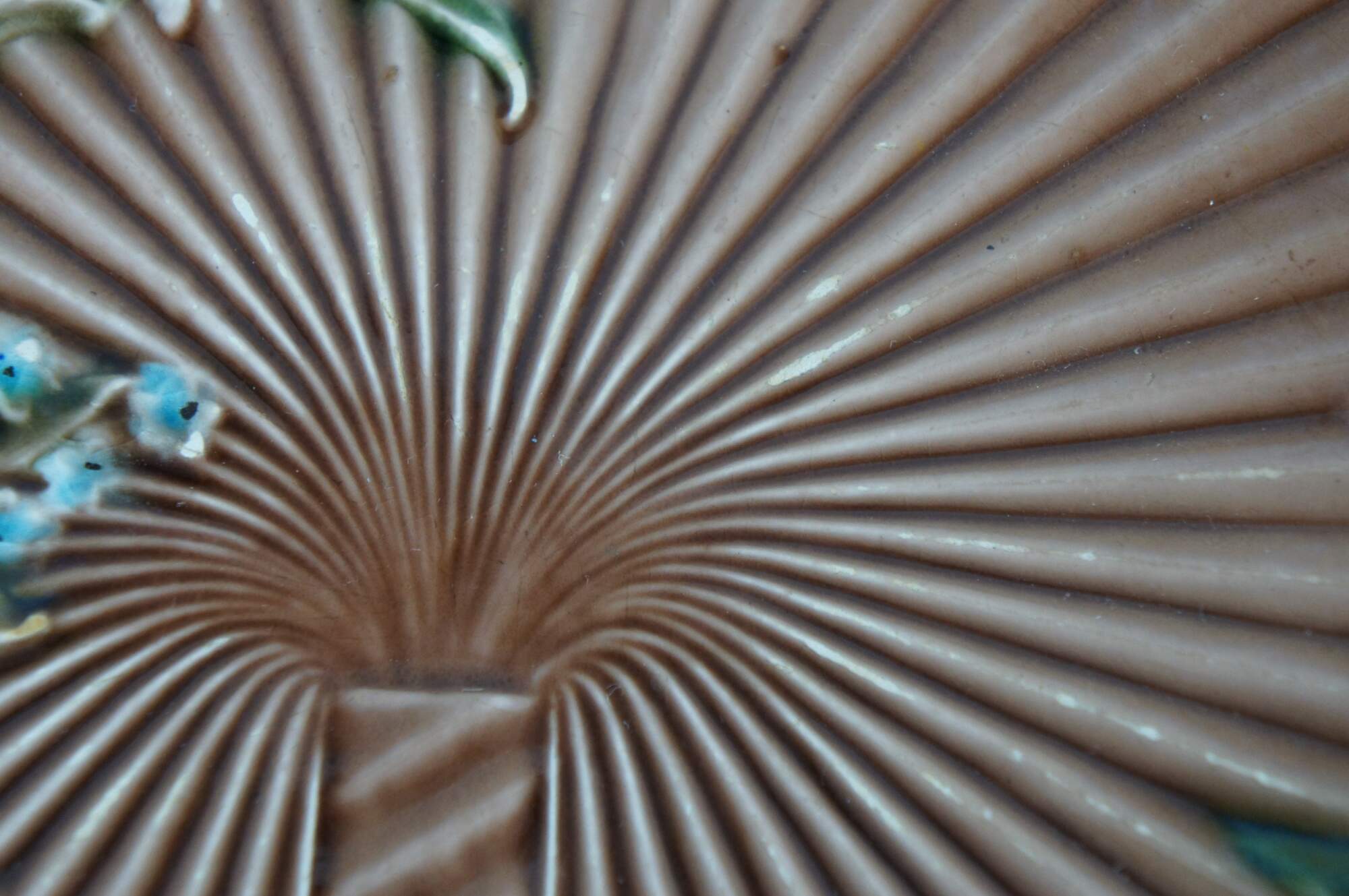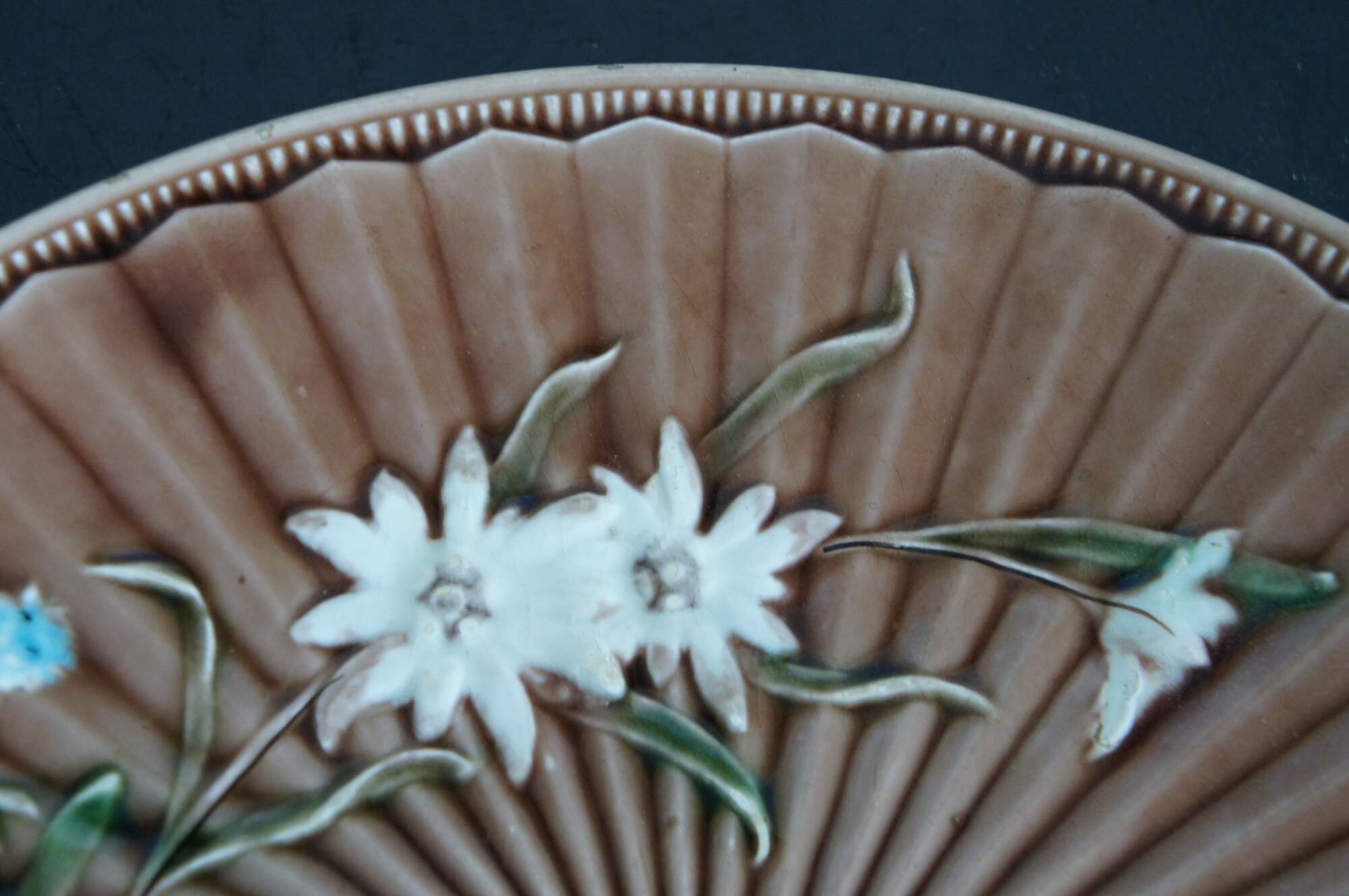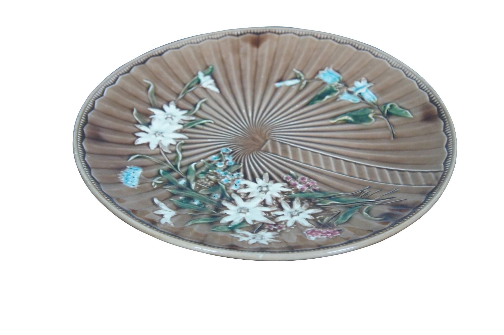 Antique German Villeroy & Boch brown majolica plate or charger featuring a fanned starburst floral theme with a variety of flowers and ticked edge.