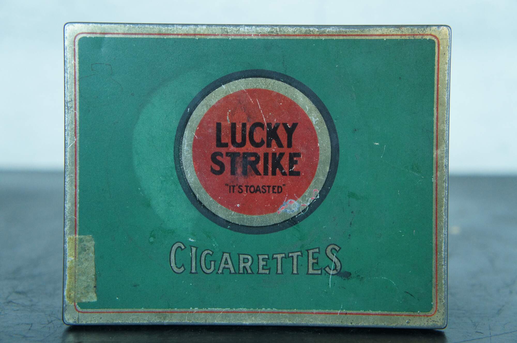 Mid century Lucky Strike, American Tobacco Co ad tin cigarette pack featuring the classic logo with phrase. Made in North Carolina.