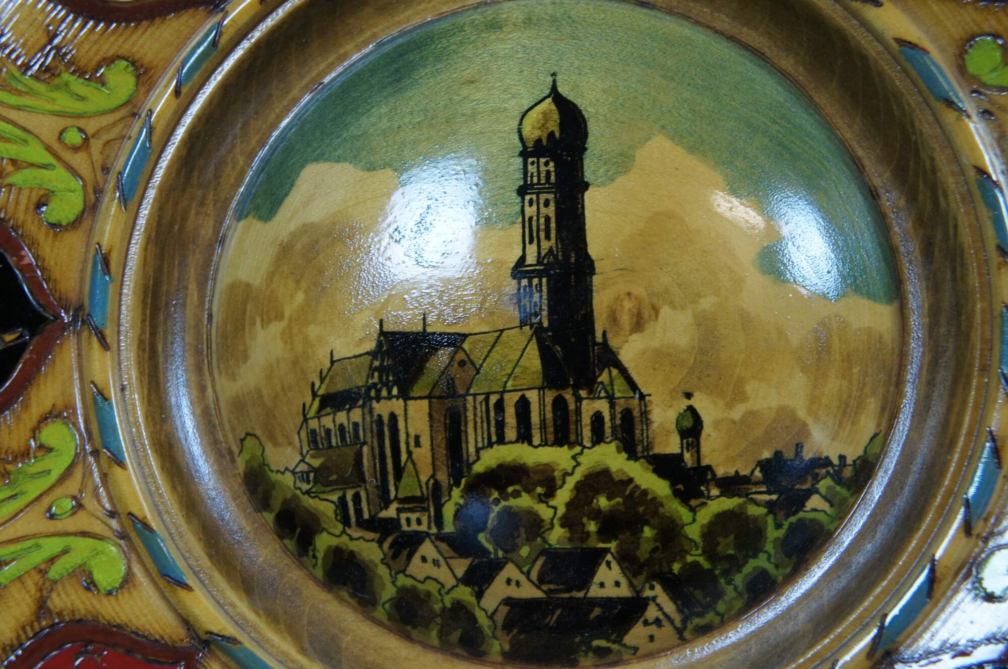 Mid century 1957 German coat of arms wooden wall plaque or plate featuring hand painted details. Augsburg, Ulm, Lindau, Kempten, Berchtesgaden, Regensburg, Wurzburg, Munchen.