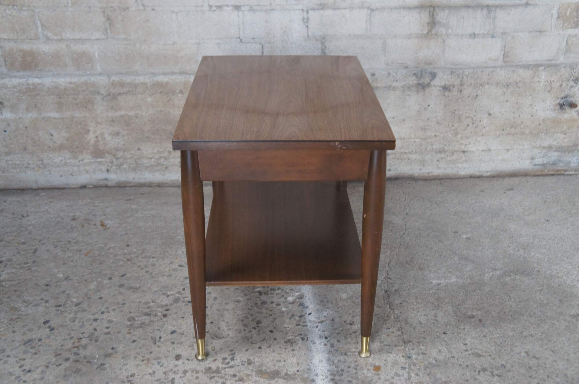 Two mid century modern Mersman end tables. Made of oak featuring rectangular form with two tier design, one drawer, tapered legs, and brass capped feet.