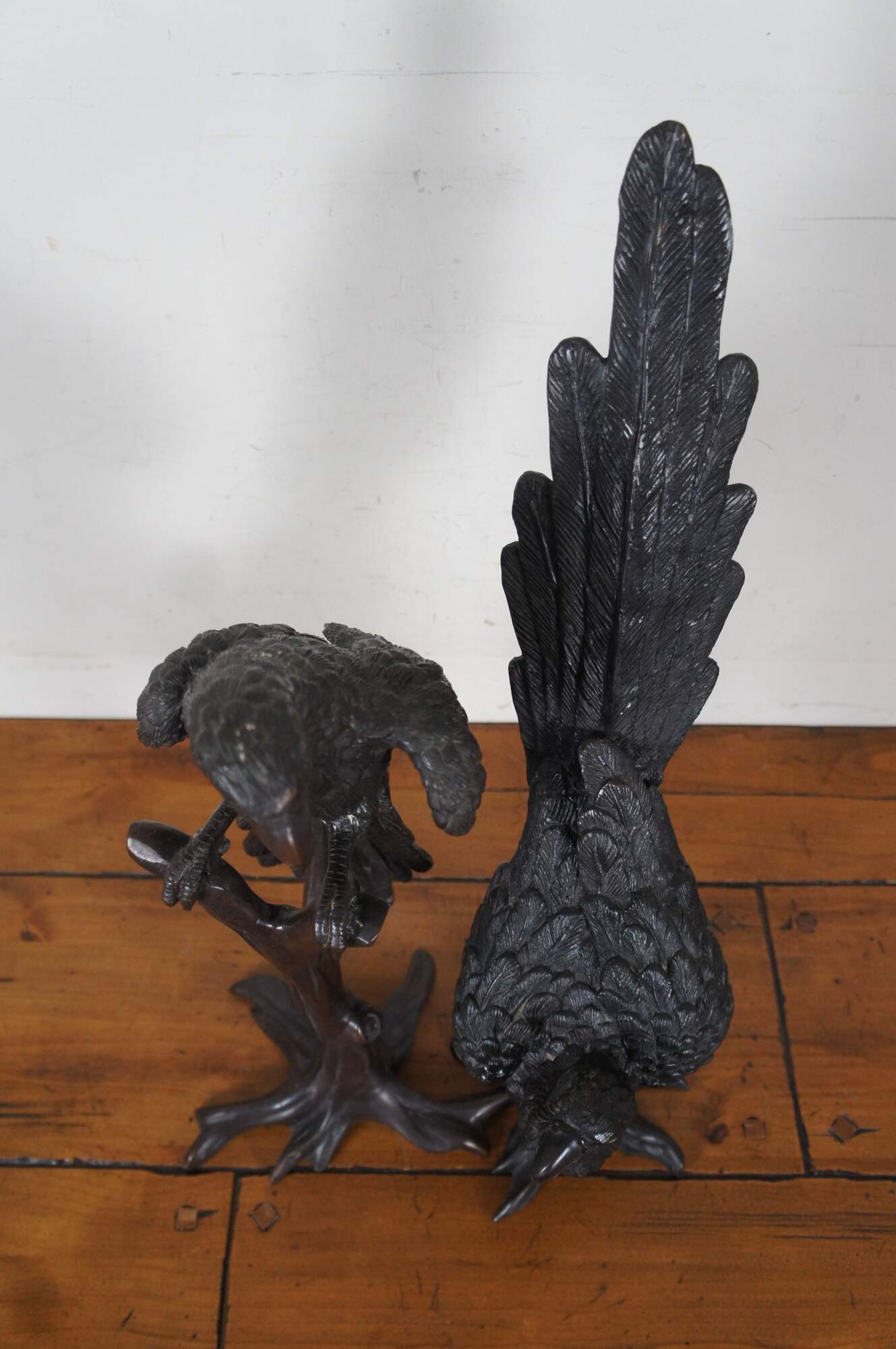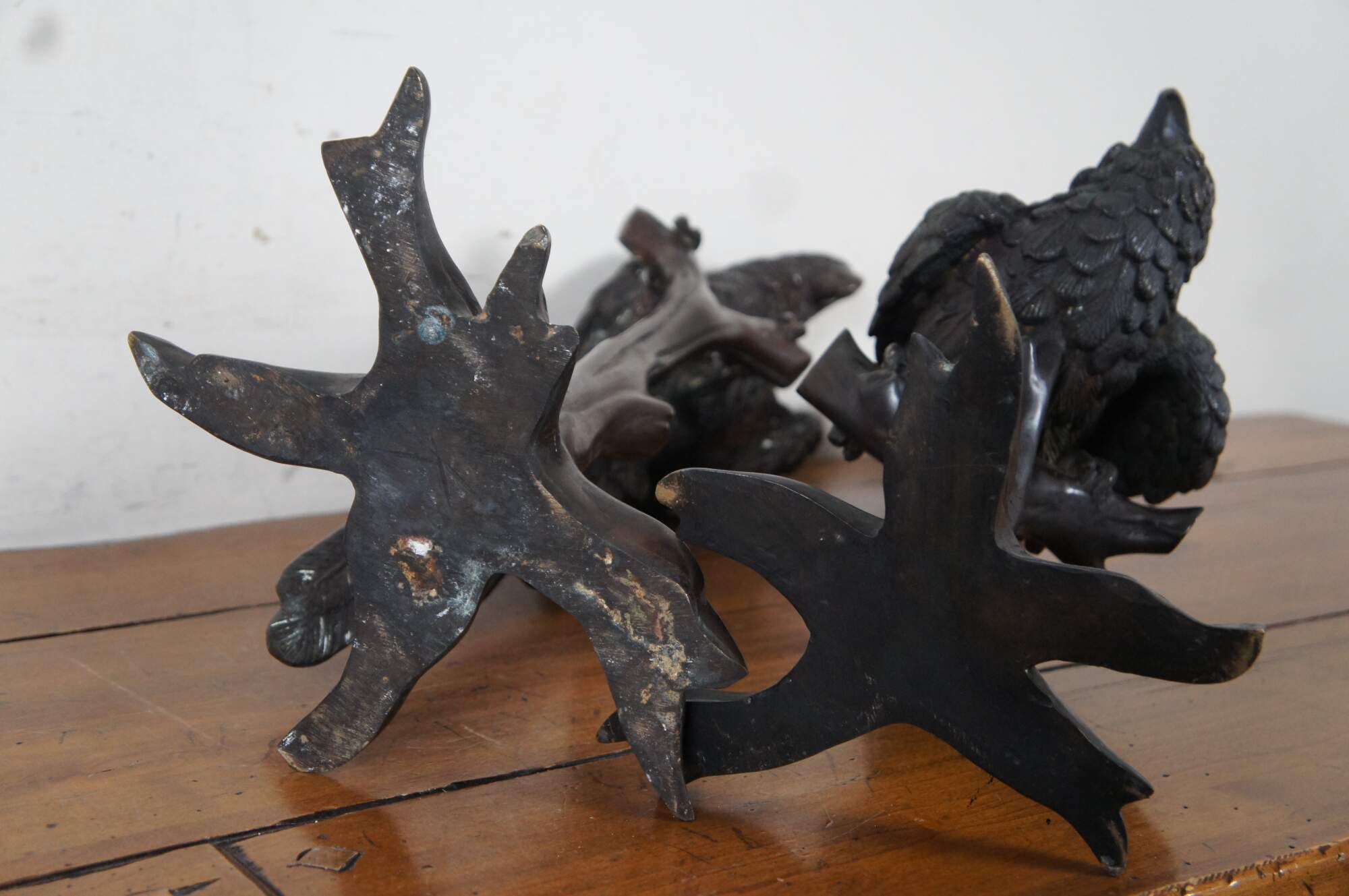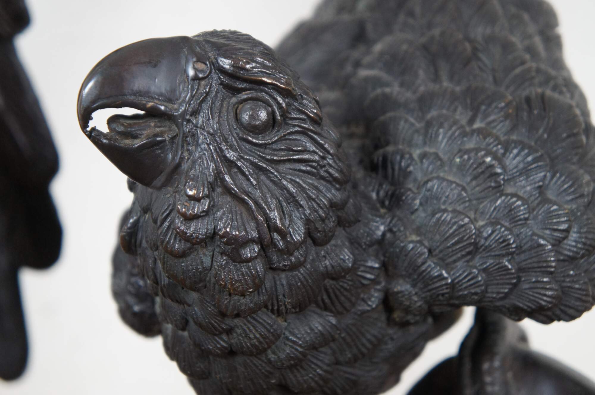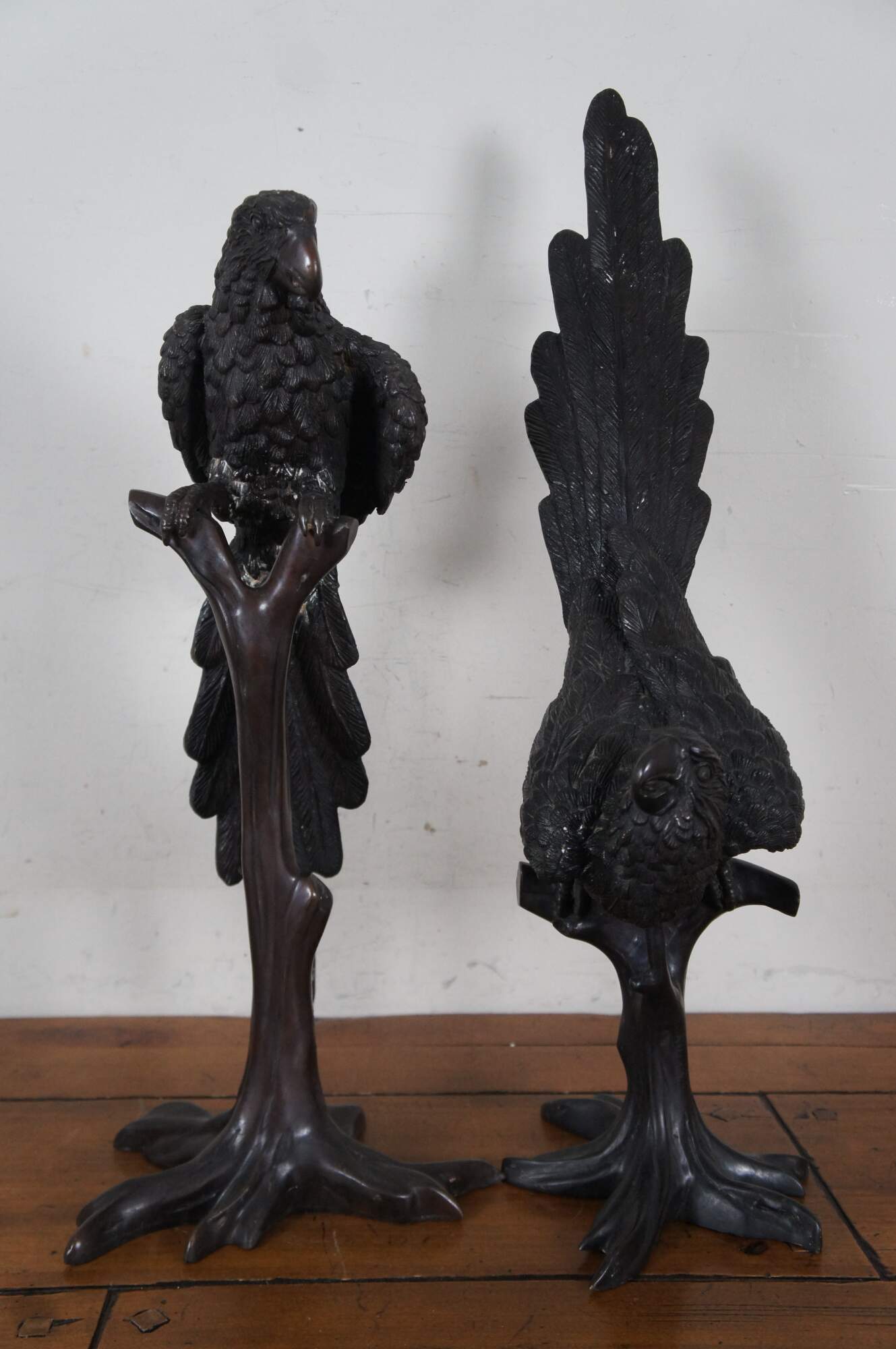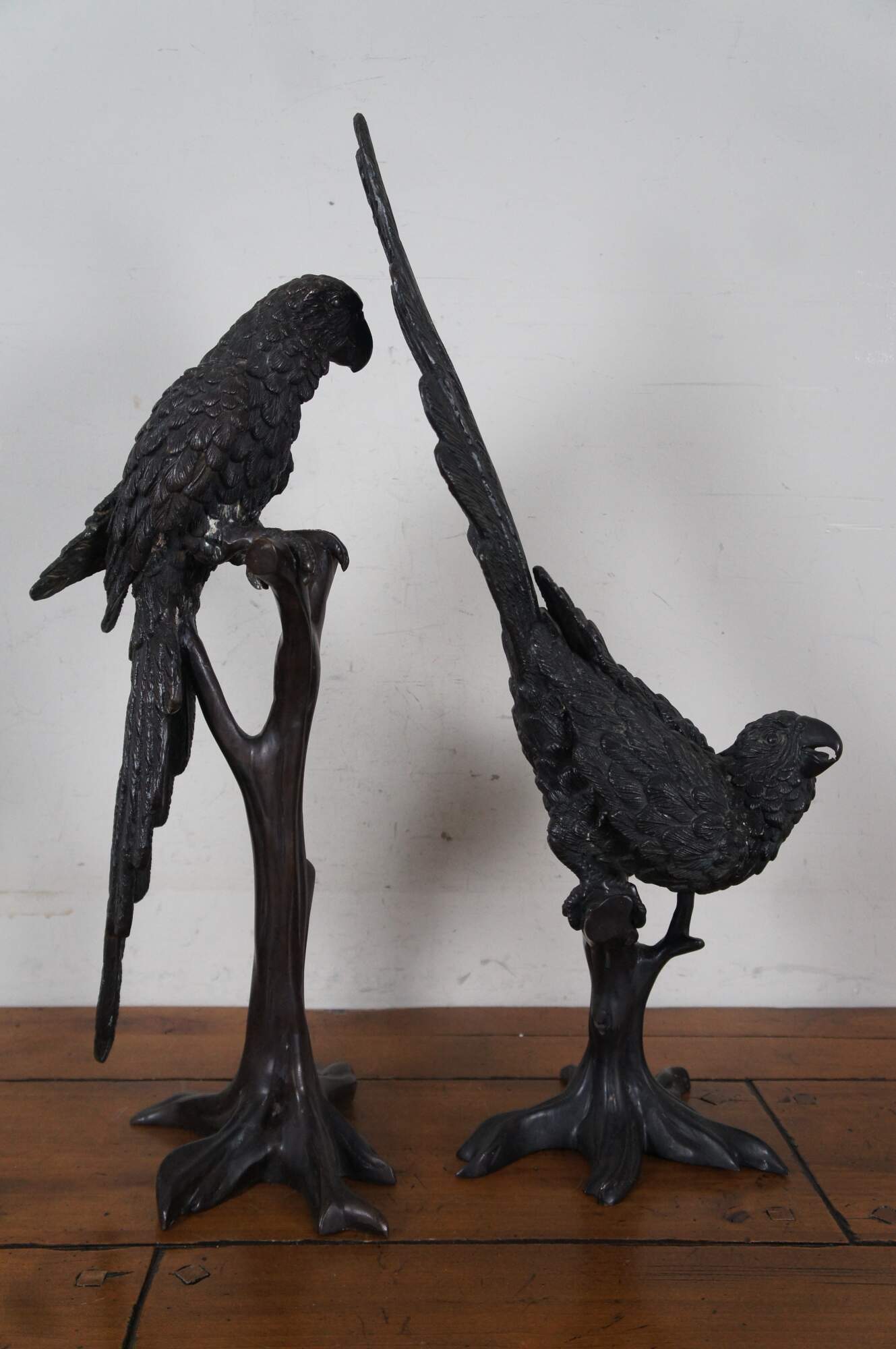 Mid century pair of French bronze Macaw Parrots / birds perched on stands with nice patina, signed Kulang. The parrots are shown with impressive life like design to the feathers, beaks and eyes, each with a unique expression and pose.