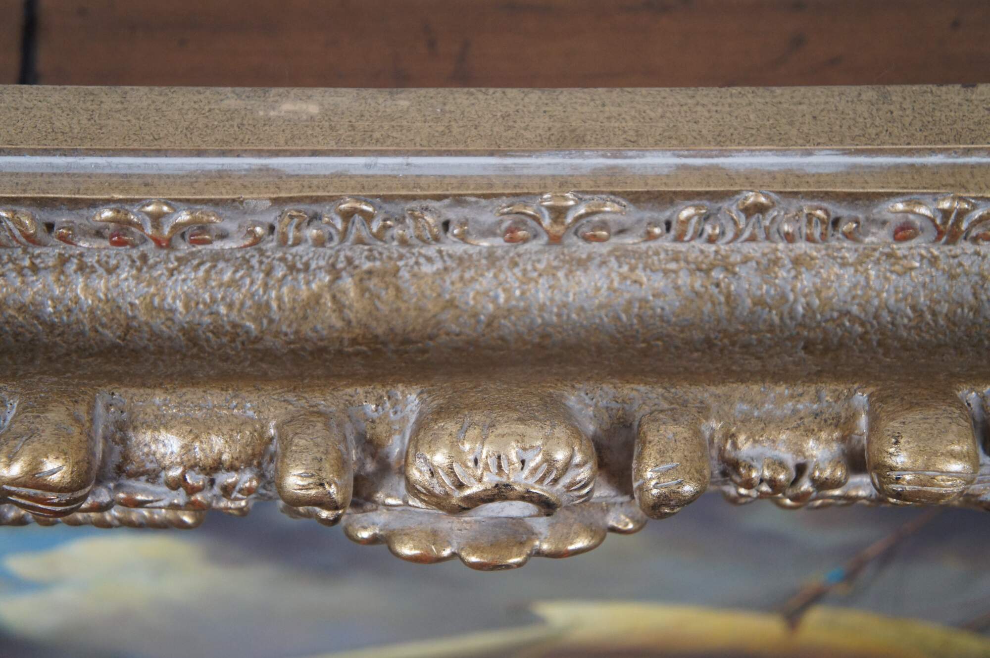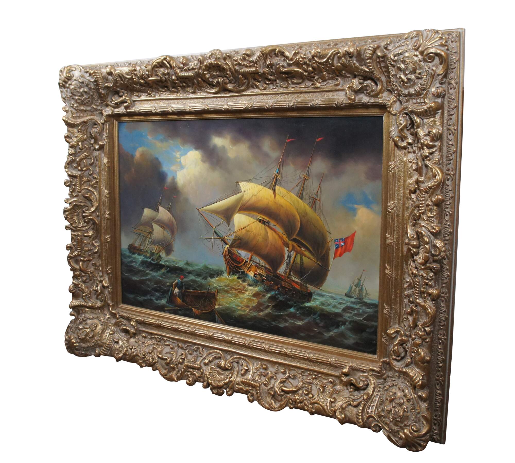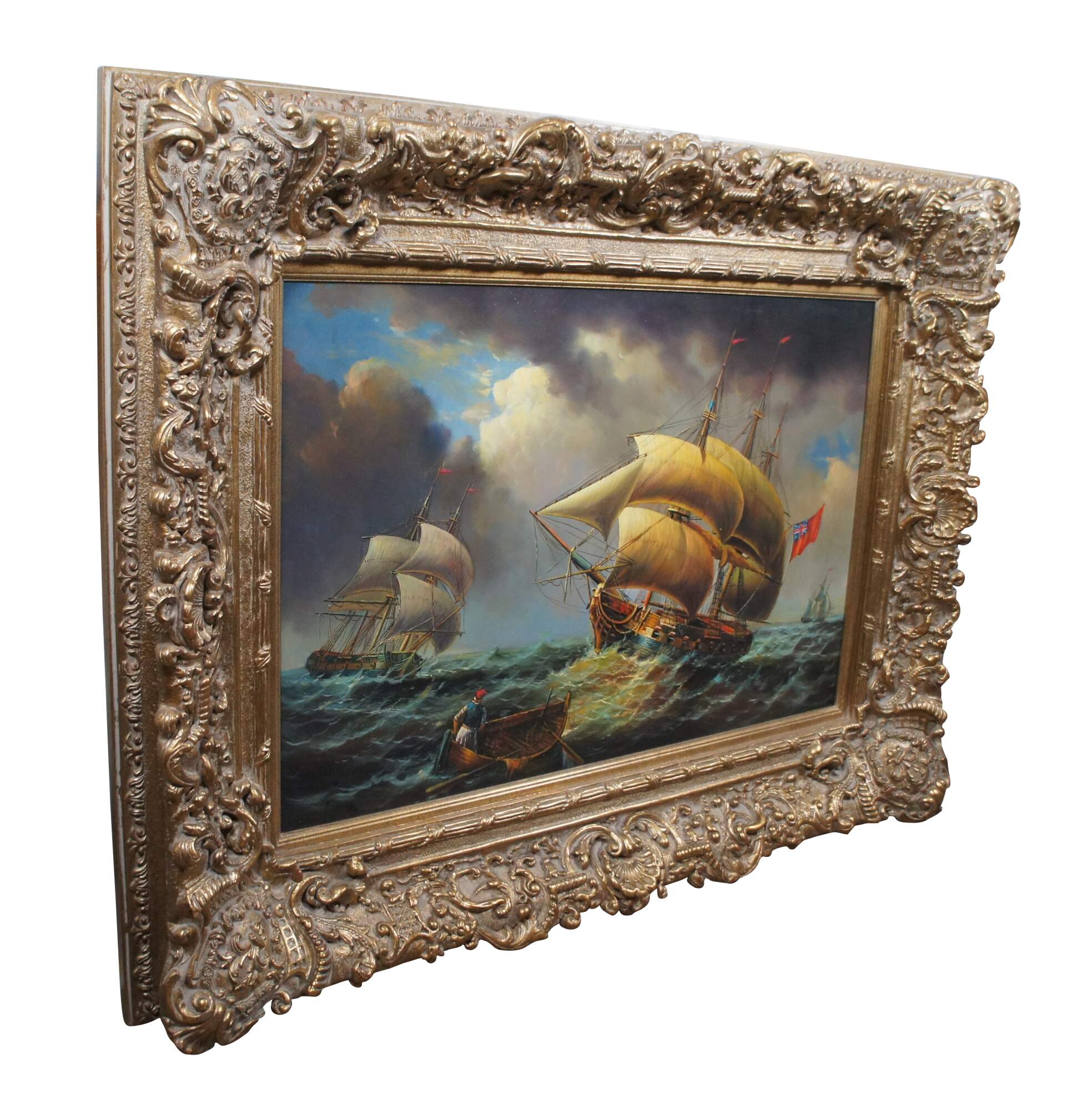 A large and impressive nautical maritime seascape oil painting on canvas depicting The Action of 21 April 1806, After Pierre-Julien Gilbert. The painting showcases a choppy ocean battle scene with a British & French Galleon. Features an ornate baroque gold high relief frame with Neoclassical designs of scrolled acanthus, fleur de lis and shell and cartouche.