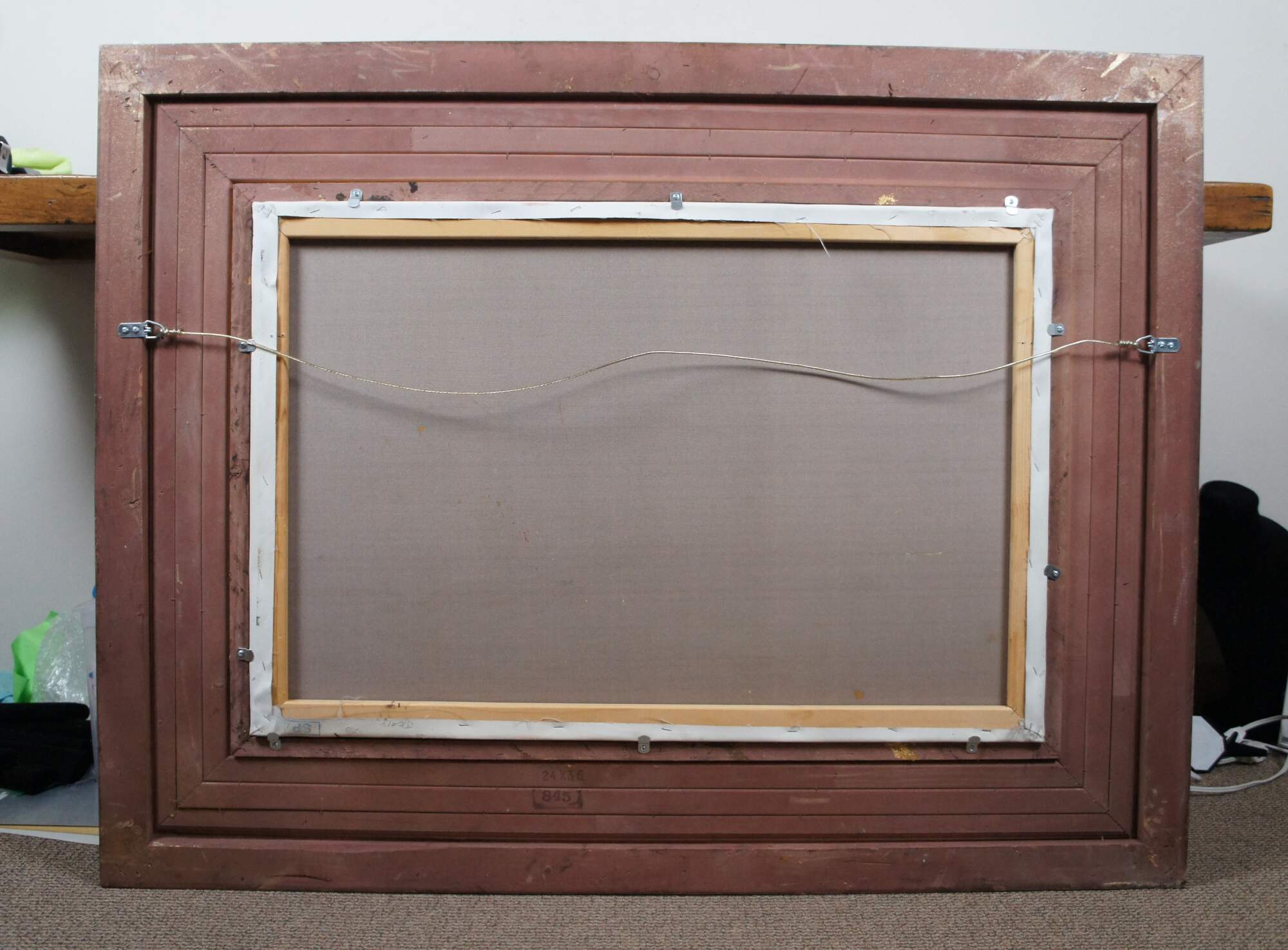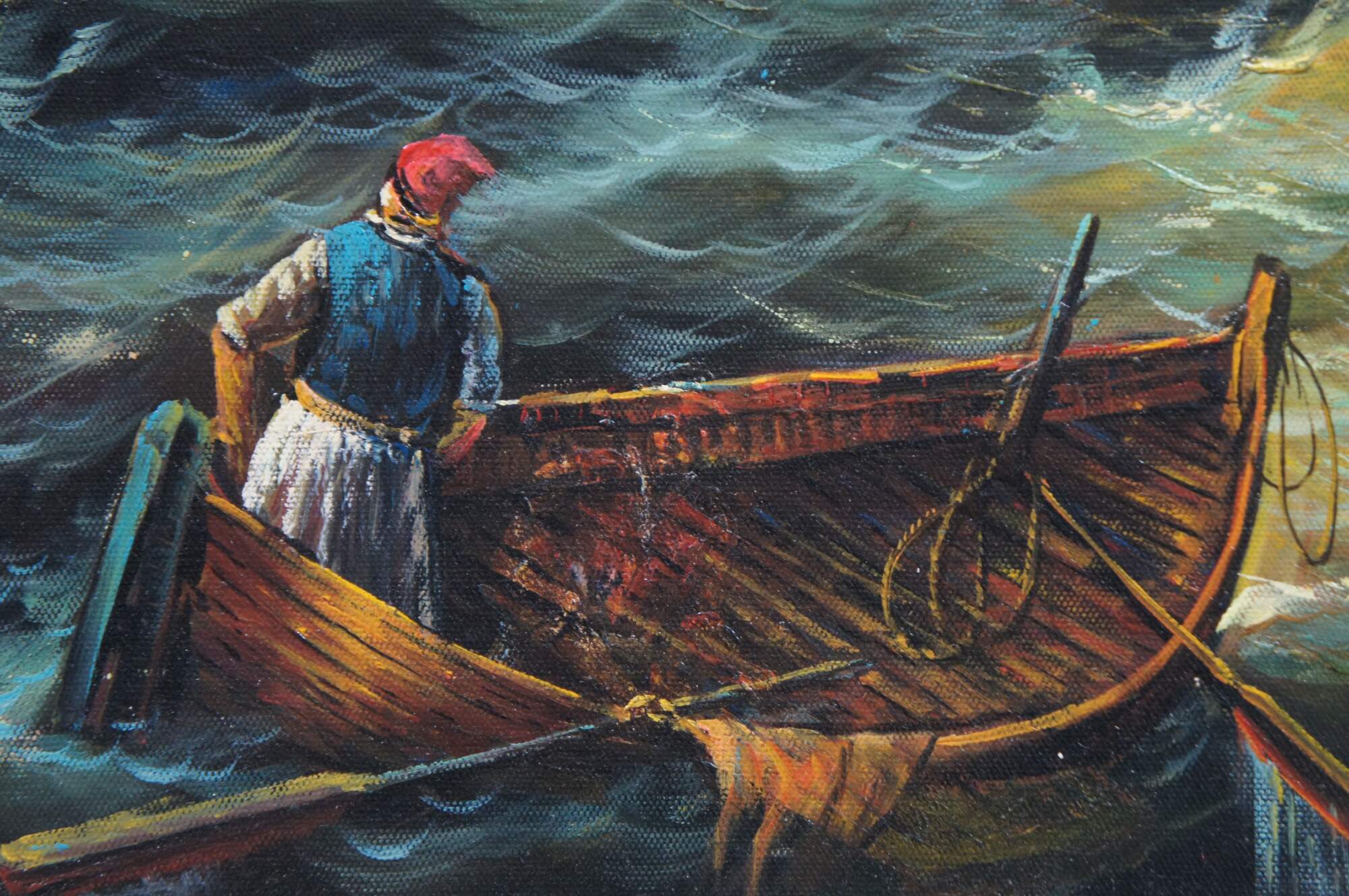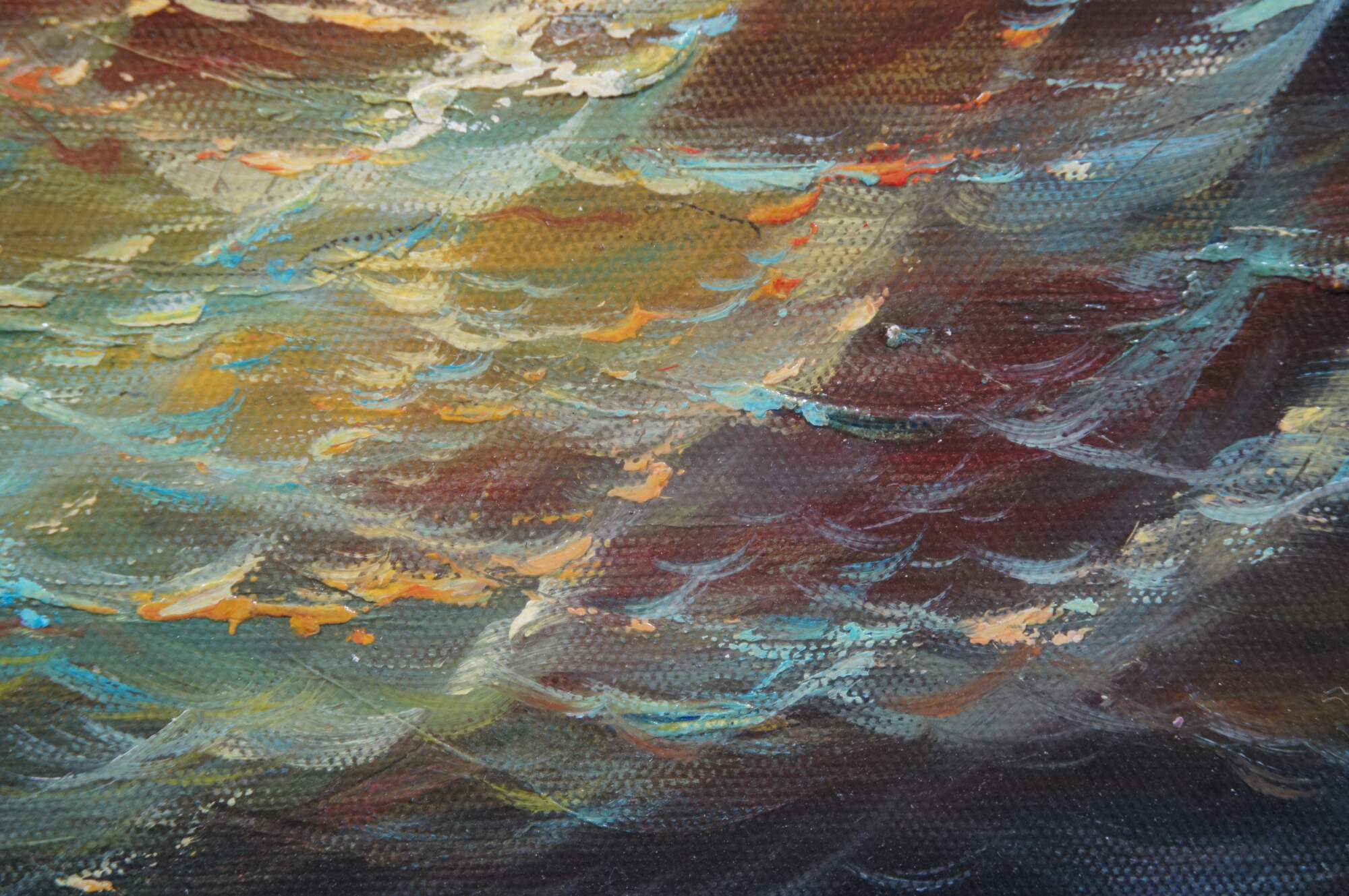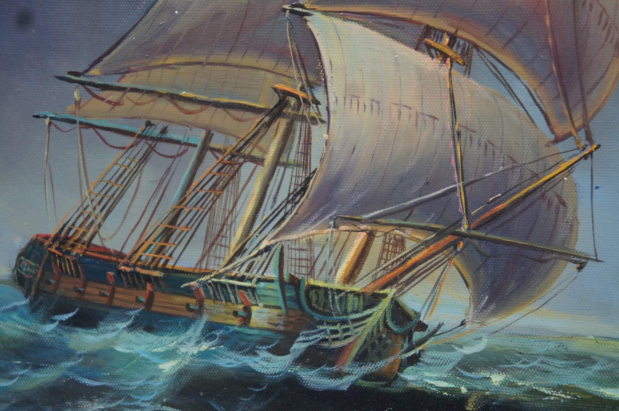 A large and impressive nautical maritime seascape oil painting on canvas depicting The Action of 21 April 1806, After Pierre-Julien Gilbert. The painting showcases a choppy ocean battle scene with a British & French Galleon. Features an ornate baroque gold high relief frame with Neoclassical designs of scrolled acanthus, fleur de lis and shell and cartouche.