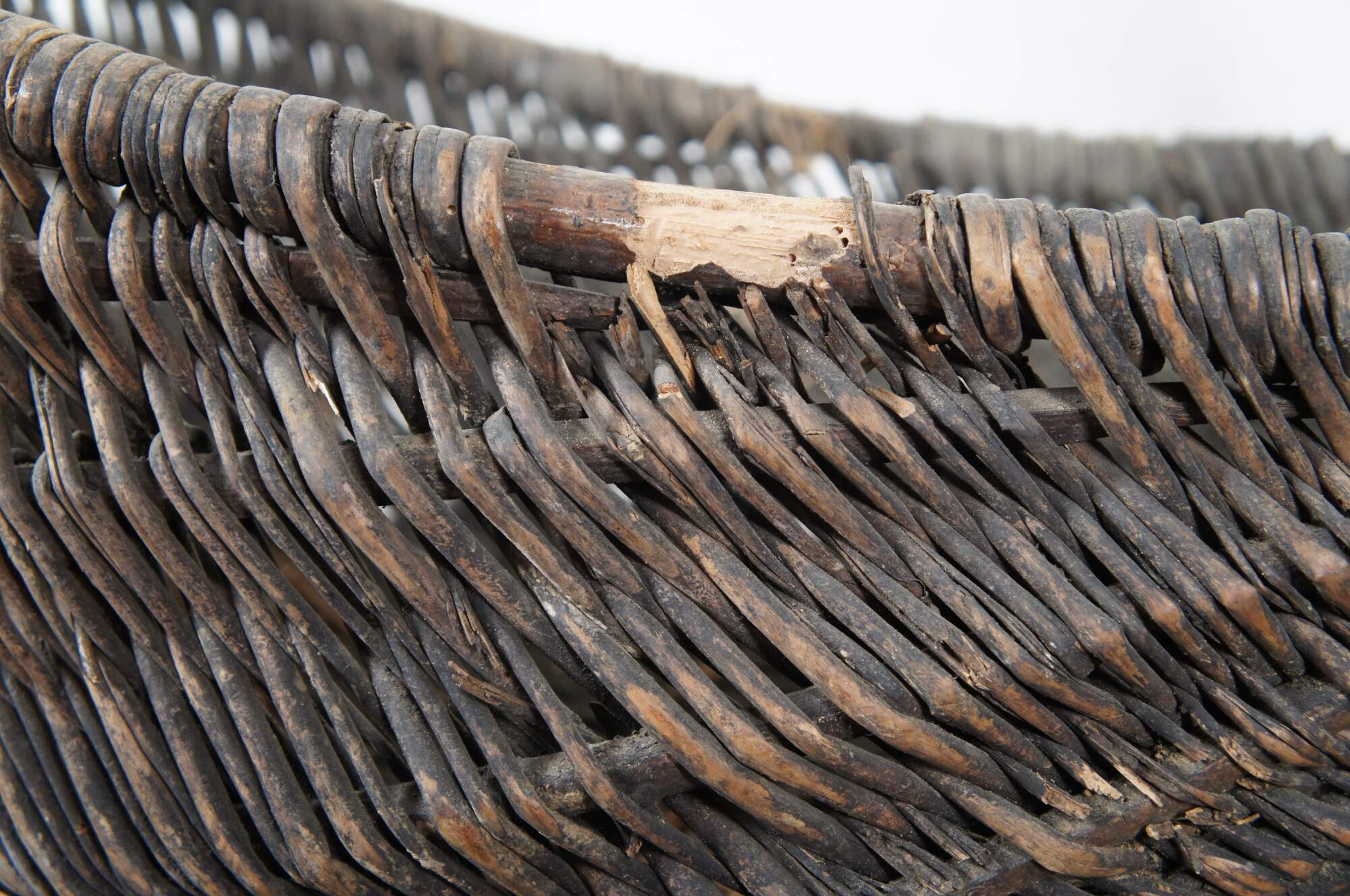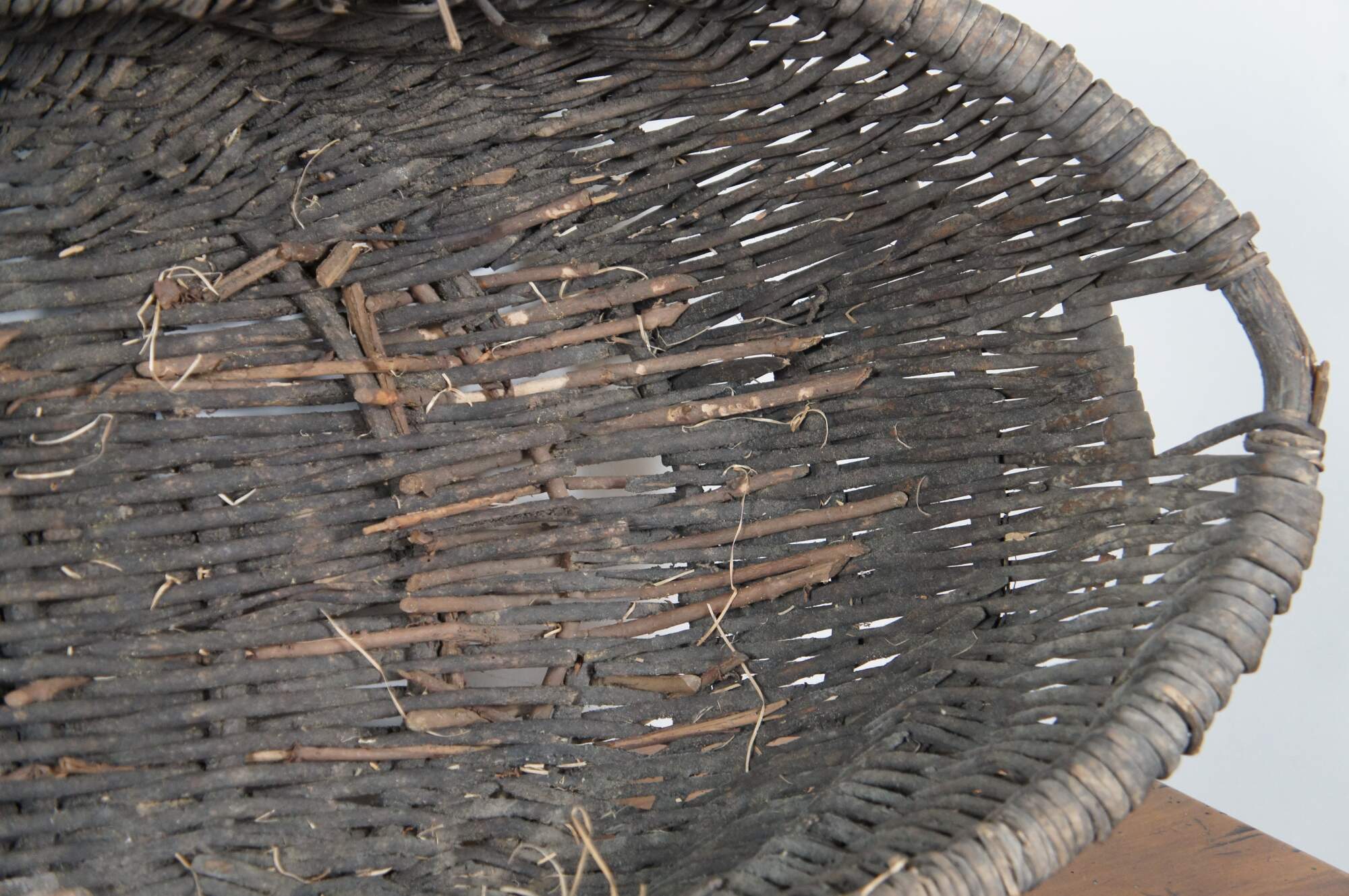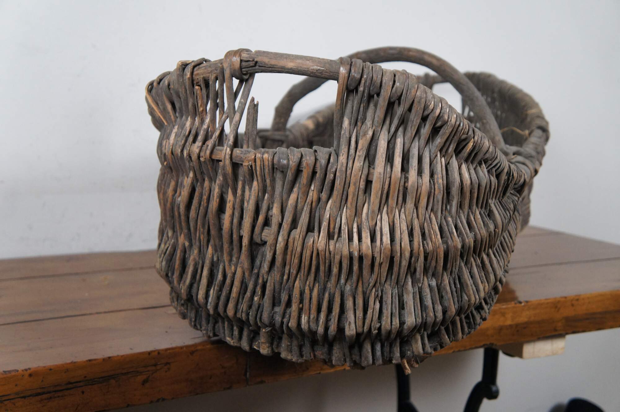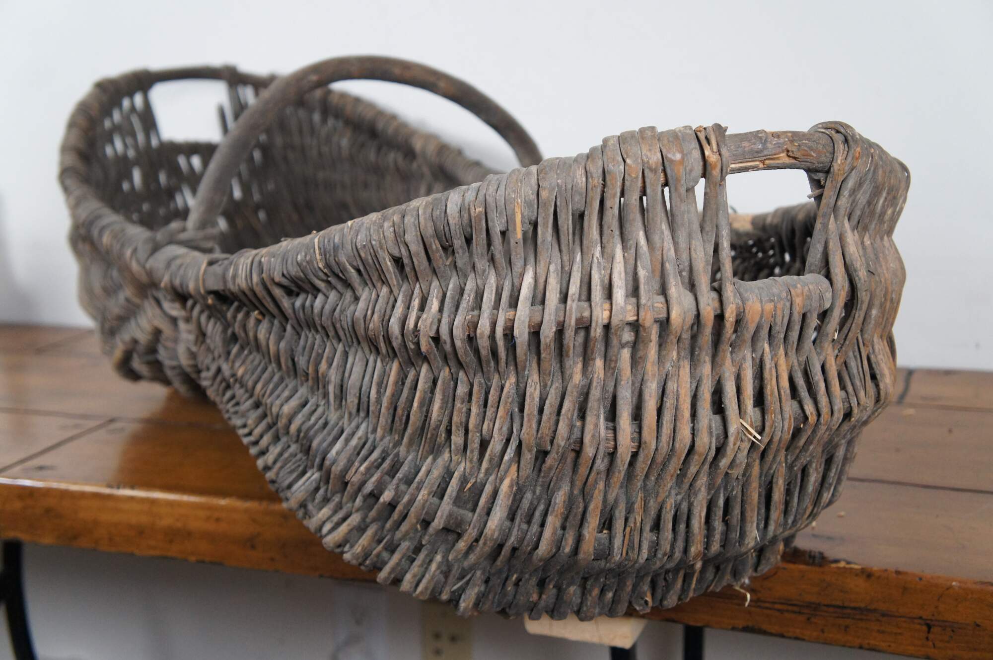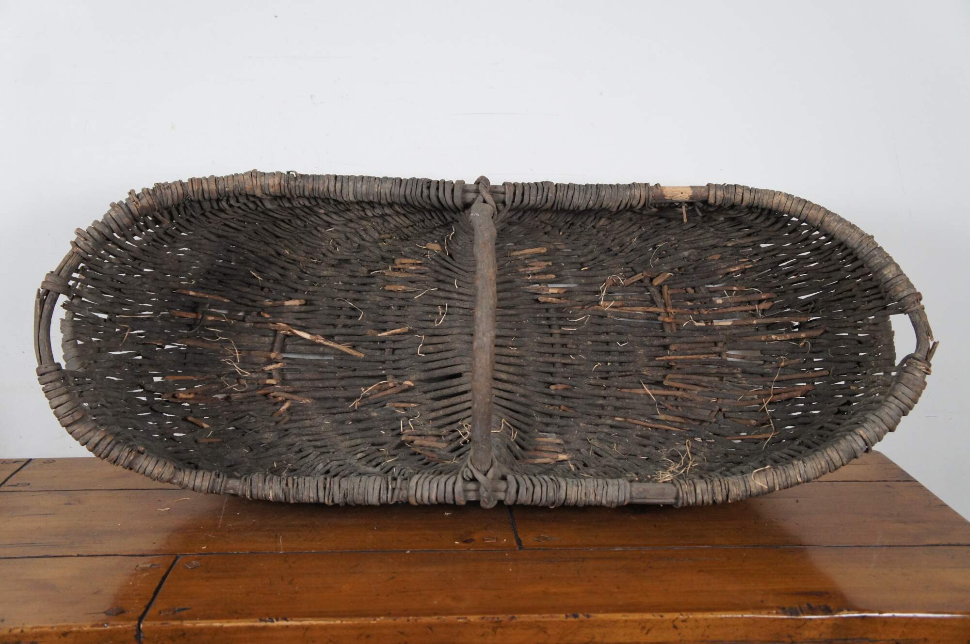 Large and impressive antique grape / wine harvest buttocks basket. Created in the Burgundy region of France circa 19th century, the unique basket made of handwoven wicker is oval in form and features a wooden frame with handle across the top.