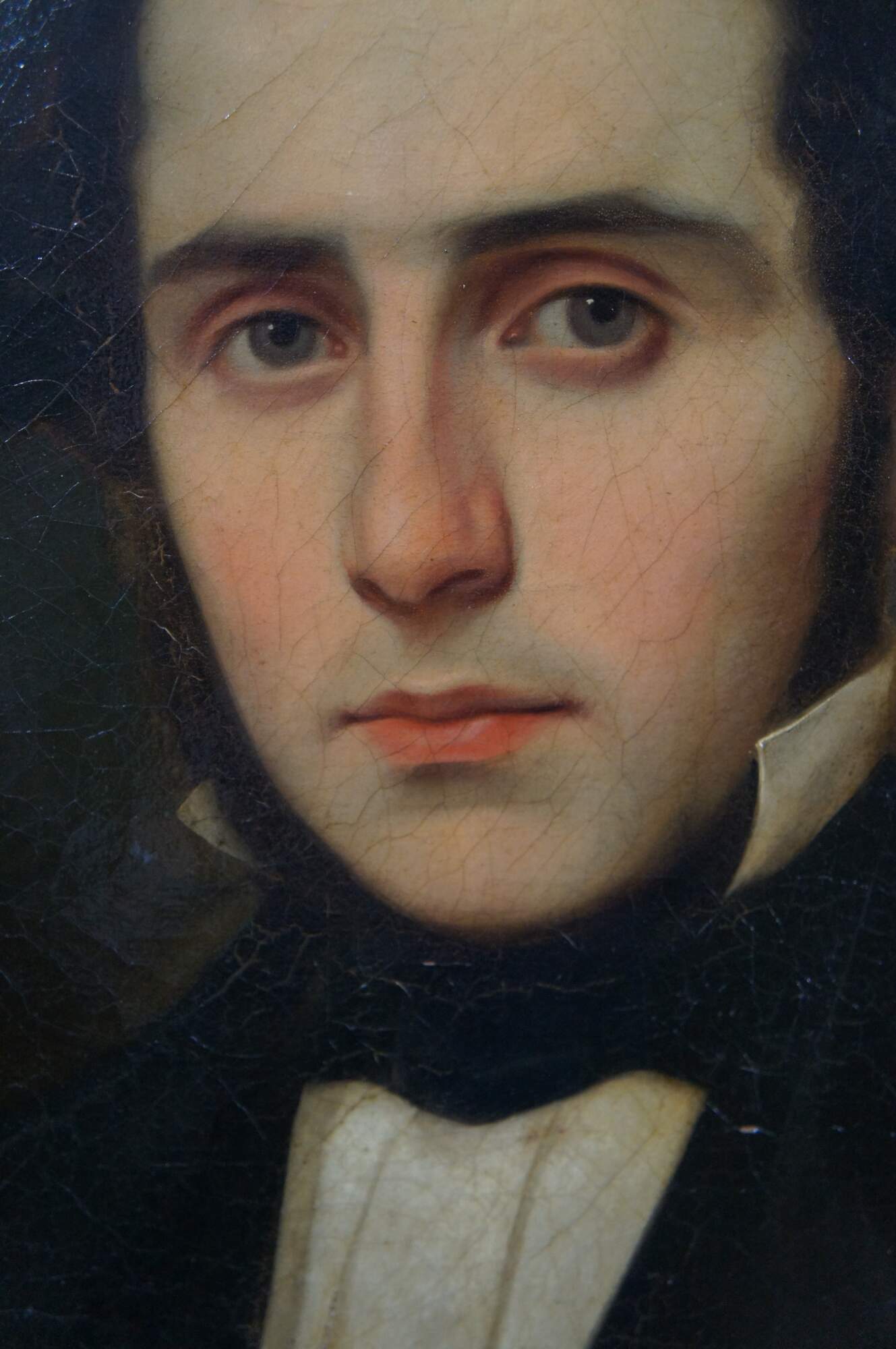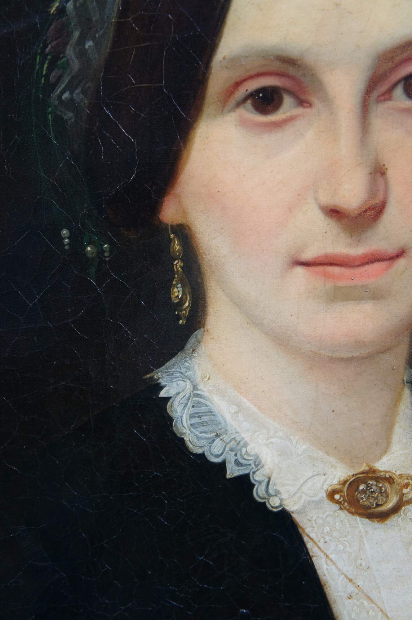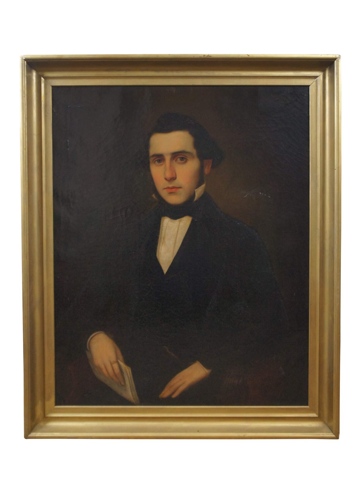 Antique pair of 19th century American School Folk Art oil painting. Features a man and woman (husband and wife) in formal Victorian attire. The man holds a document, while the woman sits delicately with her hands cupped, displaying her Art Nouveau jewelry, encrusted with turquois, rubies and diamonds. Framed in gold.