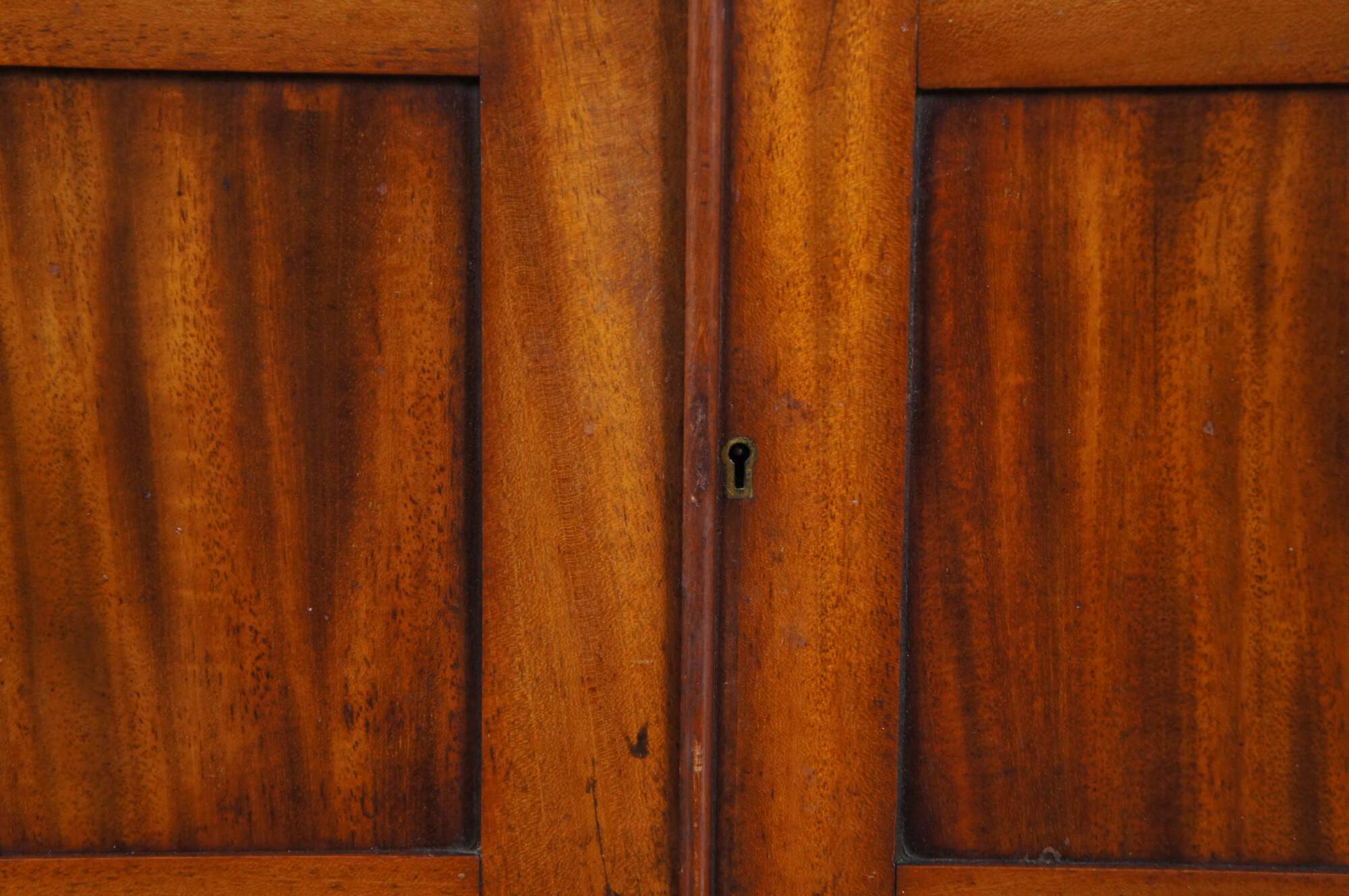 Antique mahogany wall hanging whatnot cabinet featuring a two tier design with paneled doors below a shelf framed with turned columns. Hand operated latch on left hand door.