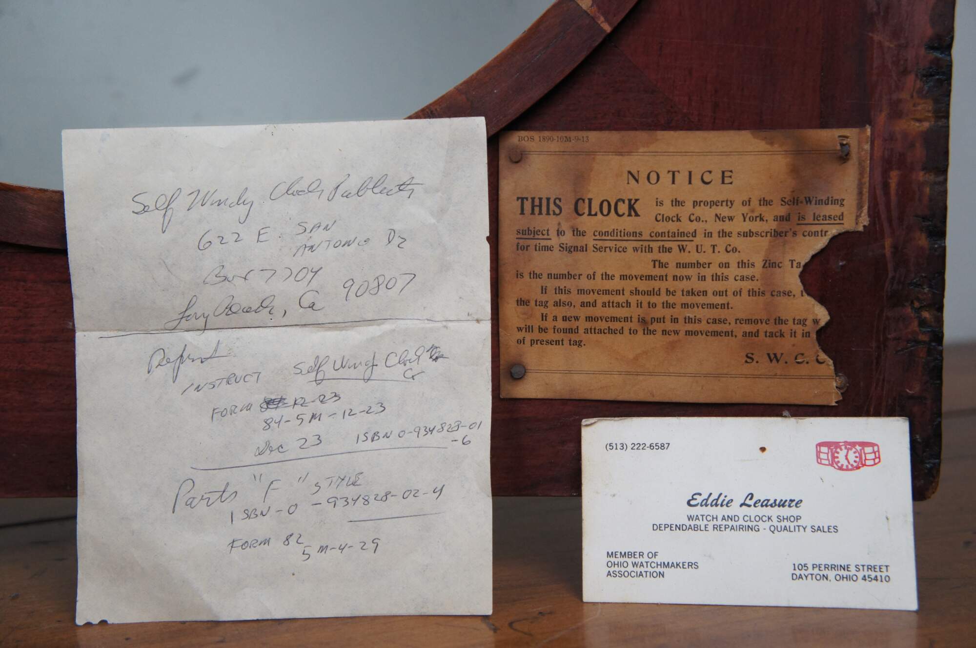 "The Self Winding Clock Company (SWCC) of New York began business in 1886 marketing their own electro-mechanical clocks based on the 1884 electro-mechanical clock patent of one of the company founders, Chester Pond (1844-1912). The innovative principle of this clock mechanism was the incorporation of a small electric winding motor that automatically rewound the mainspring after the clock ran for one hour. The clocks were powered by batteries. The batteries would last at least one year. By being automatically rewound each hour, the strain on the mechanism was kept to a minimum, resulting in a very accurate timepiece. At about the same time SWCC began selling clocks, Pond was developing an electro-mechanical synchronizer attached to the clock movement that could synchronize the clock hands to an accurate time source. The synchronization occurs when a remote, precisely timed, electrical impulse is sent via wires connected to the individual clocks. By 1887 the synchronizers had been so improved that the Self Winding Clock Company could not only market individual clocks but also sell entire synchronized clock systems. By the 1960’s the days of individual elegant mechanical timepieces and synchronized time systems were over. SWCC ceased operations in the late 1960’s. All company records and inventories were relegated to the trash pile.